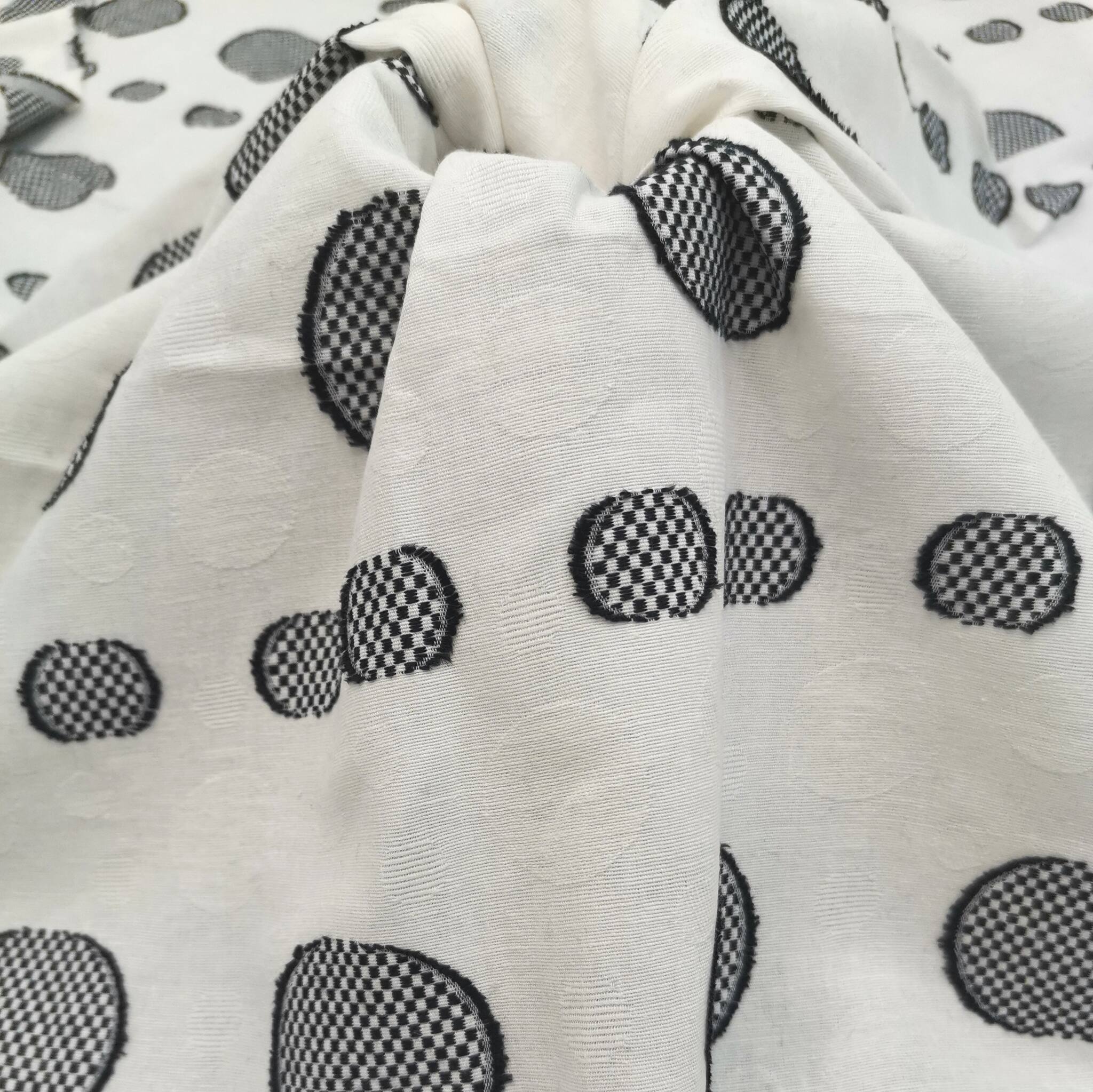 SIS woven blended jacquard cutting fabric, selected 73% cotton, 11% polyester, 16% hemp natural blend material, combined with woven technology and three-dimensional jacquard cutting design, to create a distinct layer of "big and small circle" texture. The soft and breathable cotton, the natural crisp of hemp and the wear-resistant and anti-wrinkle of polyester are perfectly integrated, which not only retains the natural texture, but also improves the practical performance, giving the fabric unique artistic expression and functionality.