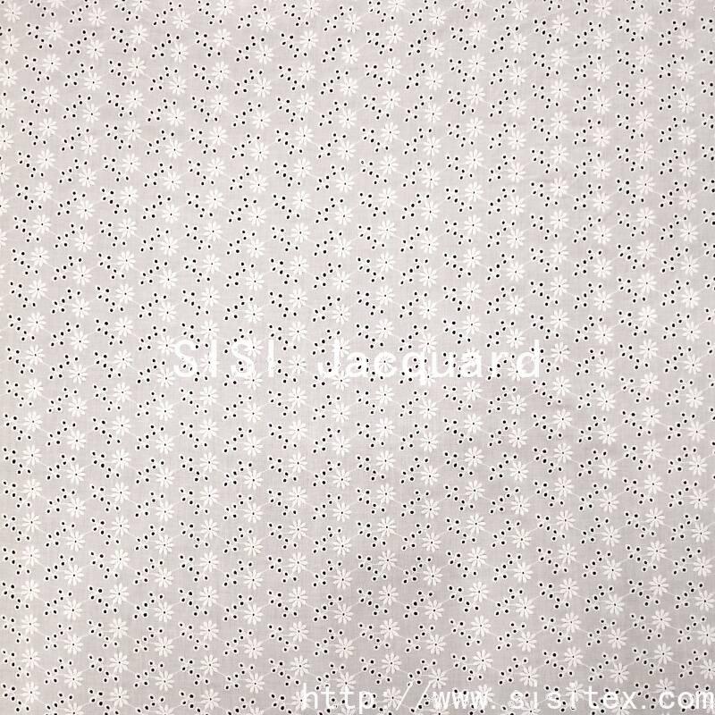 This fabric is made of 100% combed cotton (JC60×JC60) and is woven through a meticulous镂空 embroidery technique, creating a brilliant and cheerful sunflower pattern. The embroidery holes are fine and orderly, the flower shape is full and lively, forming a transparent and three-dimensional texture, as if sunlight is penetrating the petals. The fabric is soft and comfortable to the skin, with cotton fibers providing excellent breathability and comfort. The overall style is vibrant and fresh, full of natural vitality and the warmth of craftsmanship. It is suitable for creating summer dresses, shirts, and bright home accessories.