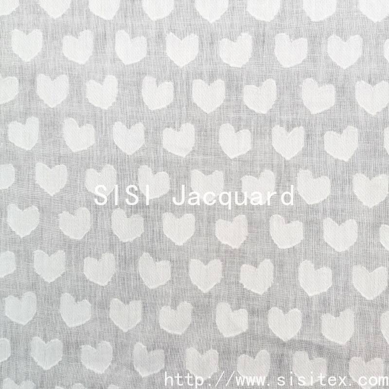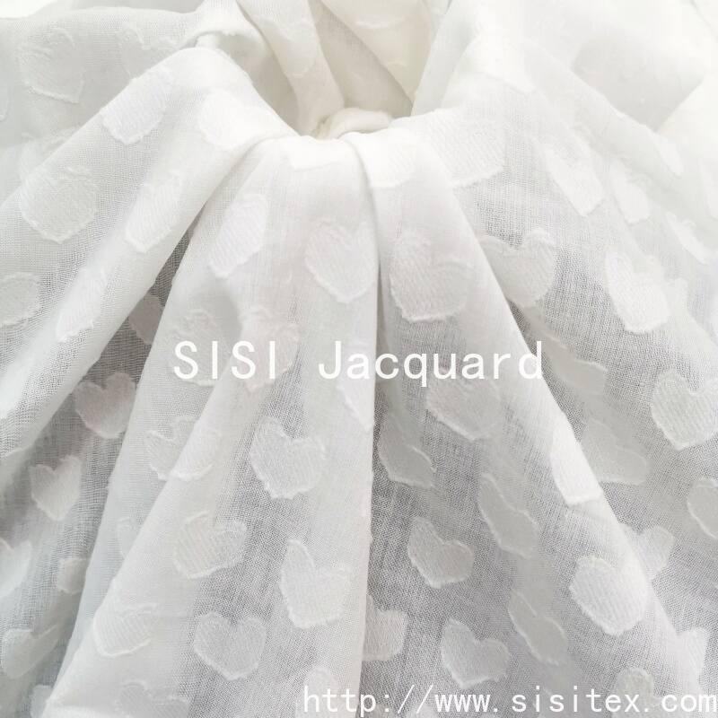 This fabric is made of 100% cotton as the base. Through a precise jacquard weaving process, it presents a three-dimensional heart pattern on the surface of the fabric, with clear and full texture. The unique embroidery design creates a faintly visible hollow effect around the heart pattern, enhancing the transparency and lightness of the fabric. The cotton material retains the natural softness and breathability of the fabric, while the combination of the heart jacquard and the embroidery adds a romantic and sweet atmosphere as well as a delicate craftsmanship to the fabric. As the light and shadow shift, the heart pattern appears and disappears, combining the softness of cotton with the structure of the jacquard, making it an ideal choice for creating sweet and fashionable items in the spring and summer seasons.