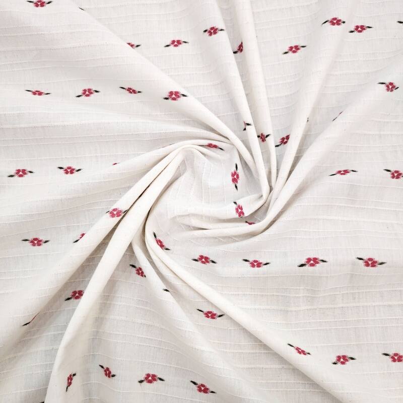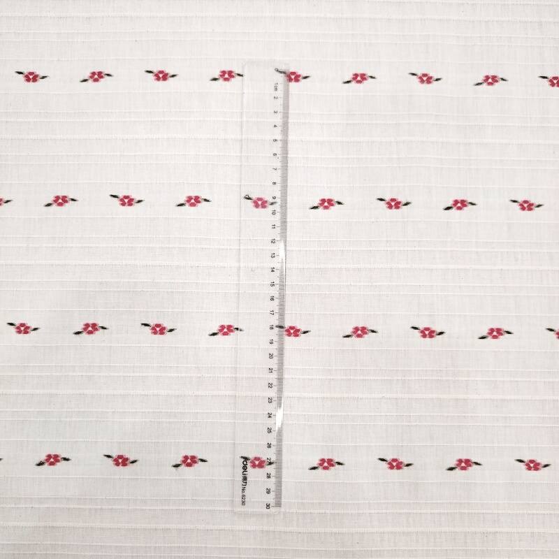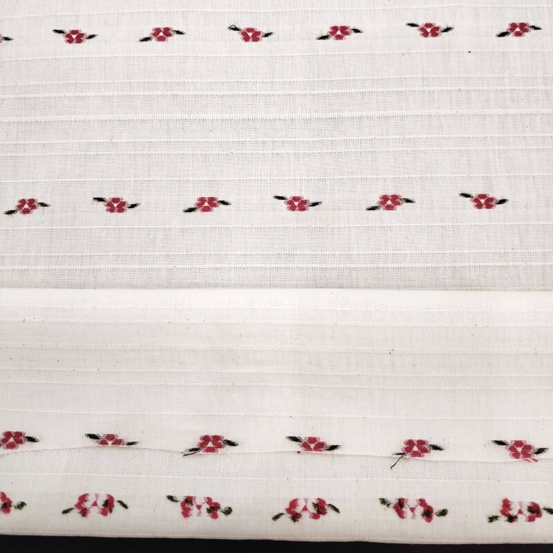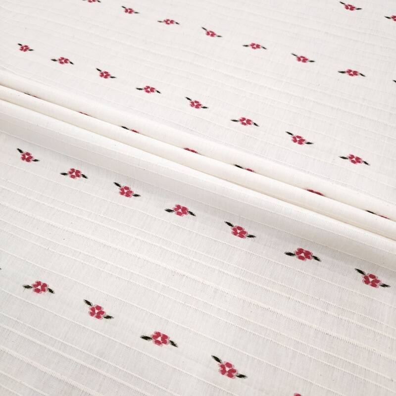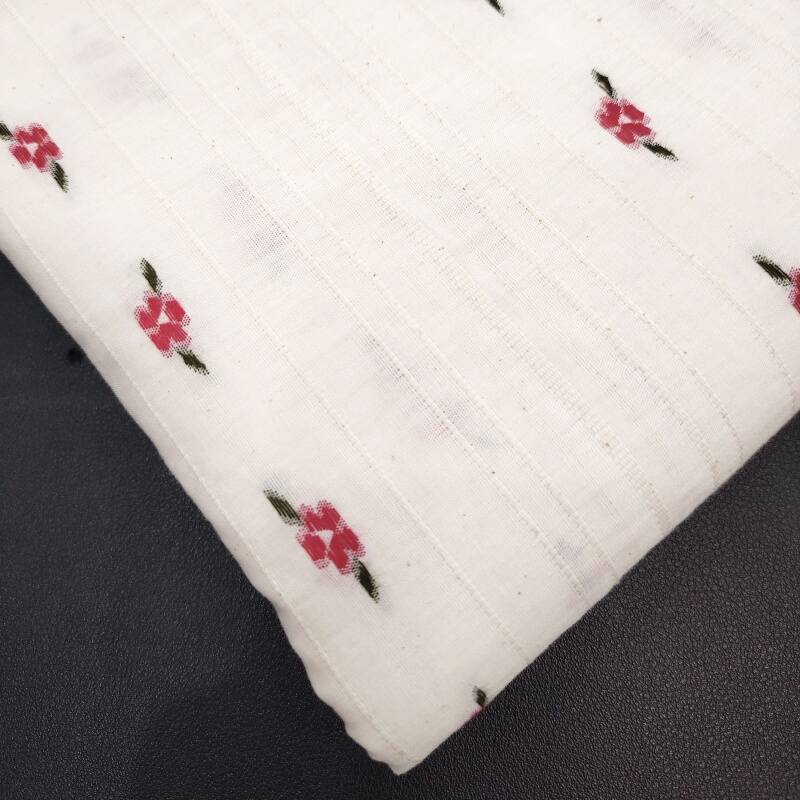 On the calm wine-red base fabric, white, light apricot and pale pink flowers bloom in a horizontal rhythm one after another. The weaving technique makes the boundaries between the flowers and the base clear and crisp, and the horizontal texture adds order to the flowers, with a slight sheen on the raised and recessed areas of the jacquard.