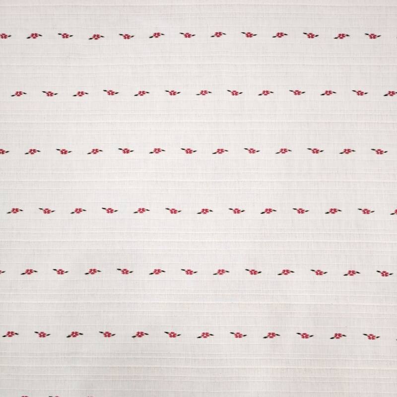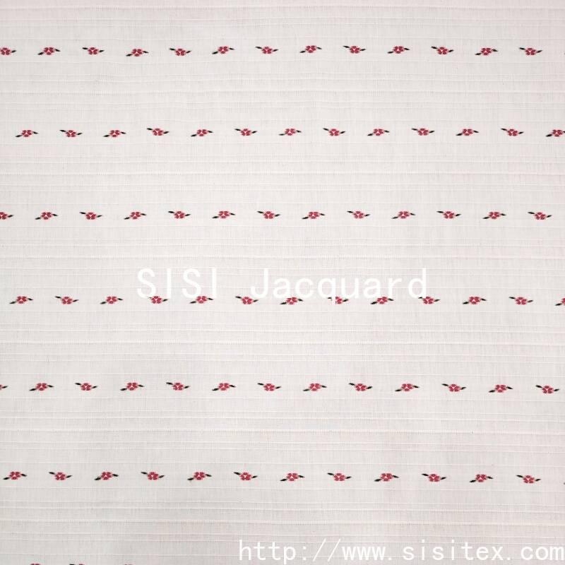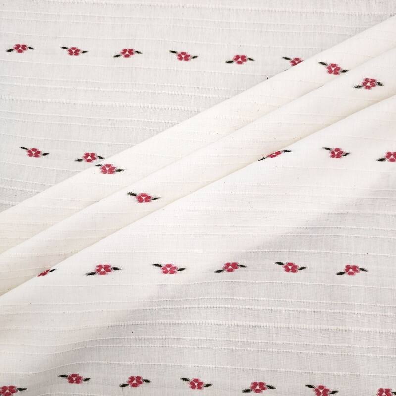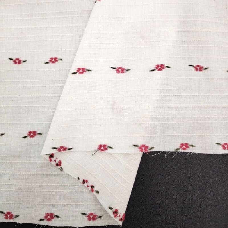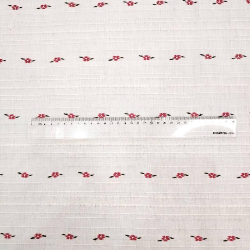 On the calm wine-red base fabric, white, light apricot and pale pink flowers bloom in a horizontal rhythm one after another. The weaving technique makes the boundaries between the flowers and the base clear and crisp, and the horizontal texture adds order to the flowers, with a slight sheen on the raised and recessed areas of the jacquard.