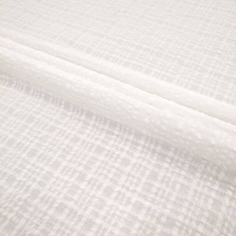 On the milky white fabric, both the grids and the bubbles are growing simultaneously. The cationic yarn gives each grid a subtle depth of light and shadow, as if sunlight is falling on rough paper.