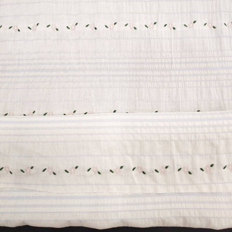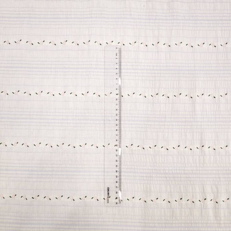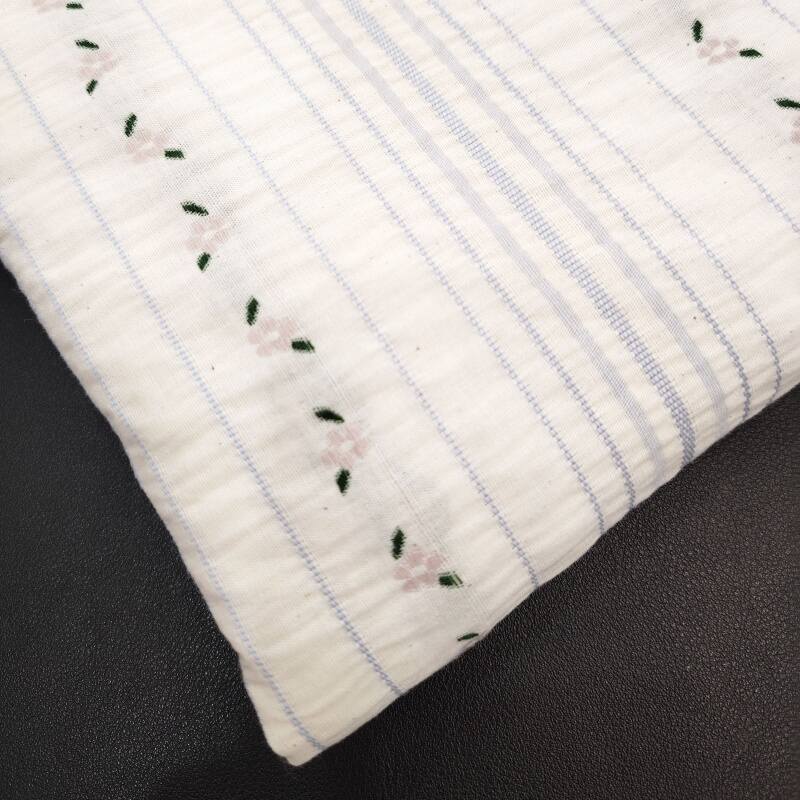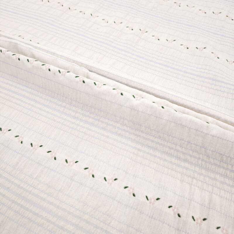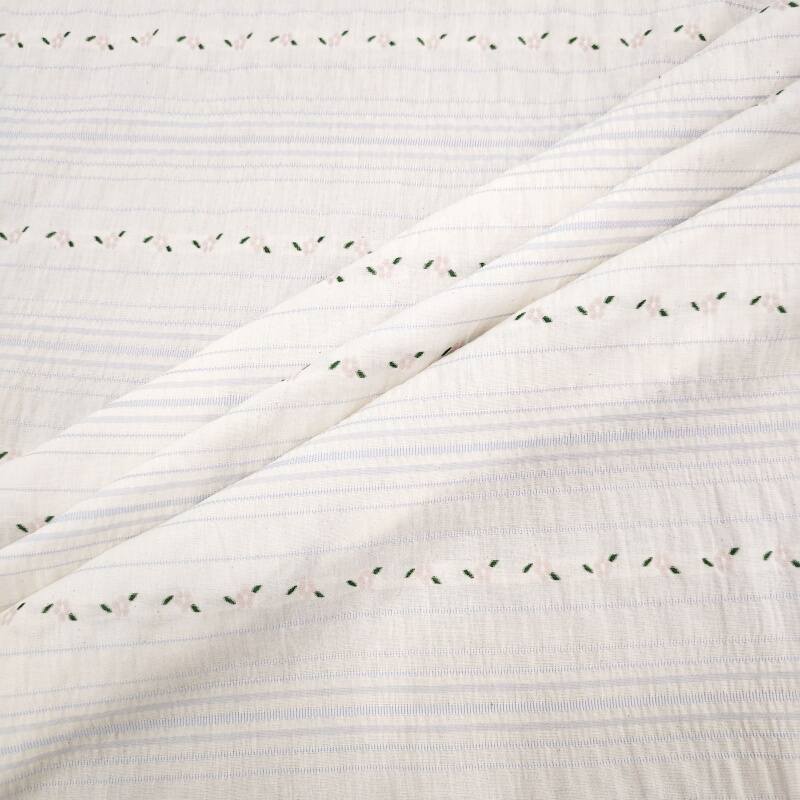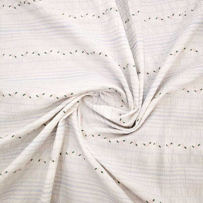 This fabric is produced using the weave technique. The yarn is first dyed and then woven. The boundary between the light white background and the light brown stripes is neat and clear. Even after washing, the stripes remain distinct without any smudging or blurring.