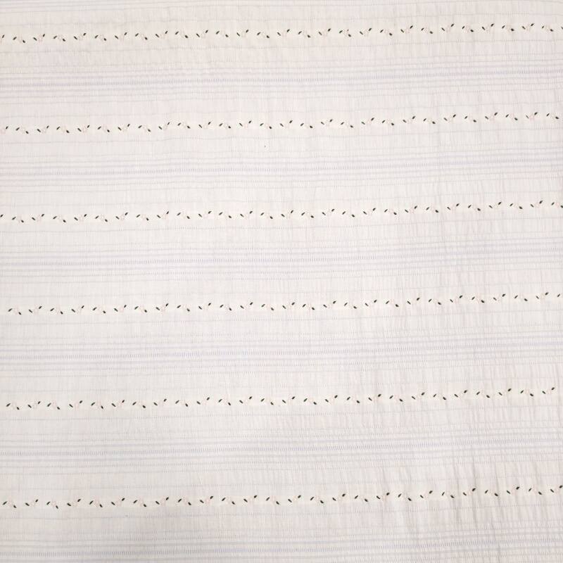On the light white base fabric, there are rows of pale khaki horizontal stripes arranged neatly. From a distance, it looks like a clean striped shirt fabric. But when you look closely, you can feel the raised and recessed texture of the jacquard weave - it wasn't printed on, but woven.