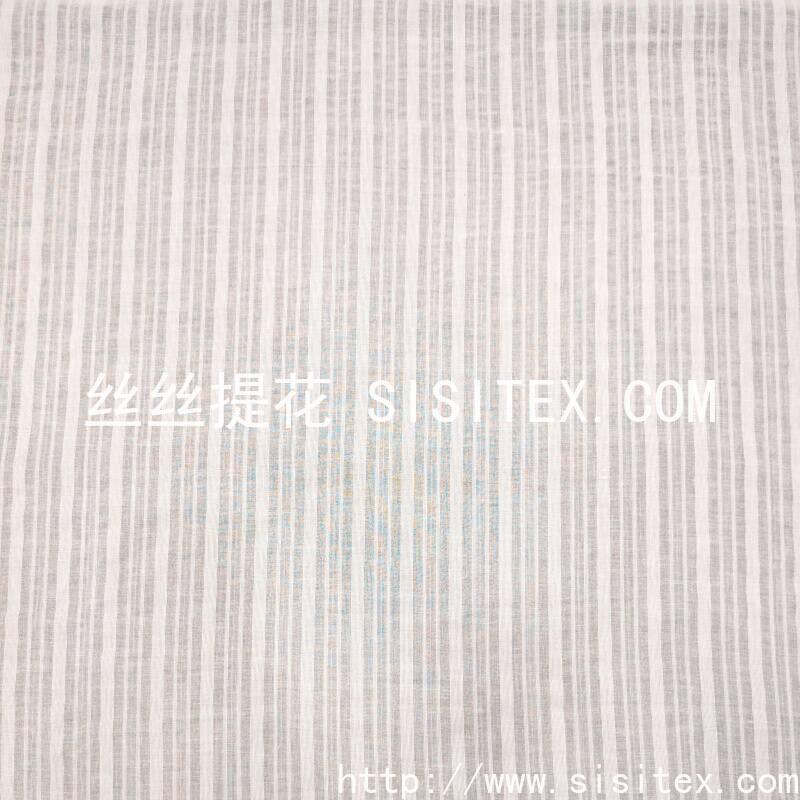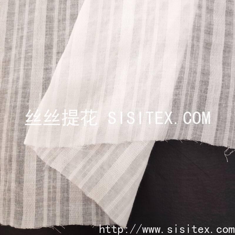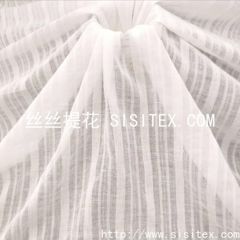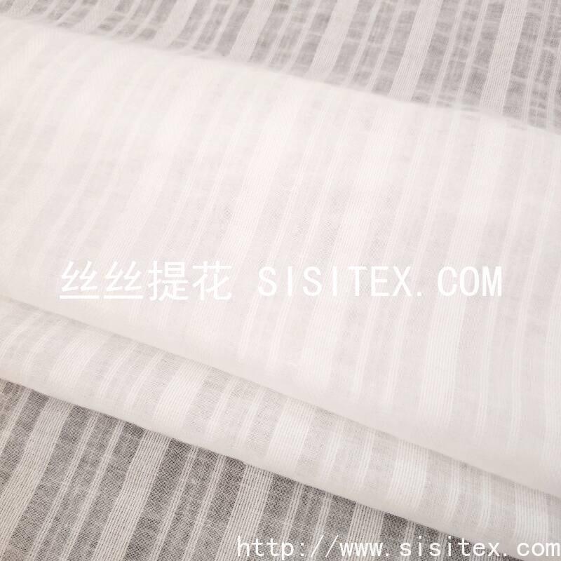 这款春夏全棉纱罗条纹提花面料采用100%精梳棉纱织造,结合传统纱罗织法与条纹提花工艺,形成轻盈通透的肌理与纵向条纹图案。面料采用疏松结构(密度60×60),质地超薄柔软,透气性极佳,兼具棉的天然亲肤与纱罗特有的微皱垂坠感。纯棉材质触感清爽,条纹与纱罗纹理交织出细腻层次,整体风格自然呼吸、轻盈灵动,适合打造春夏轻薄透气服饰与清新家居布艺。