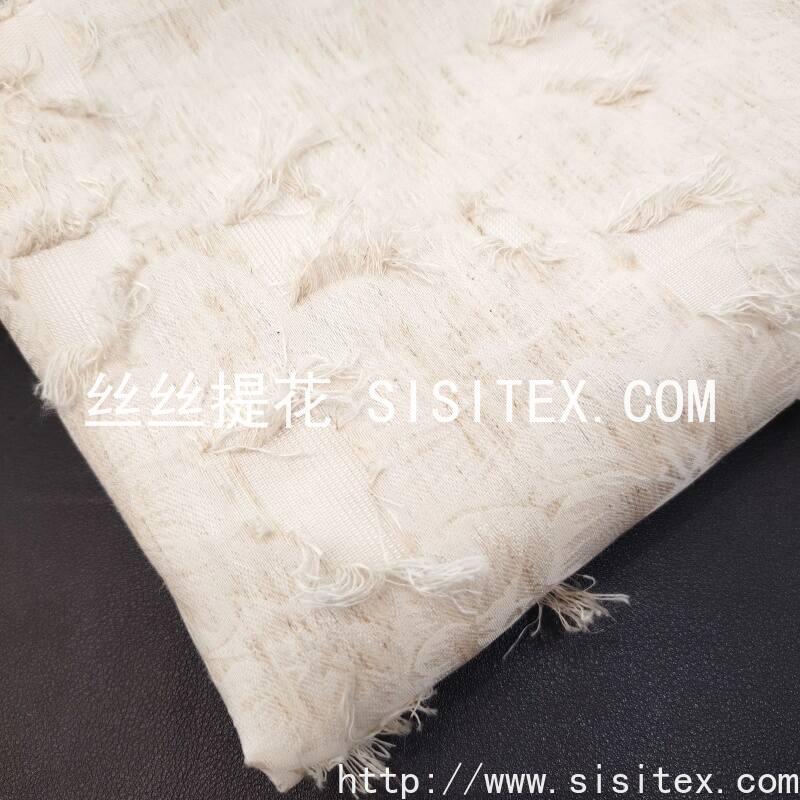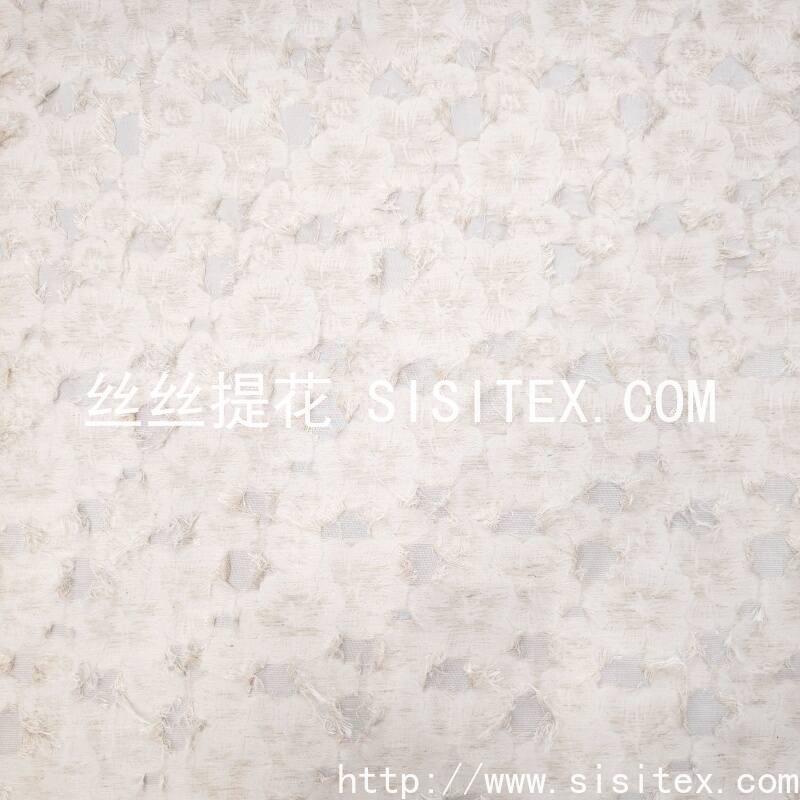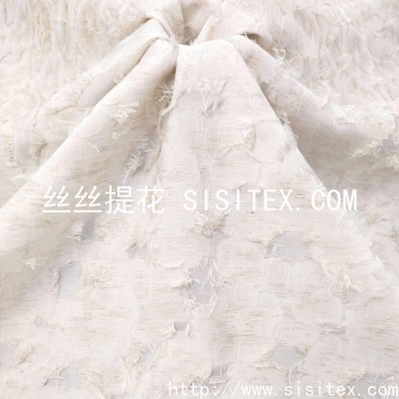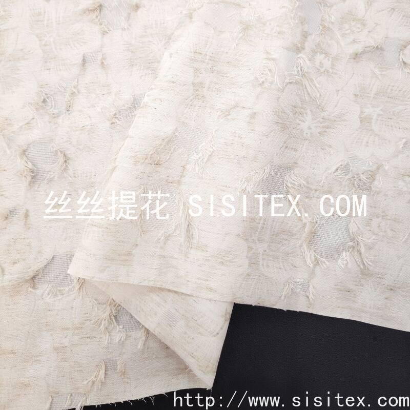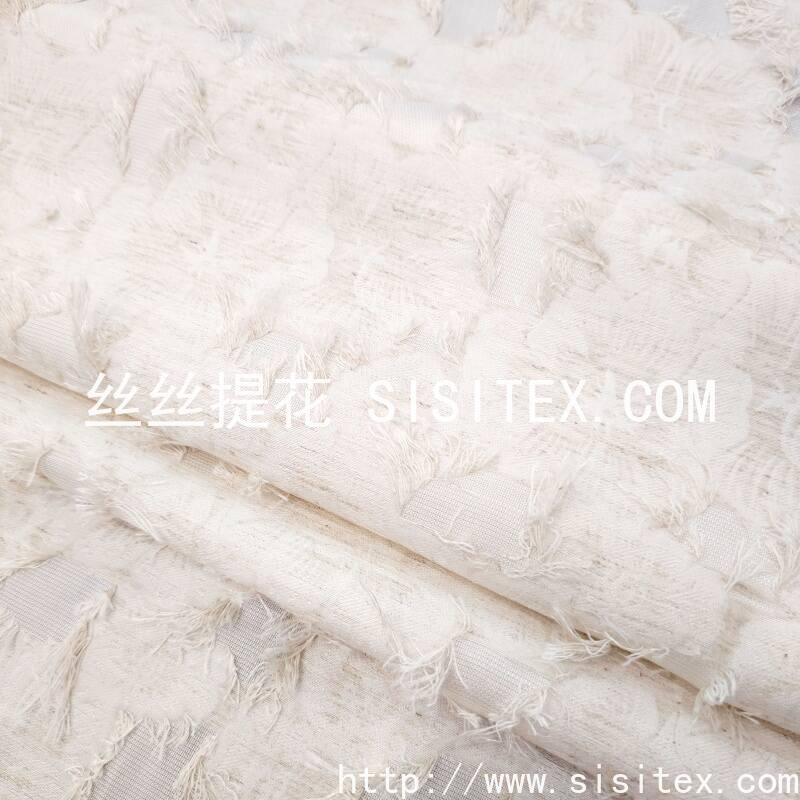 本款面料采用多元化天然纤维混纺(38%人丝+25%天丝+26%粘胶+11%麻),结合提花剪花工艺,呈现出立体花朵与自然流苏毛边纹理。面料克重198g/㎡,幅宽145cm,质地厚实且富有肌理感,麻质成分带来质朴本色与自然挺括度,整体风格兼具原始手工艺气息与现代设计语言,适用于打造具有艺术感与自然风格的服饰与家居作品。