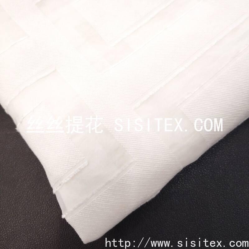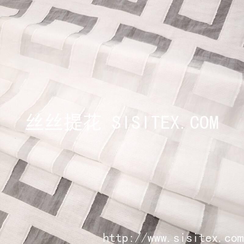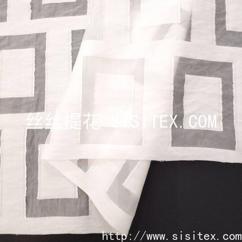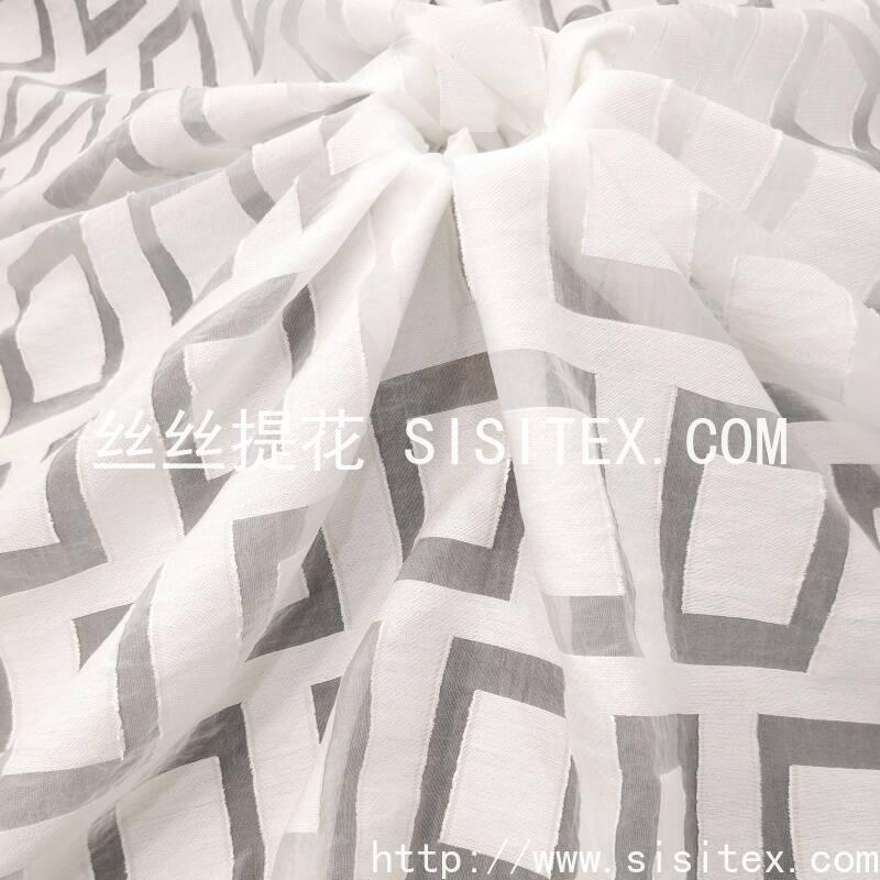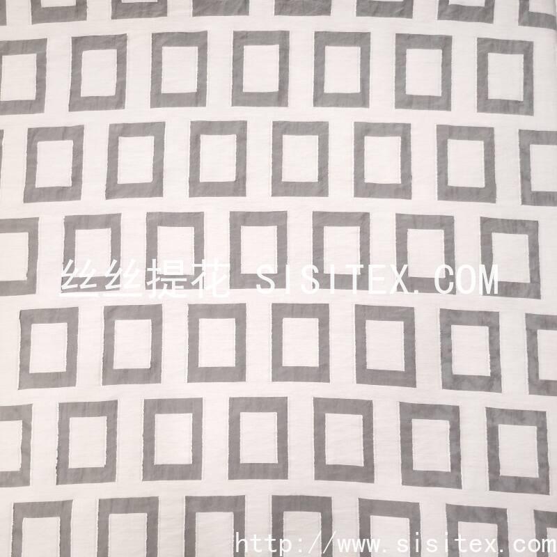 本款面料采用64%人棉与36%锦纶混纺织造,通过提花与剪花工艺,打造出立体感强、透气性佳的欧根纱式大方格镂空纹理。面料克重103g/㎡,幅宽145cm,质地轻薄且带有一定挺括度,方格结构清晰,镂空部分自然透肤,整体风格兼具朦胧美感与现代几何感,适用于打造具有空气感与层次设计的时尚单品。