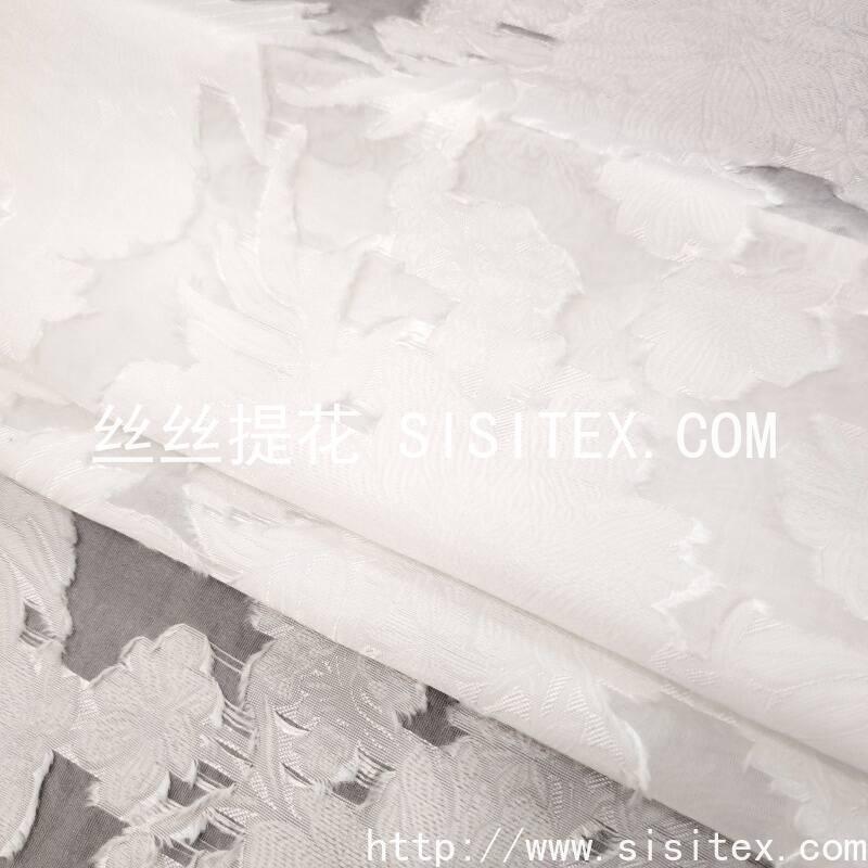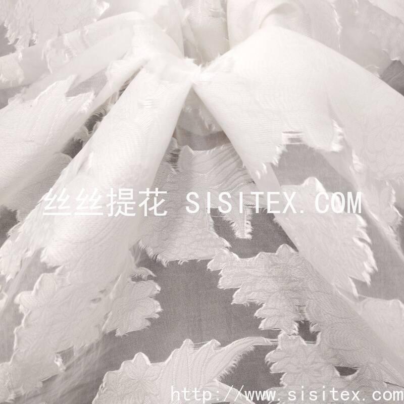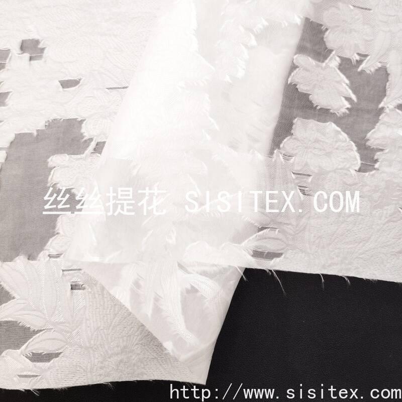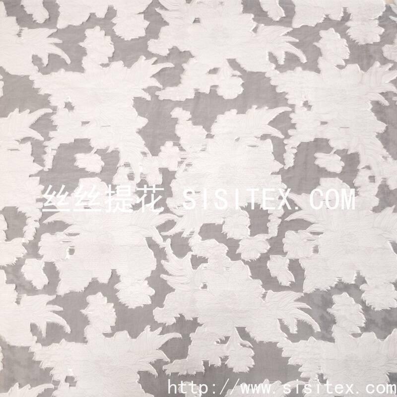 本款面料采用60%人丝与40%锦纶混纺,结合大提花与剪花工艺,打造出立体浮雕感的花朵图案,整体呈现轻盈半透明质感。面料克重仅90g/㎡,幅宽145cm,质地柔软飘逸,花朵纹理清晰凸起,配合若隐若现的透视效果,风格浪漫优雅,适合打造春夏季节的轻盈层次穿搭与精致装饰作品。