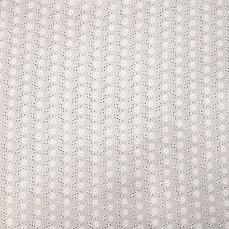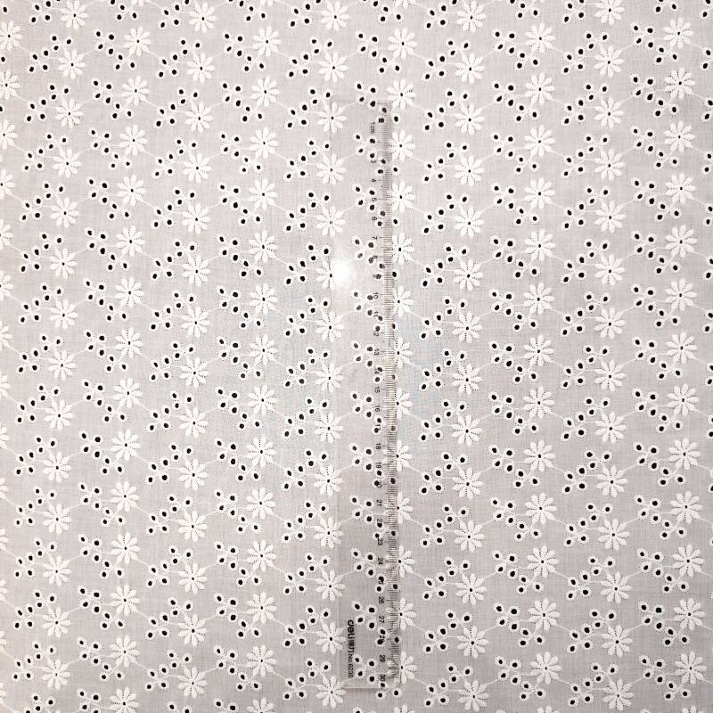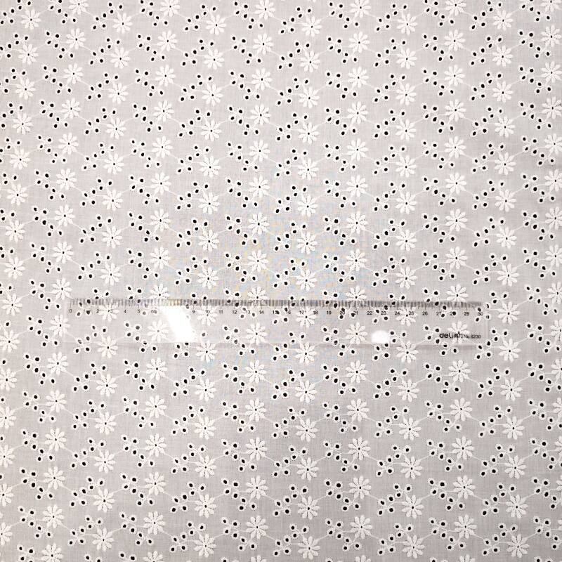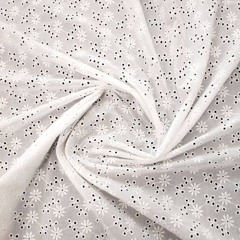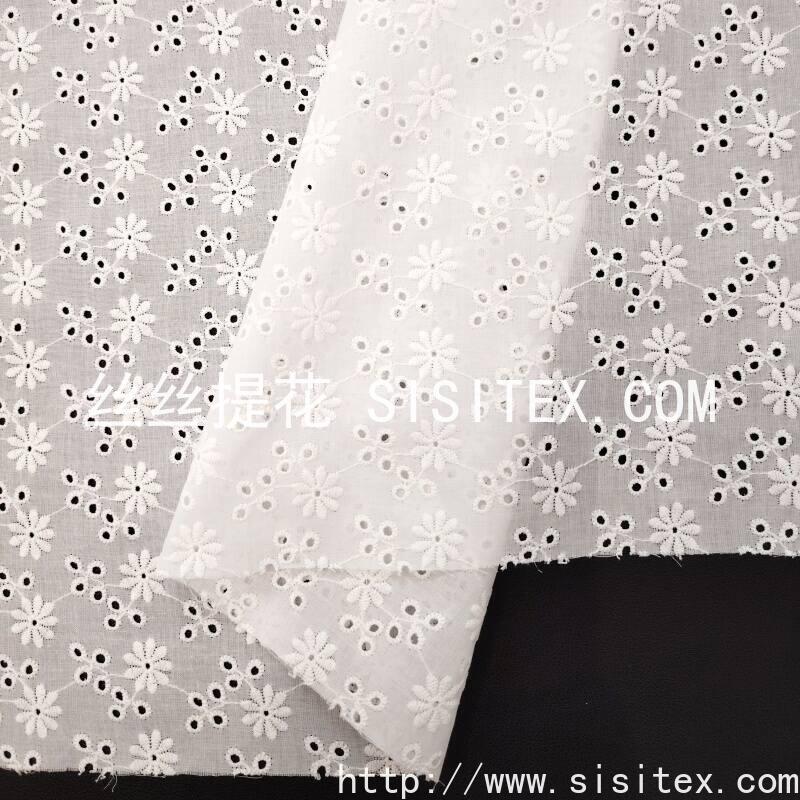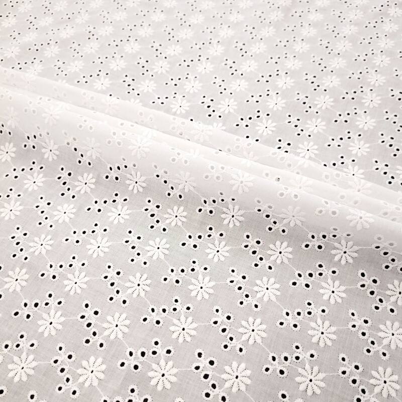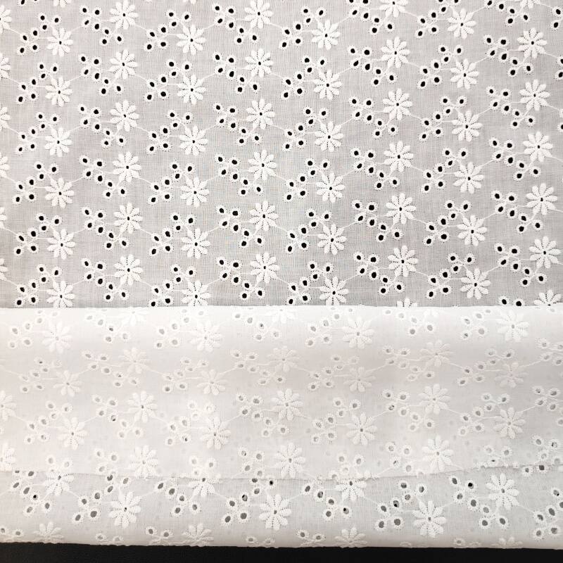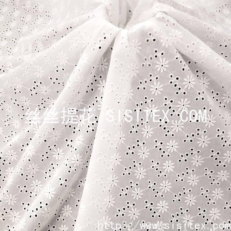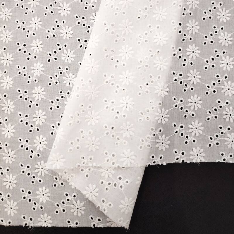 本款面料采用100%精梳棉(JC60×JC60)织造,通过精细镂空绣工艺,绣制出灿烂明媚的太阳花图案。绣花孔洞细腻有序,花型饱满生动,形成通透立体的透肌纹理,宛如阳光穿透花瓣。面料质地柔软亲肤,棉纤维带来优越的透气性与舒适度,整体风格活力清新,充满自然生机与手工艺温度,适合打造春夏连衣裙、衬衫及明媚家居饰品。