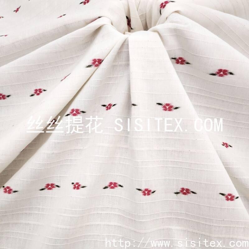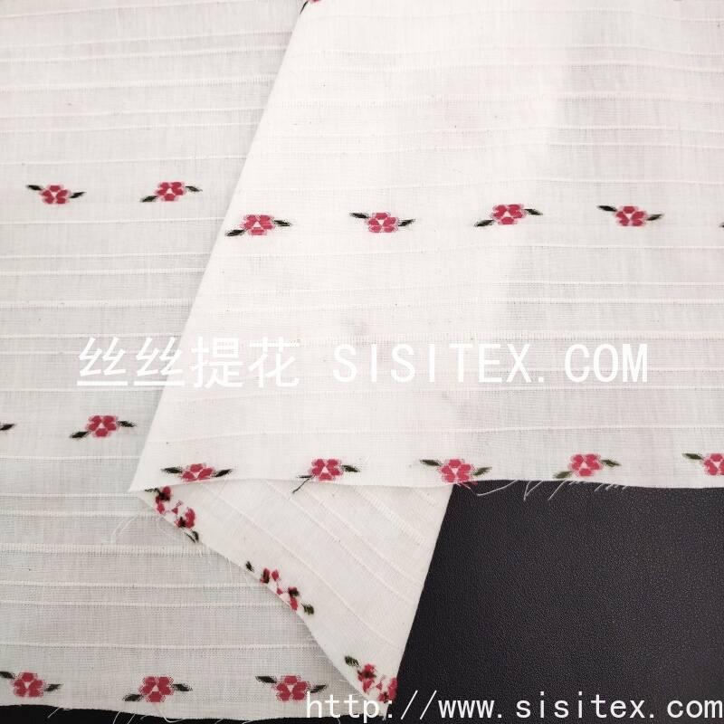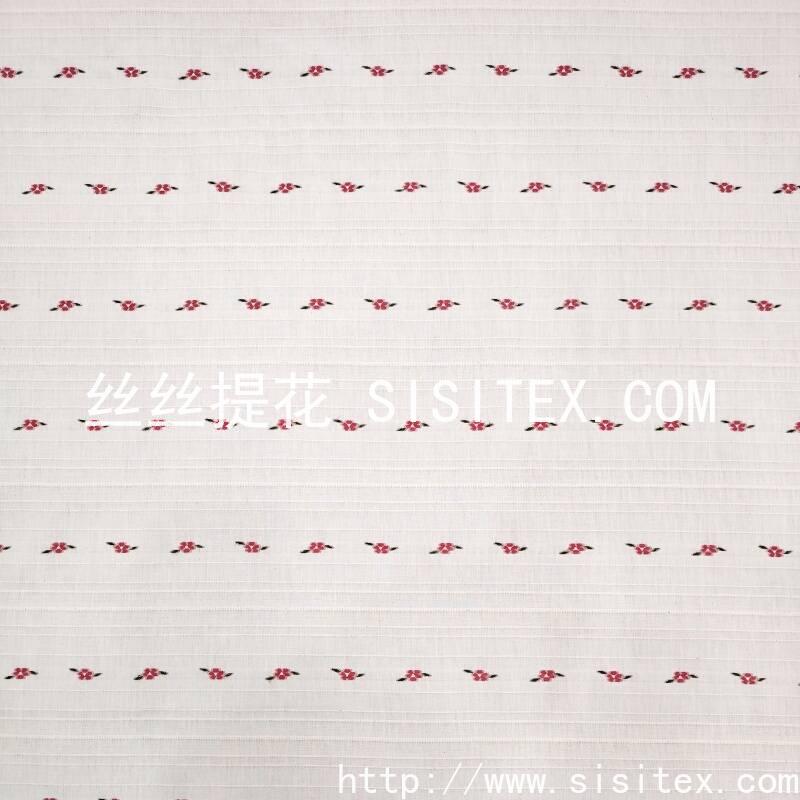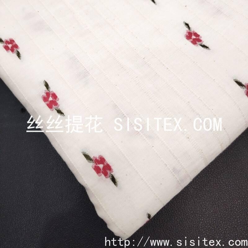 在横纹底组织的结构上叠加提花花型,既有布面横向细条的秩序感,又有花卉的柔美,视觉与触感均丰富。