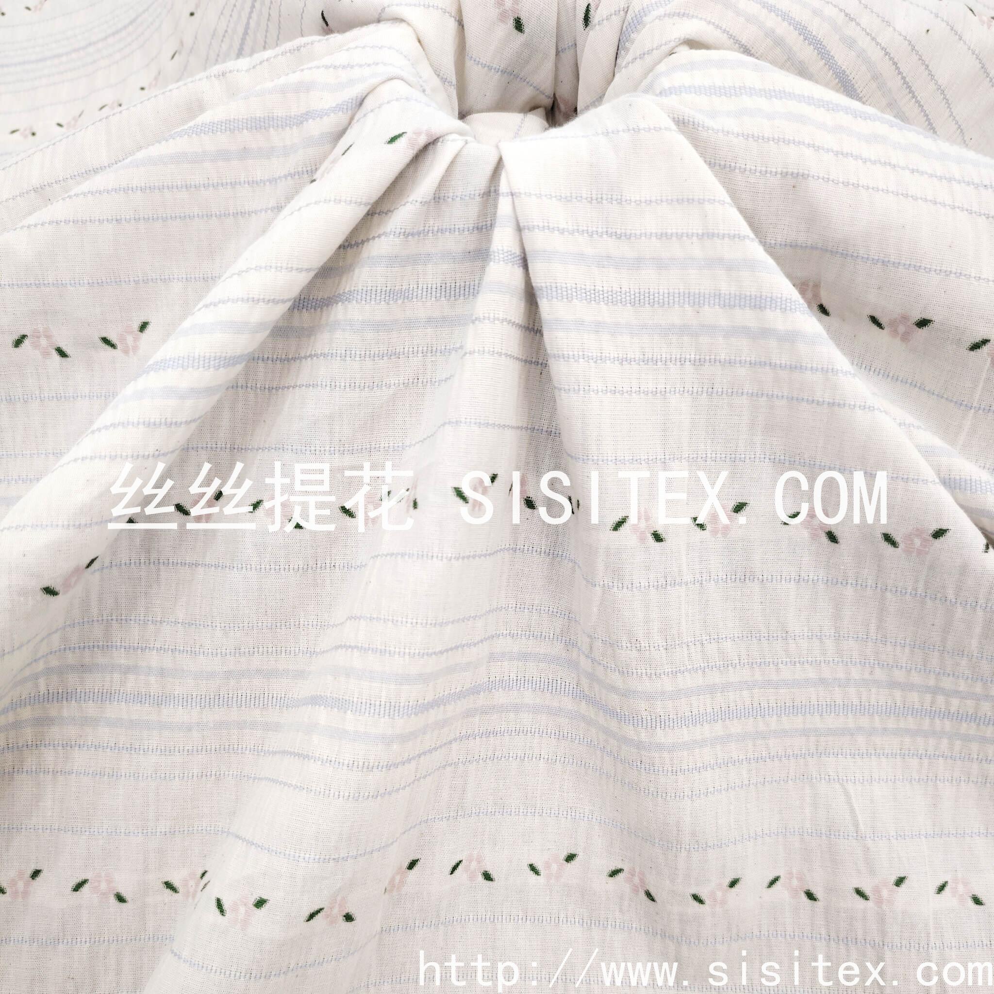 米白色的底布上,浅卡其色的横纹一条条排开。远看是干净的条纹衬衫布,近看才能摸到提花的凹凸纹理——它不是印上去的,是织出来的。