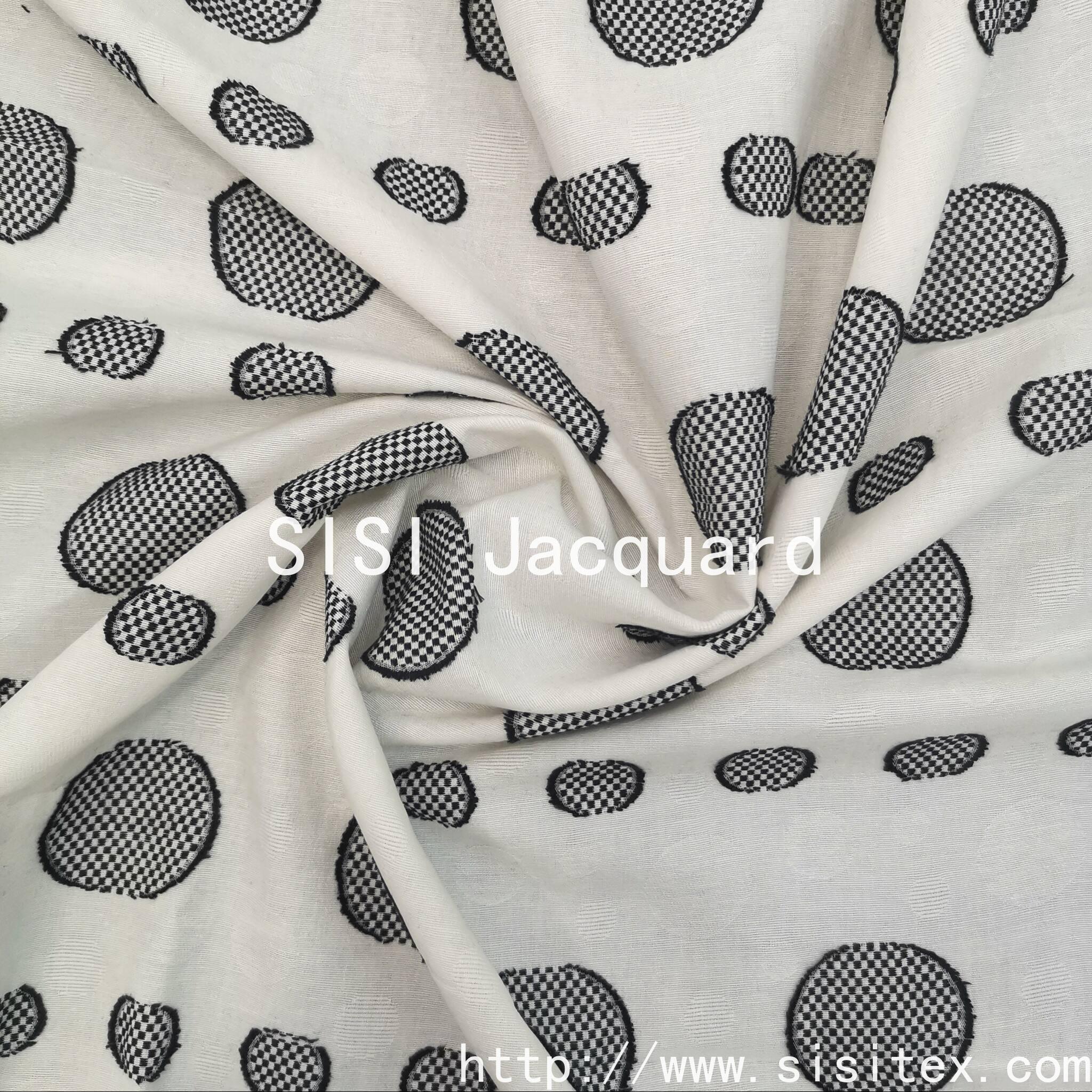 SIS woven blended jacquard cutting fabric, selected 73% cotton, 11% polyester, 16% hemp natural blend material, combined with woven technology and three-dimensional jacquard cutting design, to create a distinct layer of "big and small circle" texture. The soft and breathable cotton, the natural crisp of hemp and the wear-resistant and anti-wrinkle of polyester are perfectly integrated, which not only retains the natural texture, but also improves the practical performance, giving the fabric unique artistic expression and functionality.