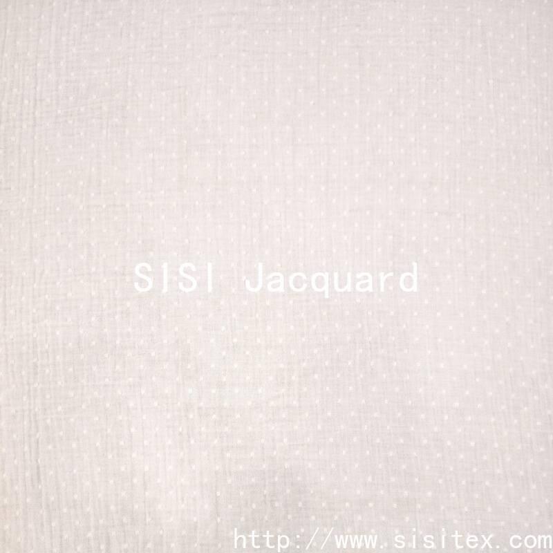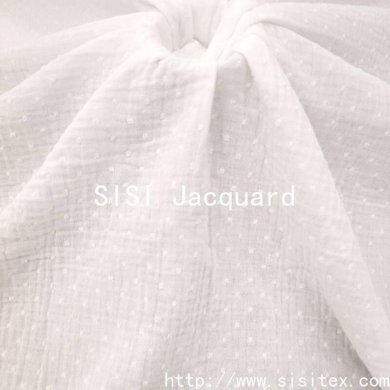 This cotton jacquard fabric is crafted with a unique **double-layer crepe weaving technique**, and is woven with delicate **dot embroidery** to create a three-dimensional relief pattern. The 100% pure cotton fabric provides a natural, skin-friendly breathability, combined with the fluffy and soft crepe texture, creating a dreamy and romantic visual layering effect, as if natural light and shadow are woven into the fabric.