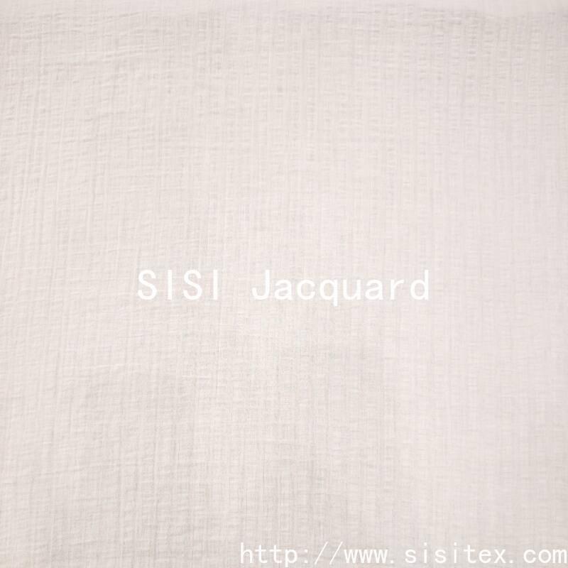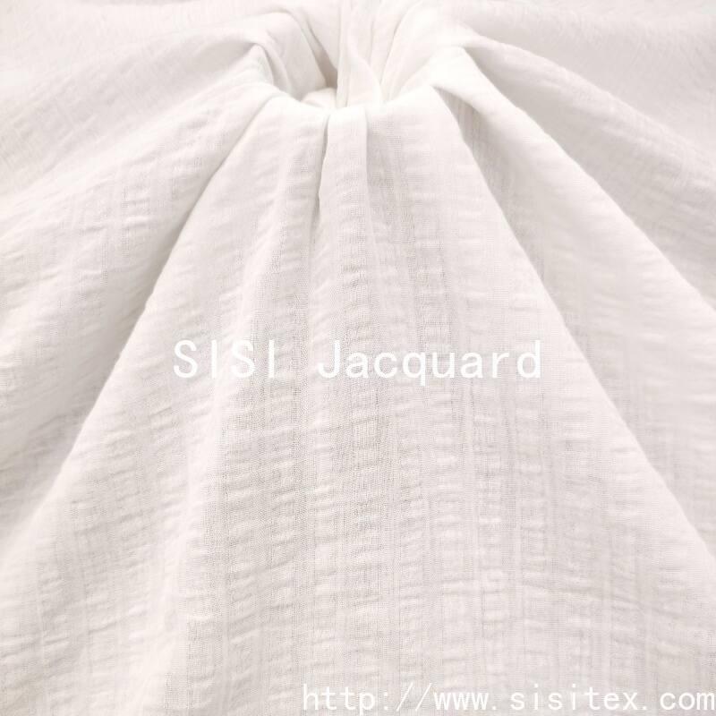 This cotton-spun double-layer jacquard fabric is woven with 80% cotton and 20% polyester blended yarns. The double-layer fabric structure creates a fine striped base, and the jacquard technique adds geometric patterns for depth. The fabric density is 125×75, with a weight of 133g/㎡. It is soft and fluffy, combining the comfort and skin-friendly texture of cotton with the smooth and draping quality of polyester. The double-layer fabric structure naturally has a slight crease, providing excellent breathability. The white base is pure and gentle, giving an overall light and modern style. It is suitable for creating comfortable and relaxed summer clothing and skin-friendly home products.
