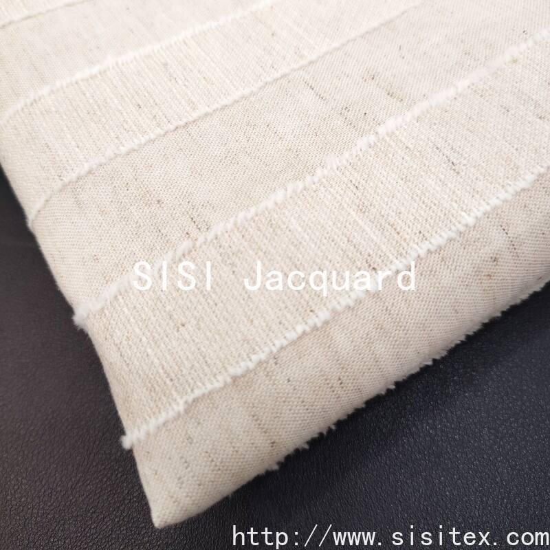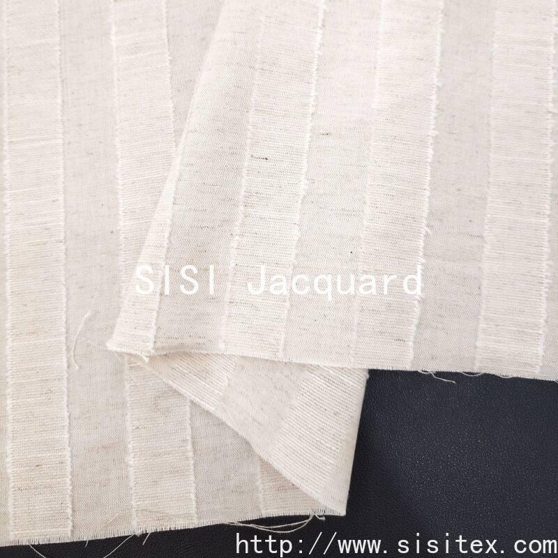 This cotton and linen vertical herringbone jacquard fabric is woven with a blend of 90% cotton and 10% linen yarns. Through the combination of jacquard and cut-out techniques, it creates a three-dimensional and lively vertical stripe pattern and texture layers. The fabric density is 120×70, with a weight of 165g/㎡. It has a thick and crisp texture, combining the softness and skin-friendliness of cotton with the natural roughness and breathability of linen. The natural linen base tone is simple and gentle. The vertical stripes and cut-out details create delicate light and shadow changes. The overall style is natural and serene, featuring Japanese-Korean style wabi-sabi aesthetics and handcrafted texture. It is suitable for creating clothing and home products that combine comfort and artistic charm.
