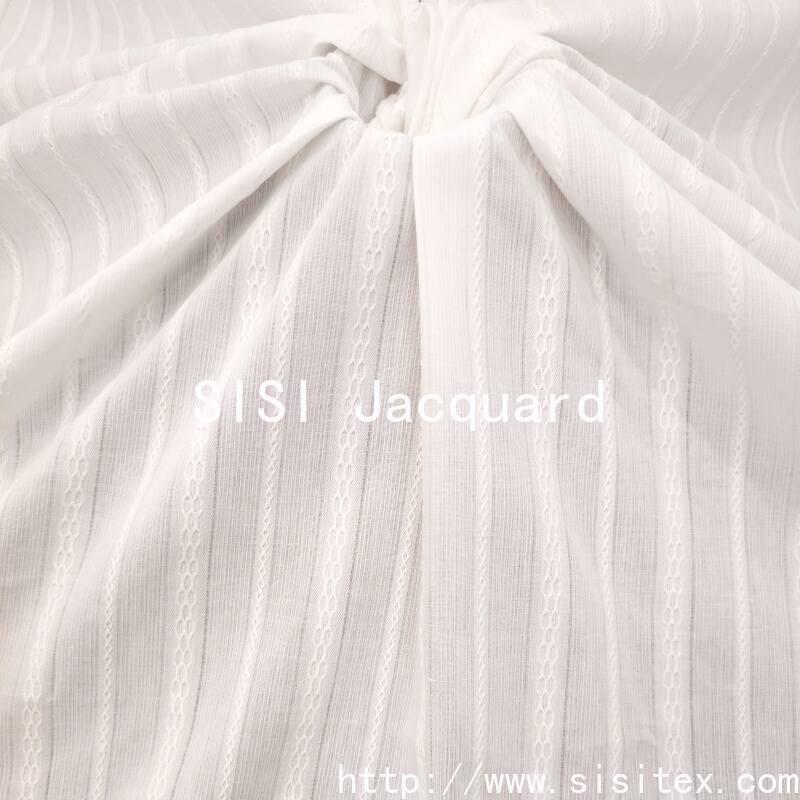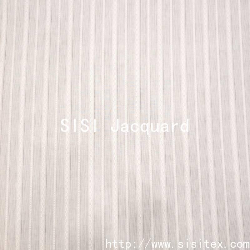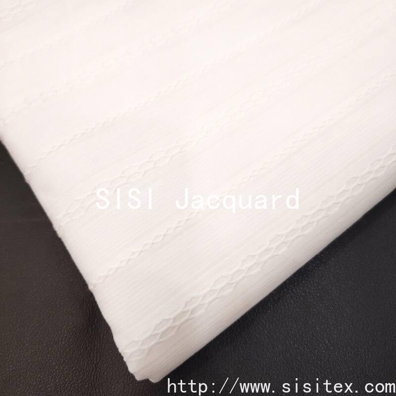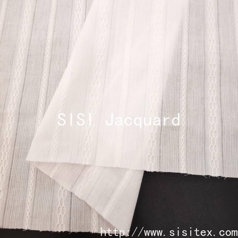 This chiffon diamond-shaped jacquard fabric is made of 100% cotton yarn, combining traditional chiffon weaving techniques with diamond-shaped jacquard patterns, creating a three-dimensional effect of interwoven transparent texture and geometric diamond stripes. The fabric density is 110×63, with a weight of 108g/㎡. It is soft and has an air-like feel, combining the natural skin-friendliness of cotton with the lightweight and breathable structure of chiffon. The diamond-shaped stripes are clear and regular, and the chiffon base fabric is slightly wrinkled naturally. The overall style is simple and transparent, with a sense of structure and breathability, suitable for creating comfortable and stylish clothing for spring, summer and autumn, as well as fresh home textiles.