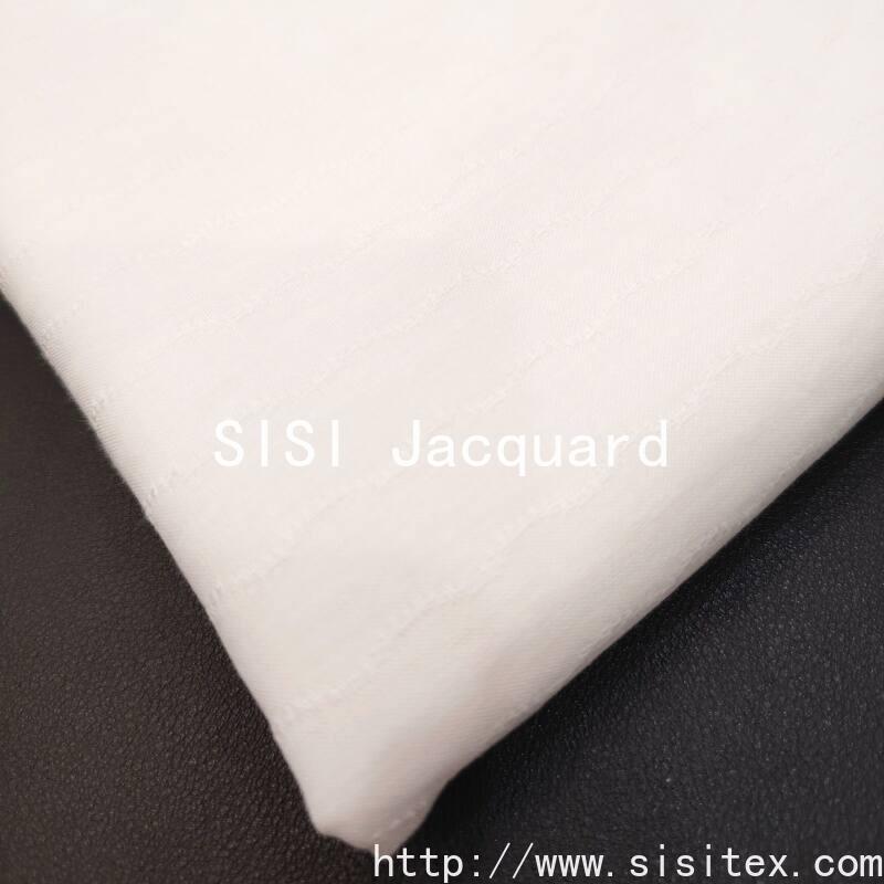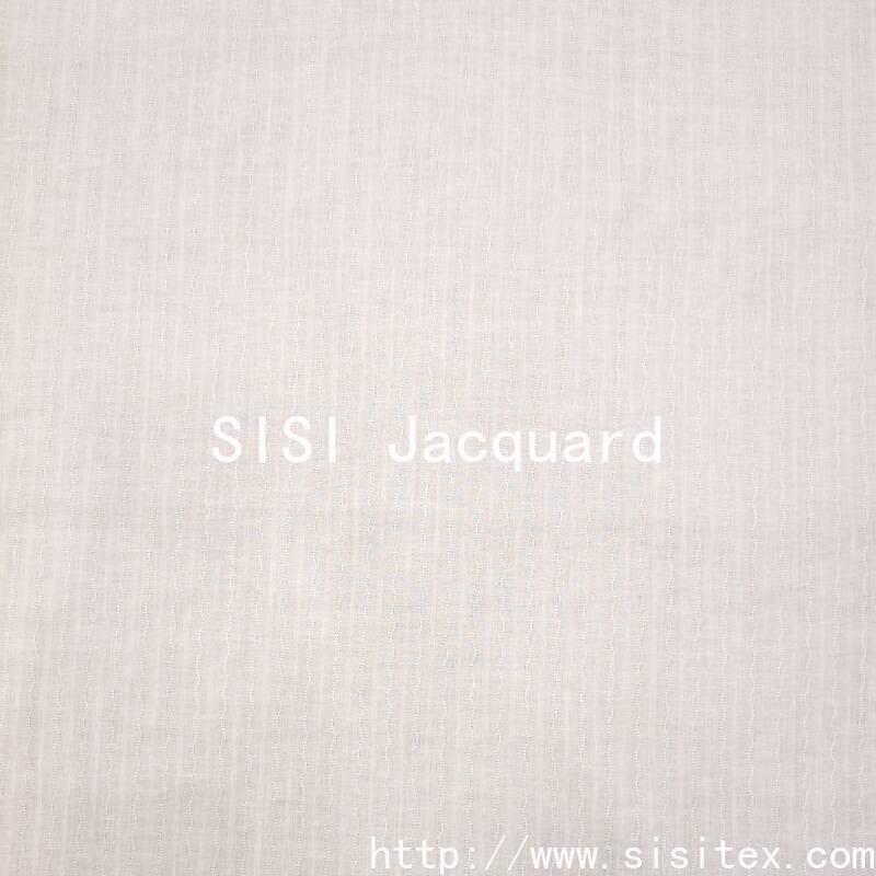 This cotton and rayon wavy jacquard fabric is made from a 50% cotton and 50% rayon blended yarn. It is woven through a jacquard process to create a smooth and undulating wave pattern. The fabric has a density of 80×65 and a weight of 88g/㎡. It is soft and lightweight, combining the comfort and skin-friendliness of cotton with the silky drape of rayon. The wave pattern is natural and flowing, with a sense of movement and rhythm. The overall style is simple and elegant, featuring modern geometric beauty and a natural flowing atmosphere. It is suitable for creating comfortable and stylish summer, autumn and spring clothing as well as fresh home accessories.