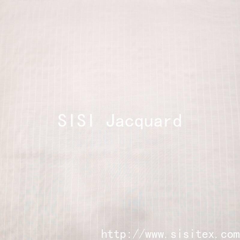 This meshed fabric with both human silk and human cotton, featuring a 100% blend of these two types of yarns, combines the technique of mesh weaving with the longitudinal striped jacquard design to create a three-dimensional effect of transparent texture, clear stripes, and local meshing. The fabric density is 96×67, with a weight of 108g/㎡. It has a soft and smooth texture, gentle luster, and combines the silky feel of human silk with the draping and breathable properties of human cotton. The stripes are neat and fine, and the meshed parts enhance the breathability and add layering effects. The overall style is light and transparent, with a modern and minimalist feel as well as a feminine and gentle charm. It is suitable for creating high-end shirts, dresses, and elegant home accessories for spring, summer, and autumn seasons.