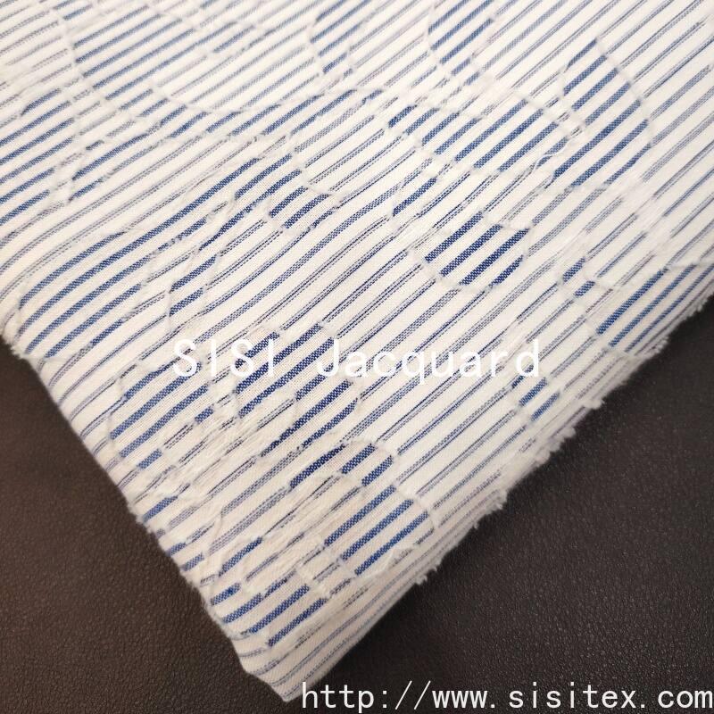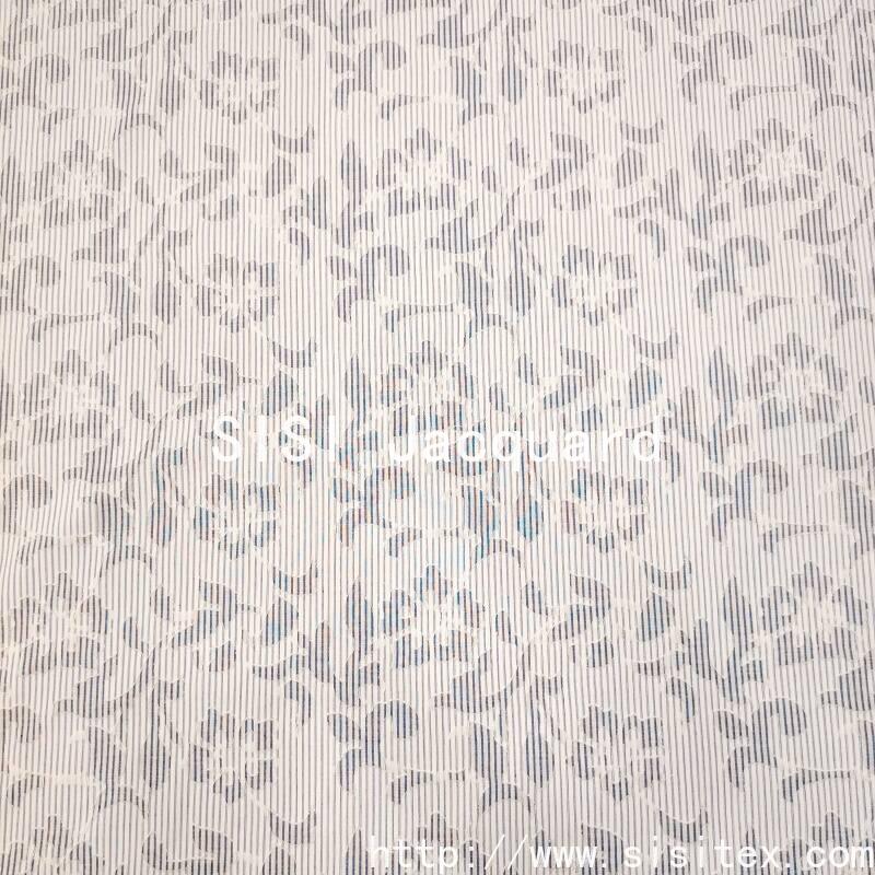 This polyester-cotton blue and white striped jacquard printed fabric is made from a blend of 35% cotton and 65% polyester yarns. It is woven through a dyeing process to create a classic blue and white striped base, and then combined with jacquard and print techniques to form a three-dimensional and lively plant and flower pattern. The fabric density is 150×64, with a weight of 151g/㎡. It has a crisp and thick texture, combining the durability and wrinkle resistance of polyester with the comfort and breathability of cotton. The blue and white stripes are refreshing and bright, with a clear color contrast. The jacquard and print parts are delicate and rich. The overall style combines the freshness of the ocean and the natural romance, and has an elegant modern touch. It is suitable for creating practical and stylish clothing and home products.