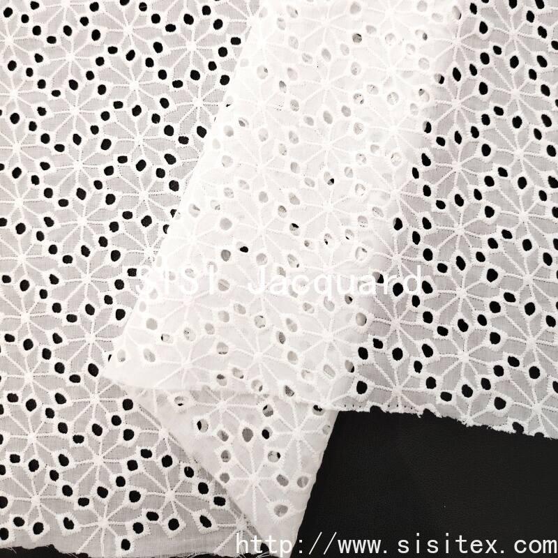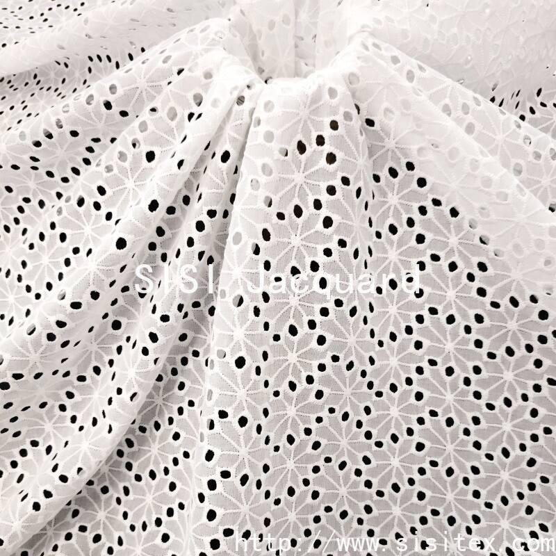 This fabric is made of 100% combed cotton (JC60×JC60). Through a meticulous镂空 embroidery technique, a full-patterned plant flower-shaped perforation pattern is embroidered onto the fabric. The embroidered holes are evenly and delicately distributed, with a natural and soft flower shape, creating a transparent yet flexible texture. The fabric width is 135cm. It has a soft and skin-friendly texture, with cotton fibers providing excellent breathability and moisture absorption. The overall style is fresh and artistic, featuring a natural breathing sensation and artisanal warmth. It is suitable for summer shirts, dresses, and elegant home accessories.