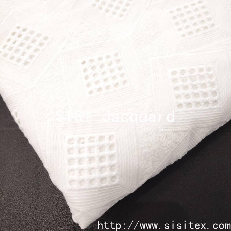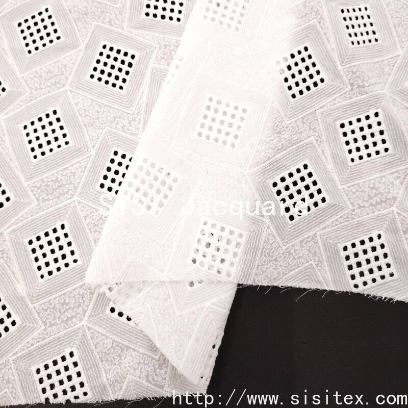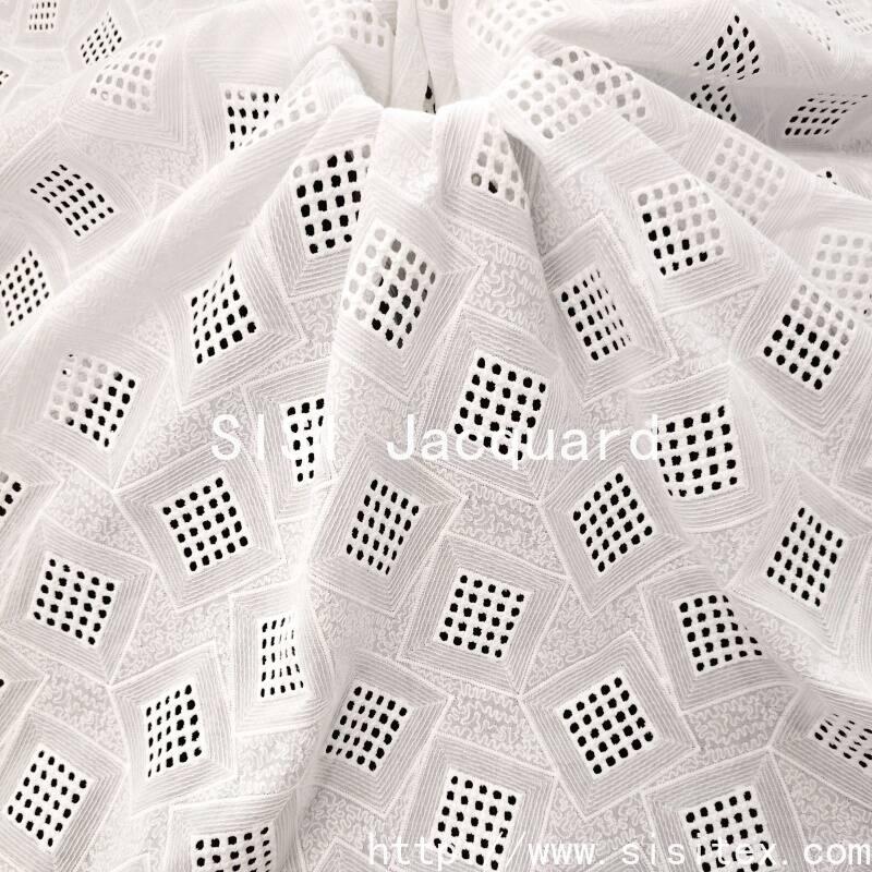 This fabric is woven with 100% combed cotton (JC60×JC60, density 90×88). Through a meticulous perforated embroidery technique, regular-shaped diamond-shaped geometric patterns are embroidered. The perforated holes are evenly and delicately distributed, and the diamond patterns are clear and three-dimensional, creating a transparent and orderly texture. The fabric width is 135cm. It is soft and stiff, with cotton fibers providing excellent skin contact and breathability. The overall style is simple yet contains details, combining geometric modernity with handmade warmth. It is suitable for creating summer casual wear, dresses, and fresh home accessories.