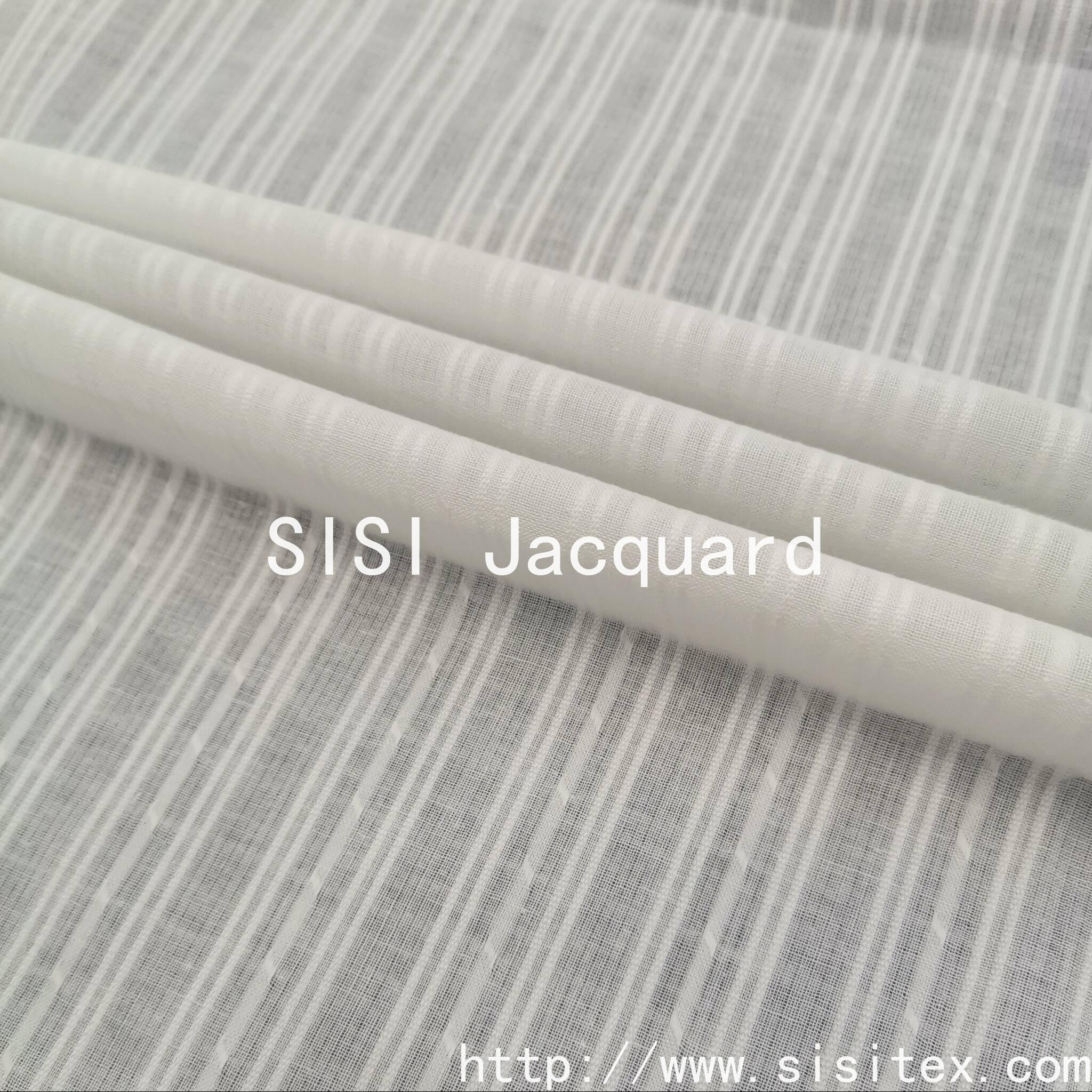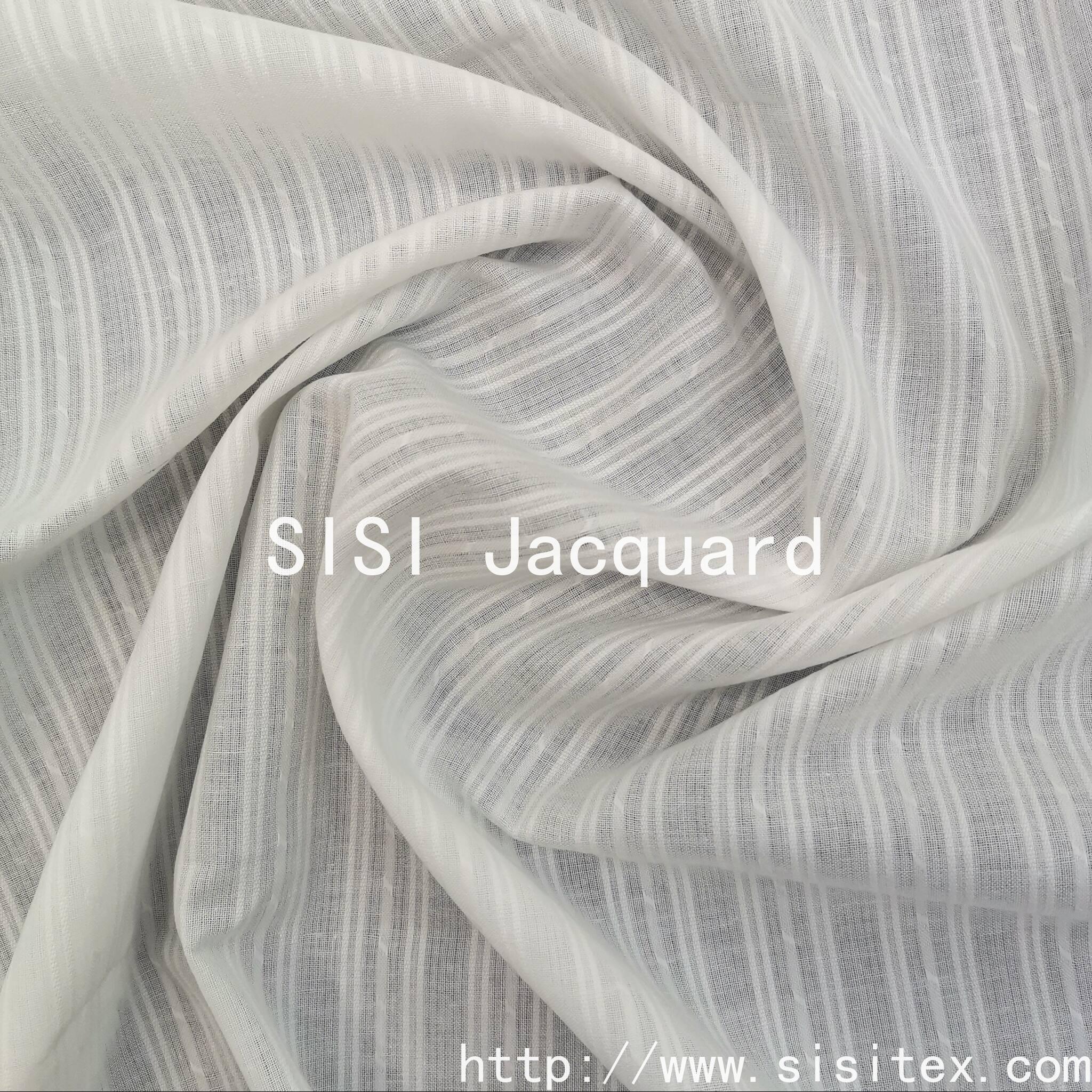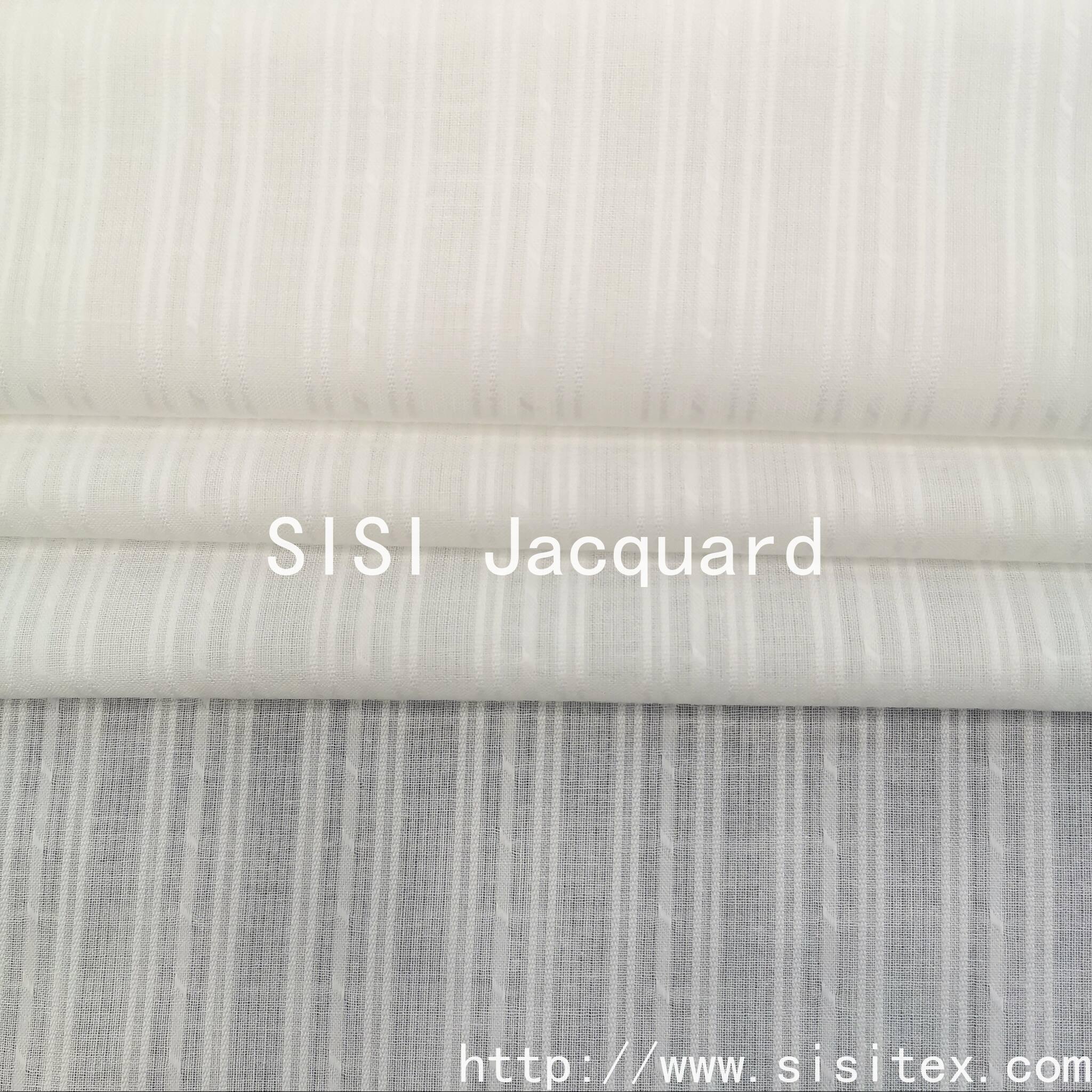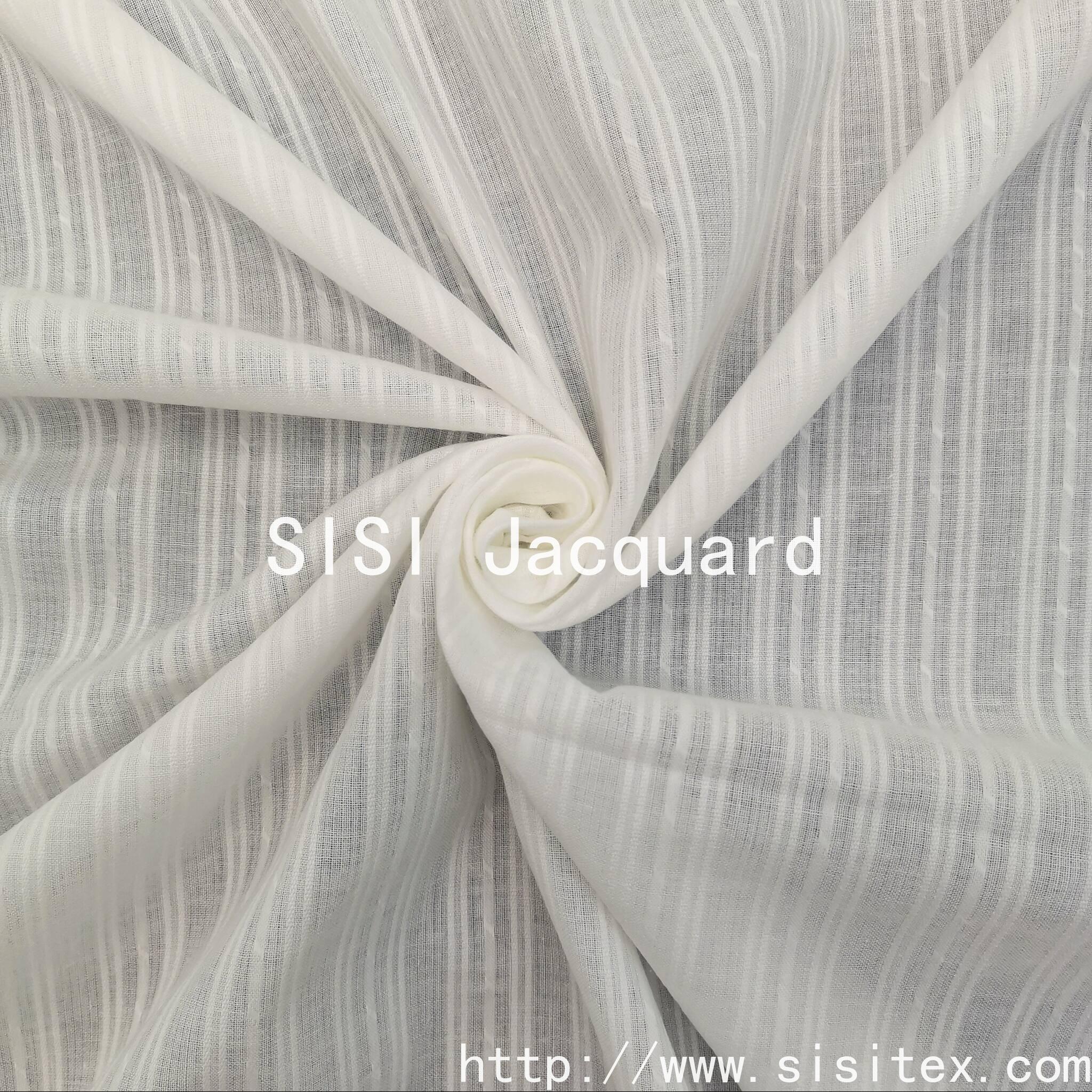 This all-cotton gauze vertical jacquard fabric produced by Shaoxing Sisi Textile Products Co., Ltd. perfectly combines traditional craftsmanship with modern design. Selected from high-quality long-staple cotton as raw material and using patented yarn weaving technology, a unique three-dimensional vertical stripe texture is created. The fabric combines stiffness and softness, with excellent drape, making it an ideal choice for making high-end ready-to-wear garments.