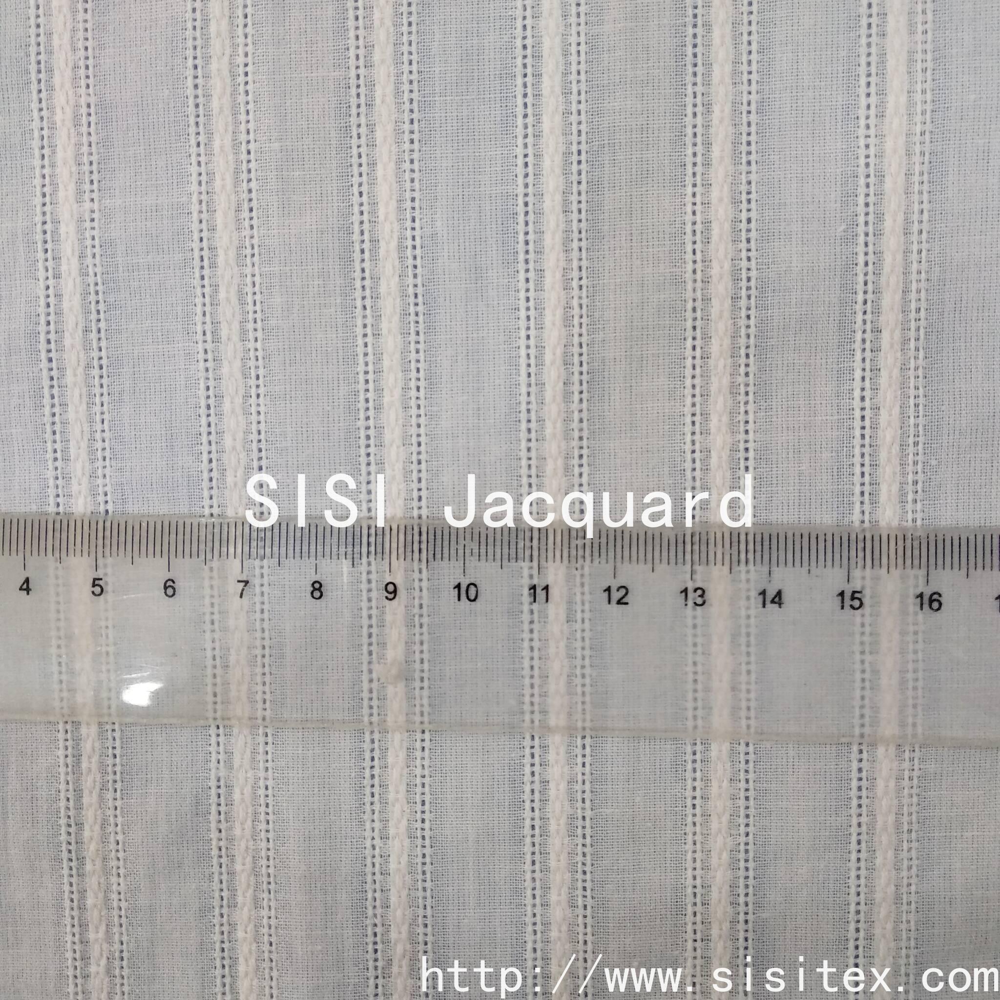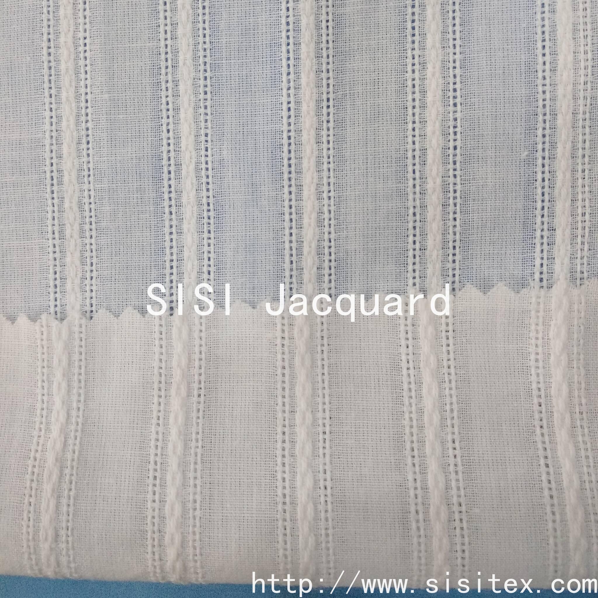 This is a cotton voile jacquard fabric with a wavy stripe and vertical stripe pattern. It is made from 100% cotton and features a precise jacquard technique to accurately display the three-dimensional texture of the wavy stripes and vertical stripes.