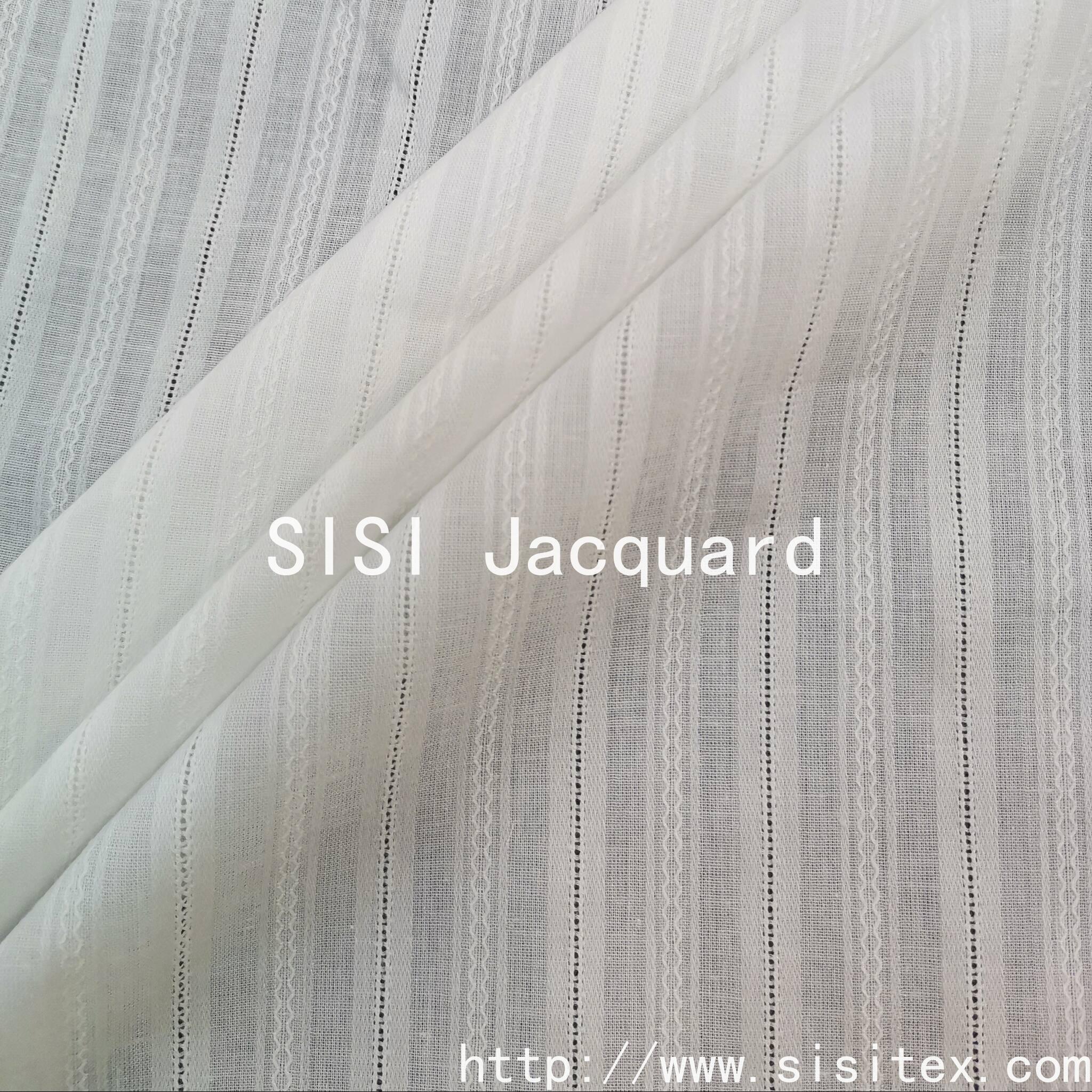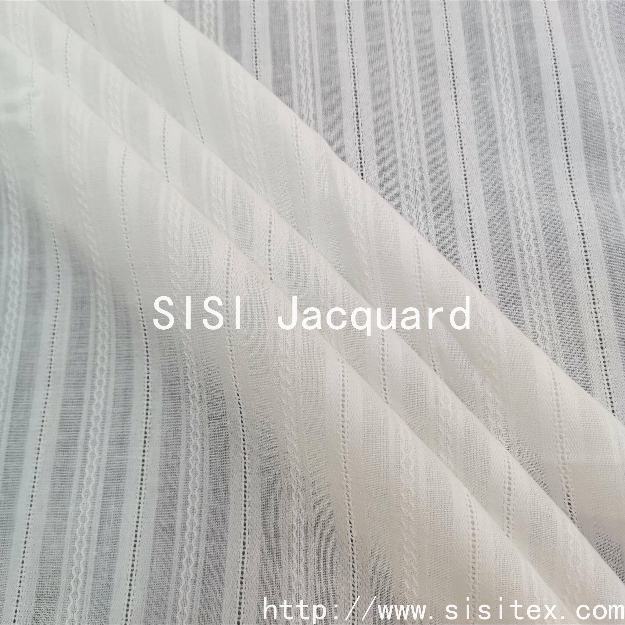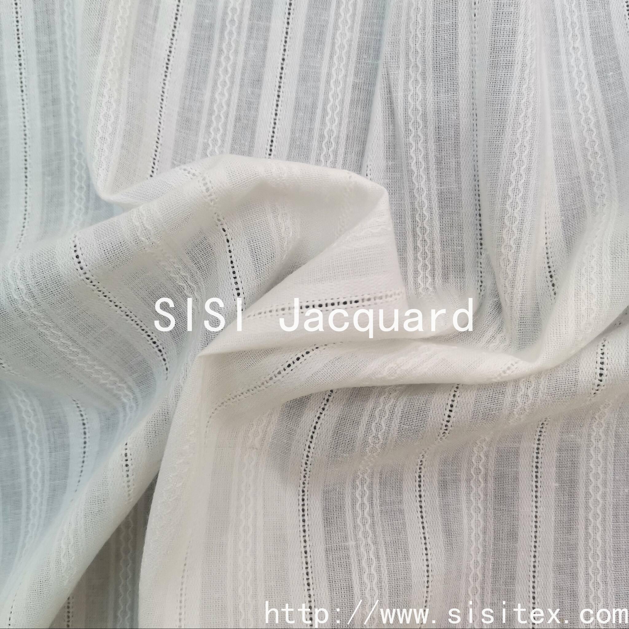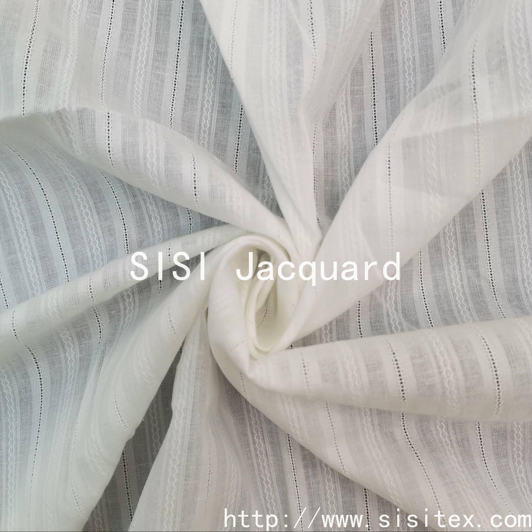 All-cotton mesh openwork vertical stripe jacquard fabric. Based on 100% pure cotton, it is crafted using the mesh technique to achieve a lightweight and breathable transparent texture. The vertical stripe jacquard design adds a retro and elegant visual layer to the fabric.