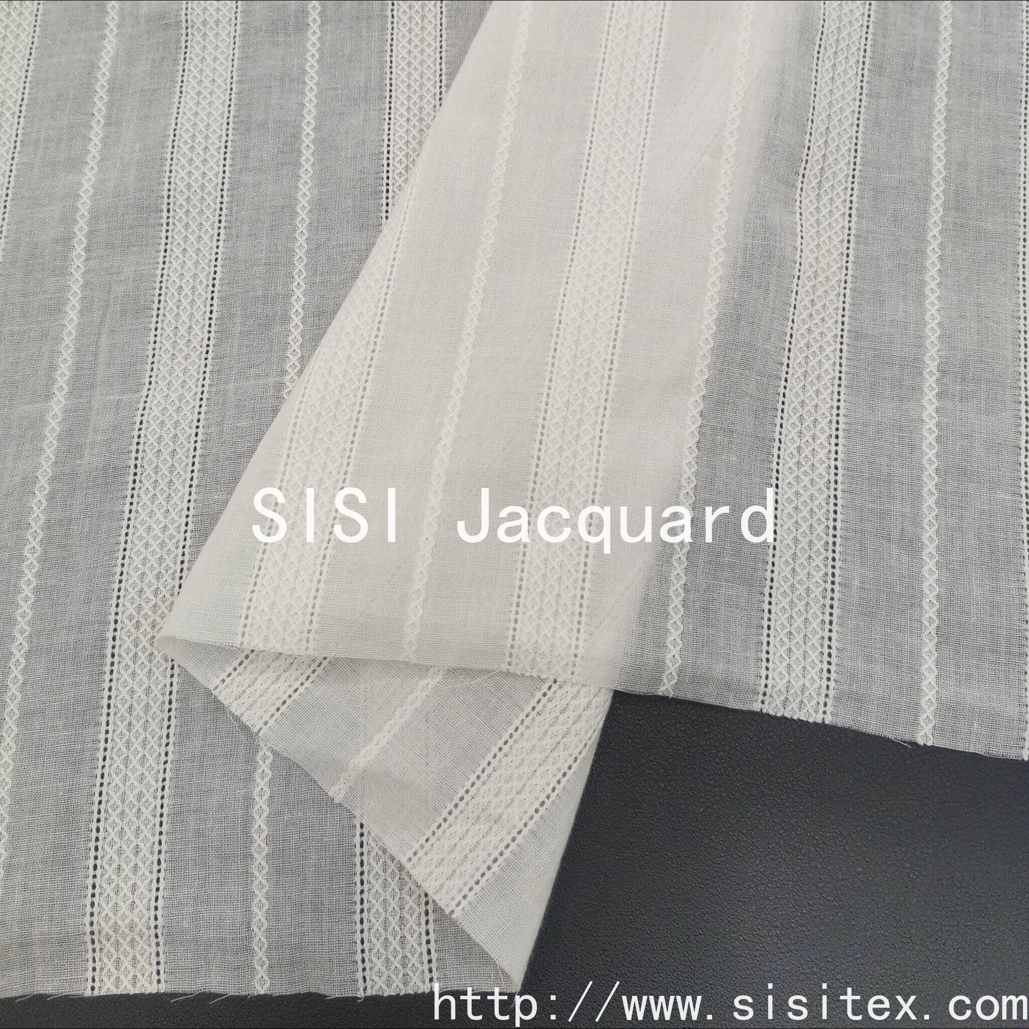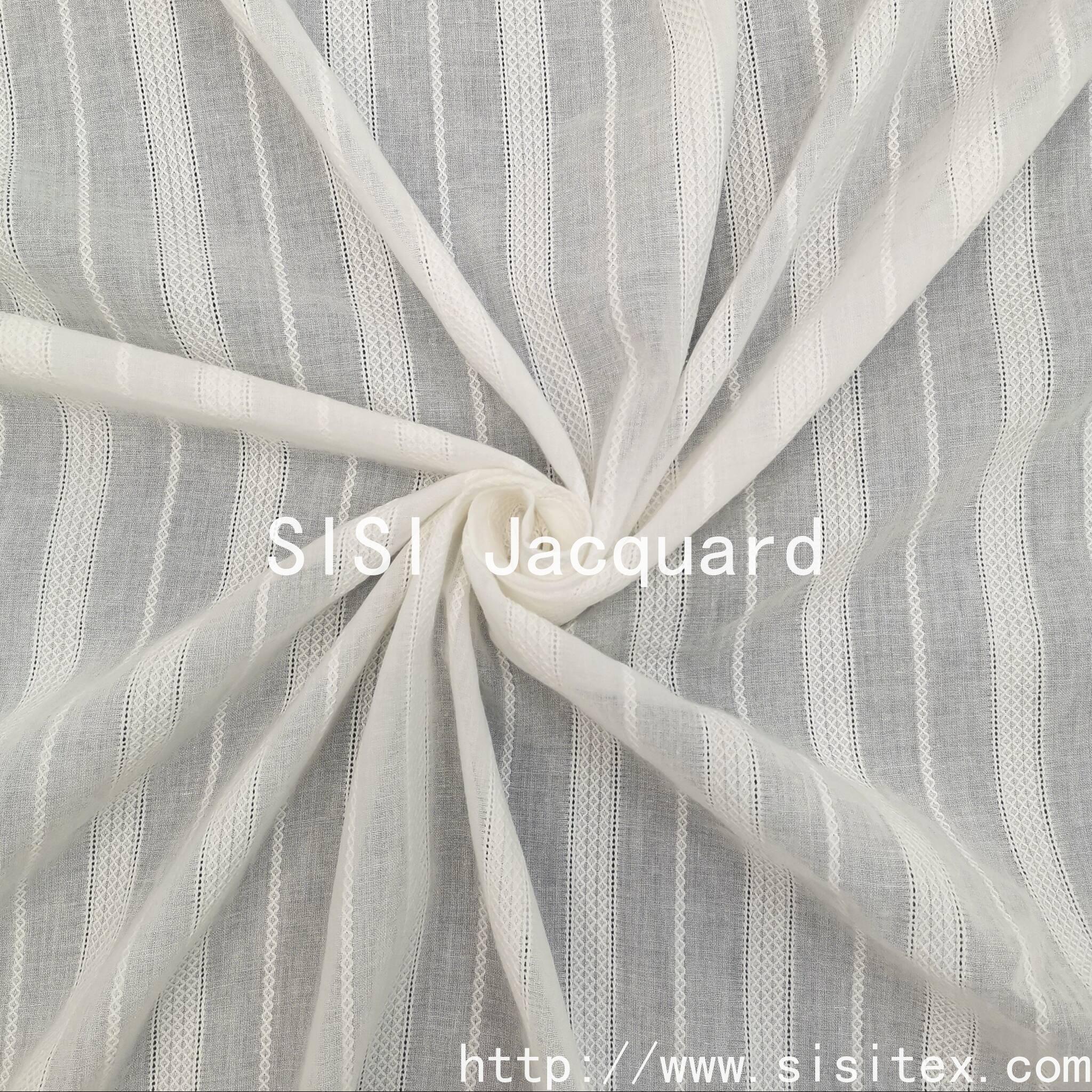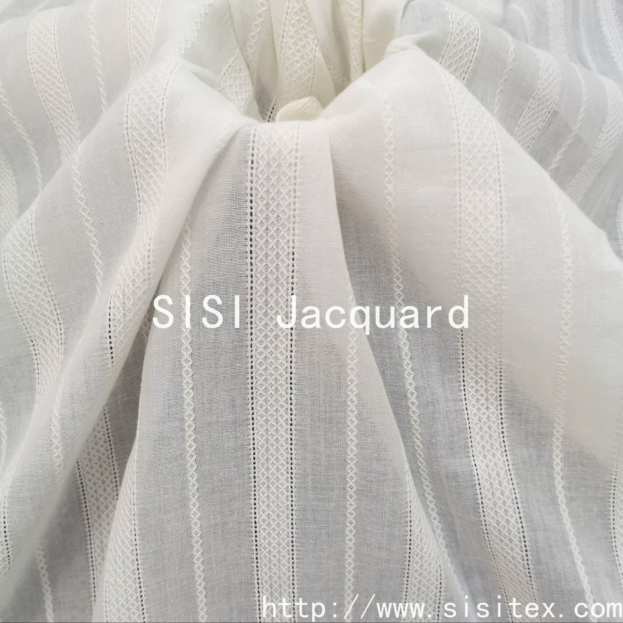 This is a 100% cotton voile jacquard fabric. It is made of natural cotton fibers and is soft, breathable, environmentally friendly and healthy. Through the jacquard weaving technique, the fabric presents a delicate and three-dimensional texture, retaining the transparency and lightness of voile while also giving it a refined artistic touch.