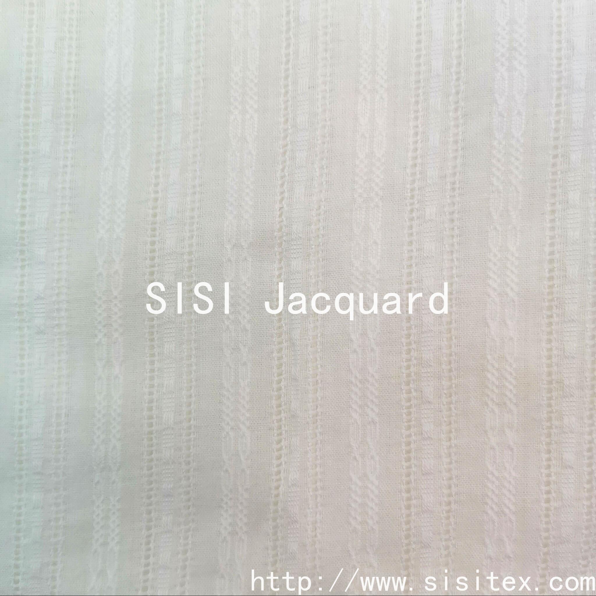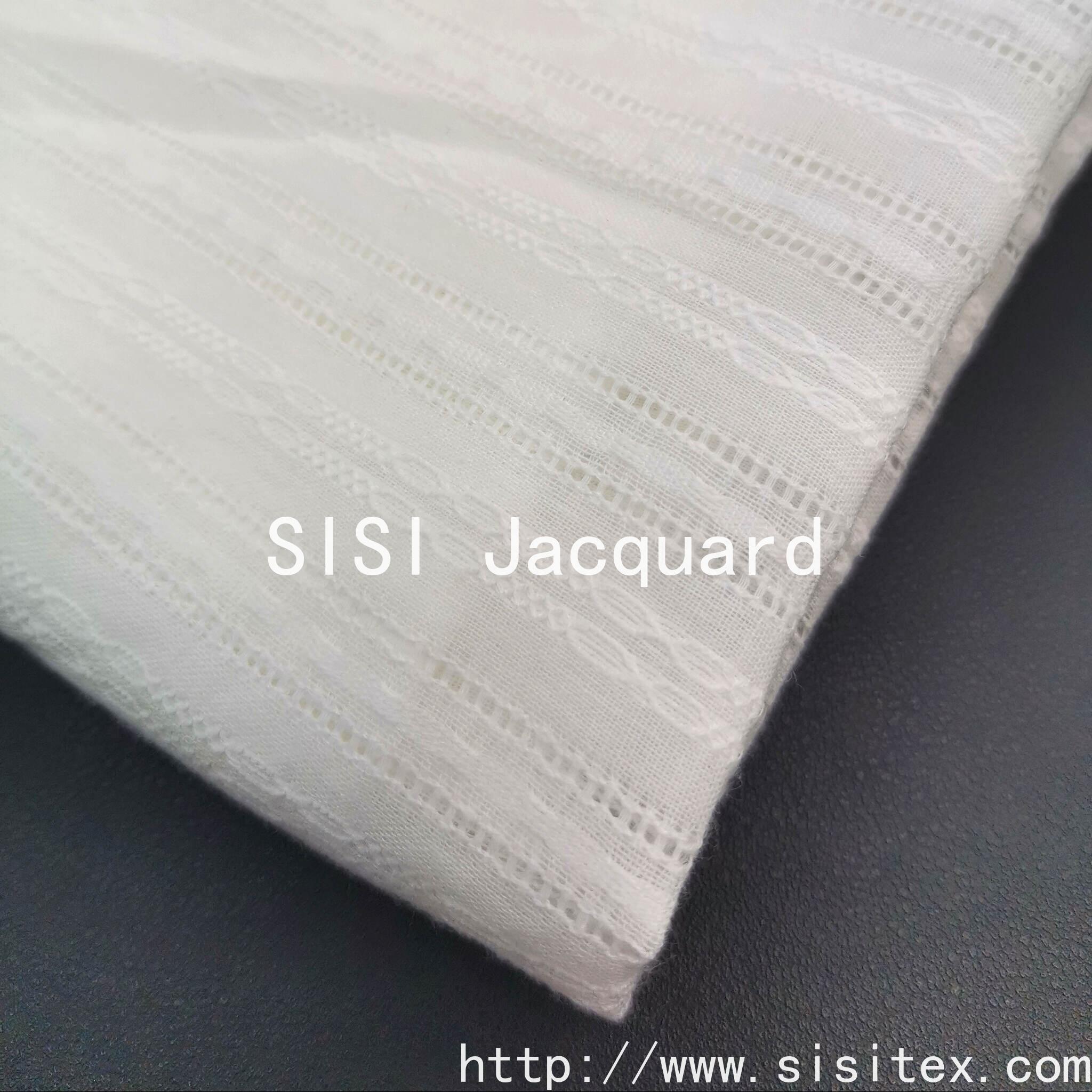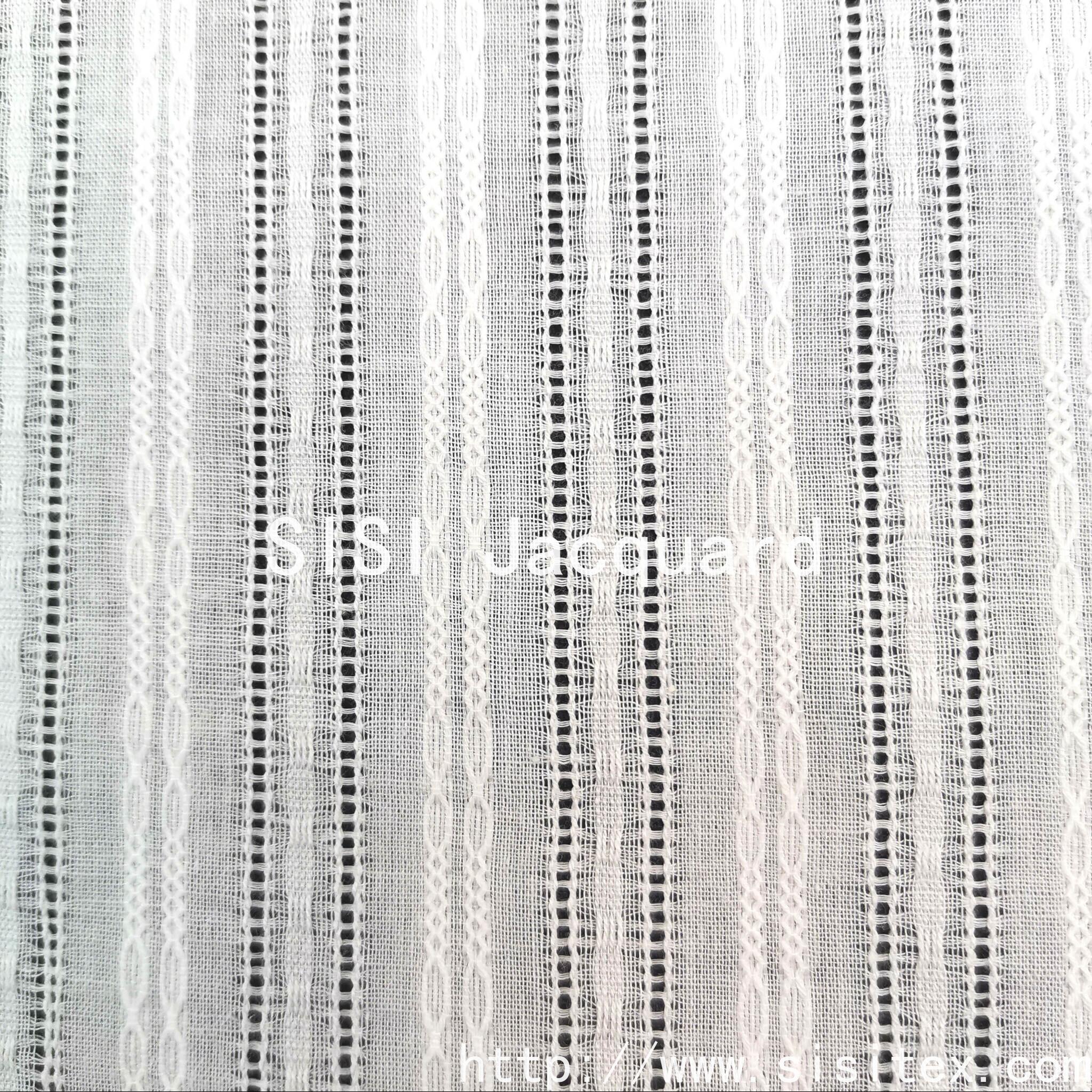 This is a 100% cotton mesh jacquard fabric with openwork stripes. It combines the properties of "skin-friendly and breathable" as well as "environmentally friendly and sustainable". The fabric is made using the mesh openwork technique, creating a transparent and lightweight visual effect; at the same time, through the jacquard technology, it presents delicate textures, achieving a balance between "breathability" and "fineness".