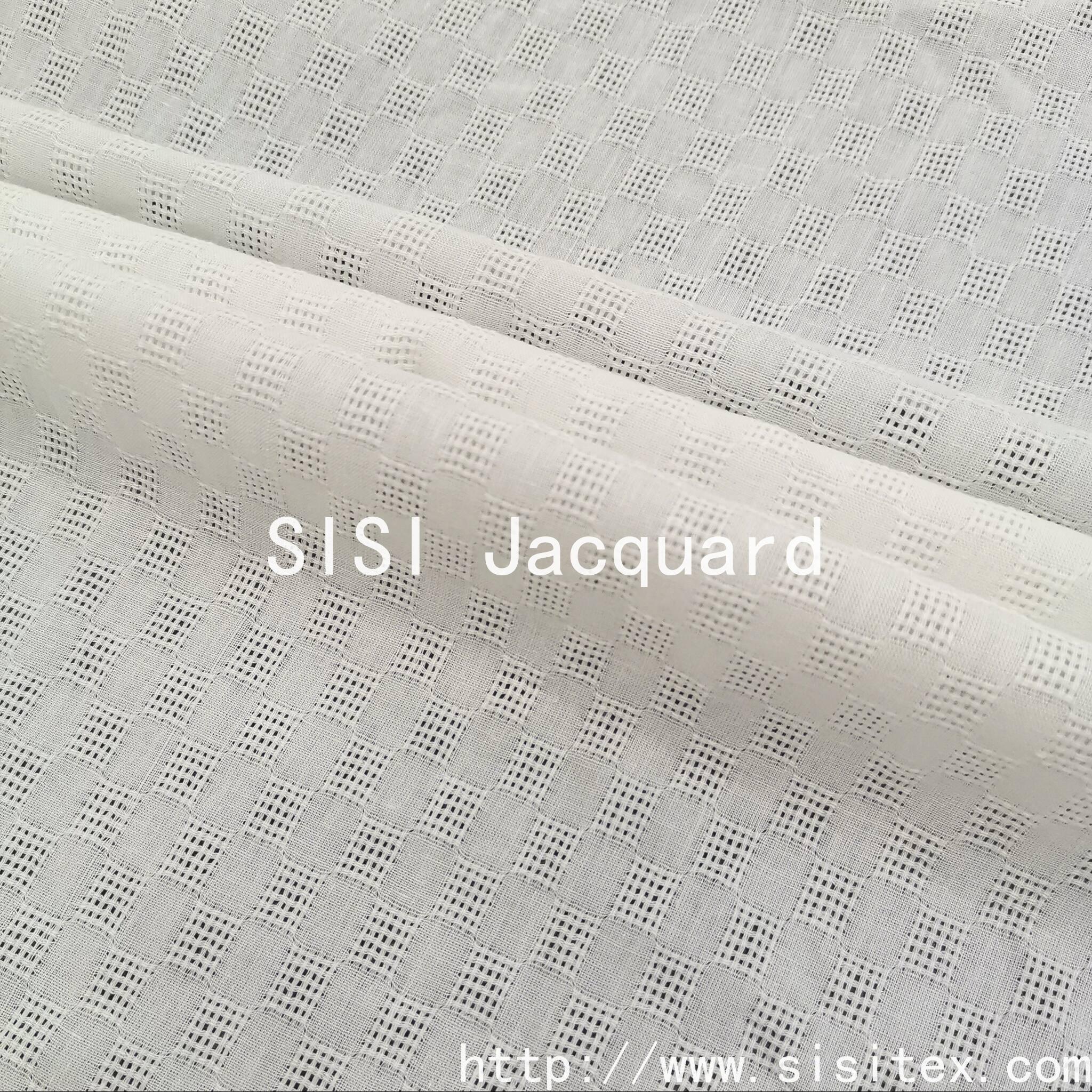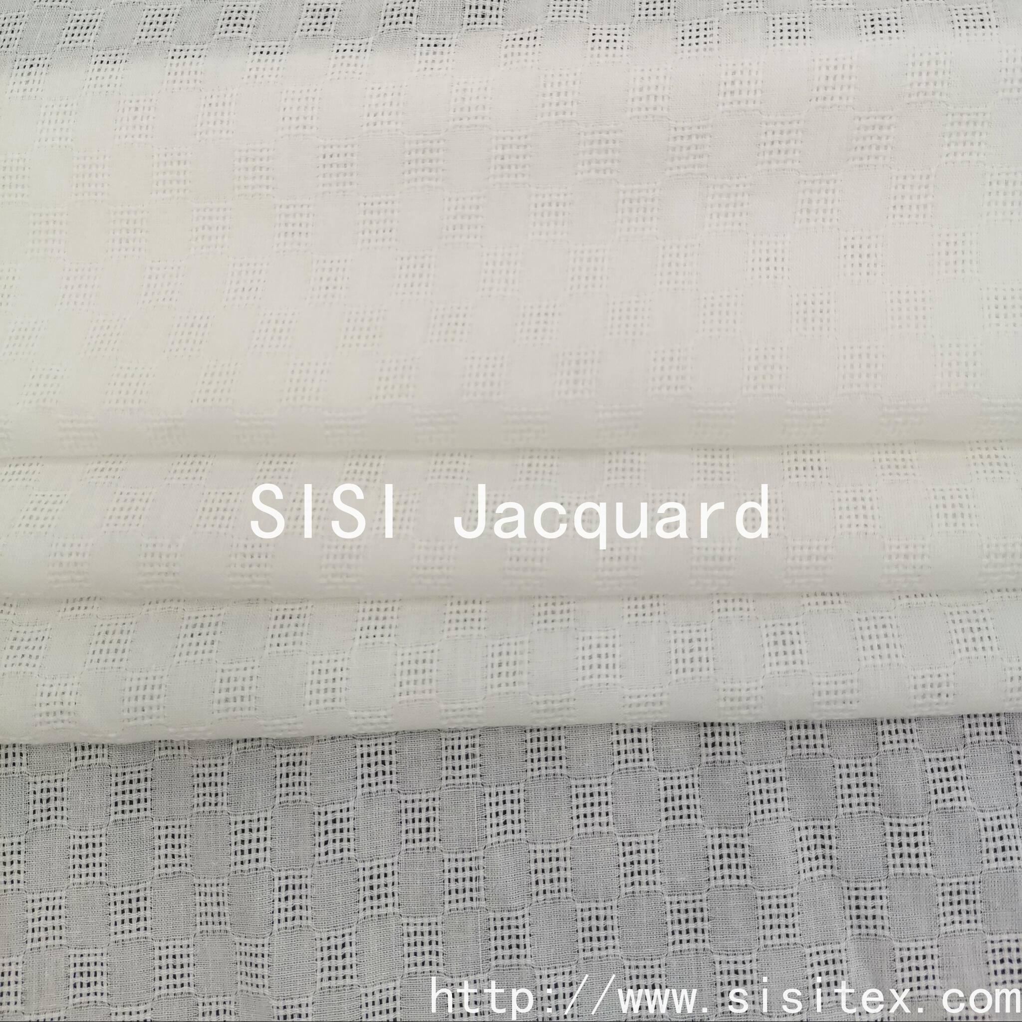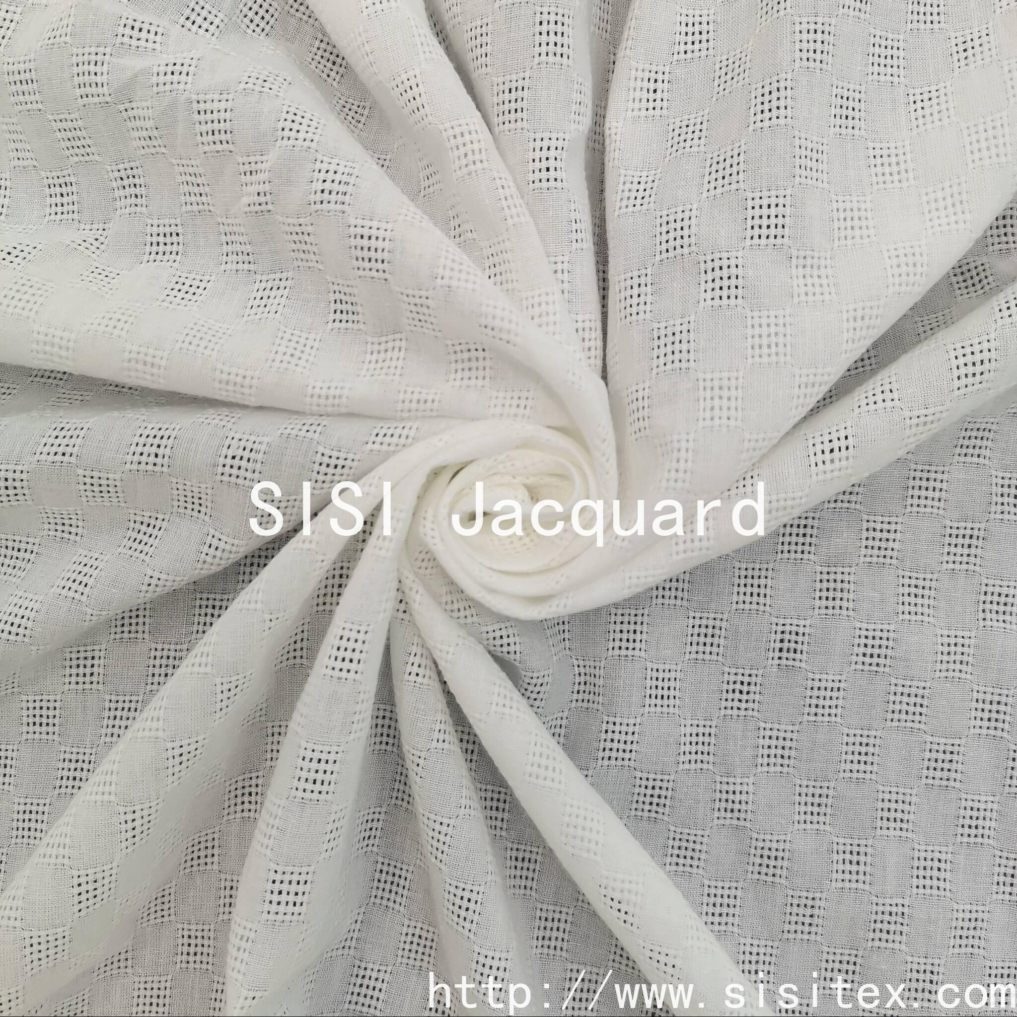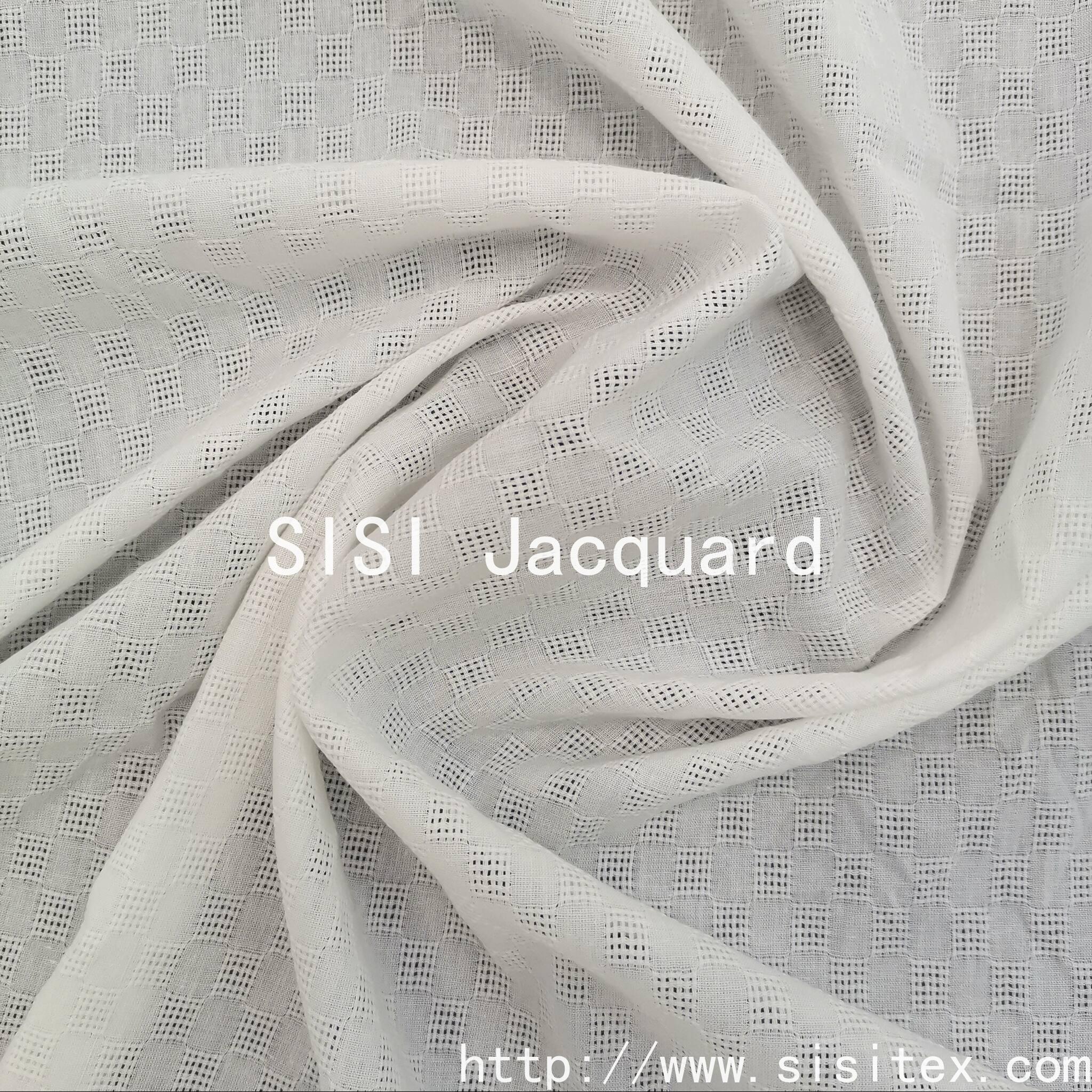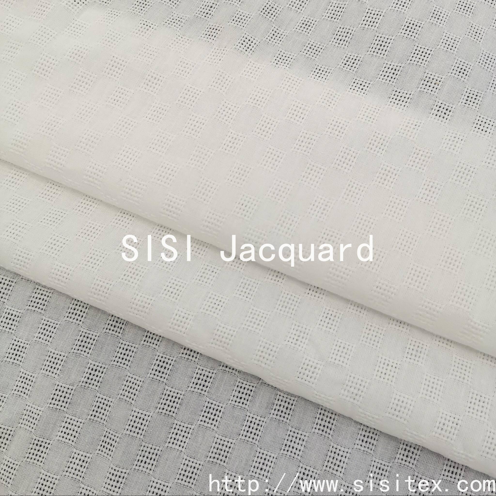 This product is made of 100% cotton mesh jacquard fabric SS18721, featuring a perforated grid pattern. It aligns with the trend of "natural fibers, eco-friendly printing" and meets the psychological needs of the post-pandemic era for "close-fitting healing and sustainable fashion". The perforated grid design of the jacquard mesh fabric not only continues the functional appeal of "light and breathable fabric", but also breaks through the traditional flatness of the fabric through the jacquard weaving technique, conforming to the trend of texture re-creation such as "rugged texture, 3D relief texture", and injecting dynamic visual layers into the clothing. The retro jacquard technique of the mesh fabric combined with the grid elements is suitable for "new Chinese style, new retro" styles, and becomes a bridge connecting traditional aesthetics and modern design.