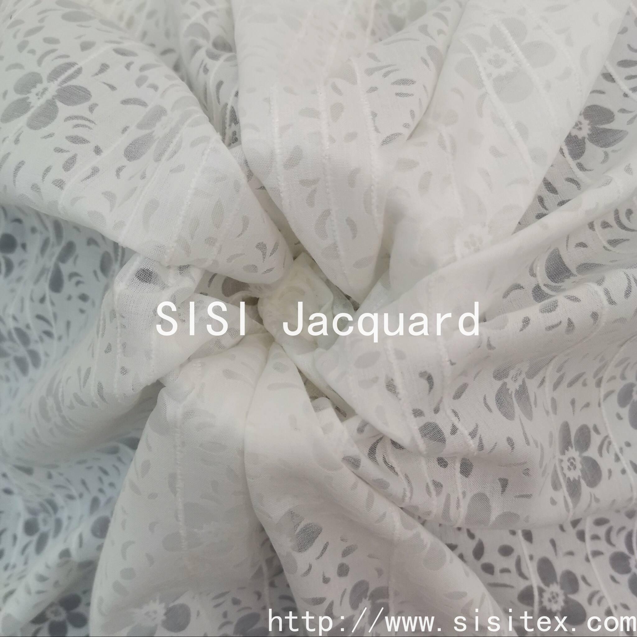 This product is made of CVC 55% cotton and 45% polyester, with a floral jacquard and printed pattern fabric. It is a lightweight and breathable design fabric suitable for spring and summer women's wear and home textiles.