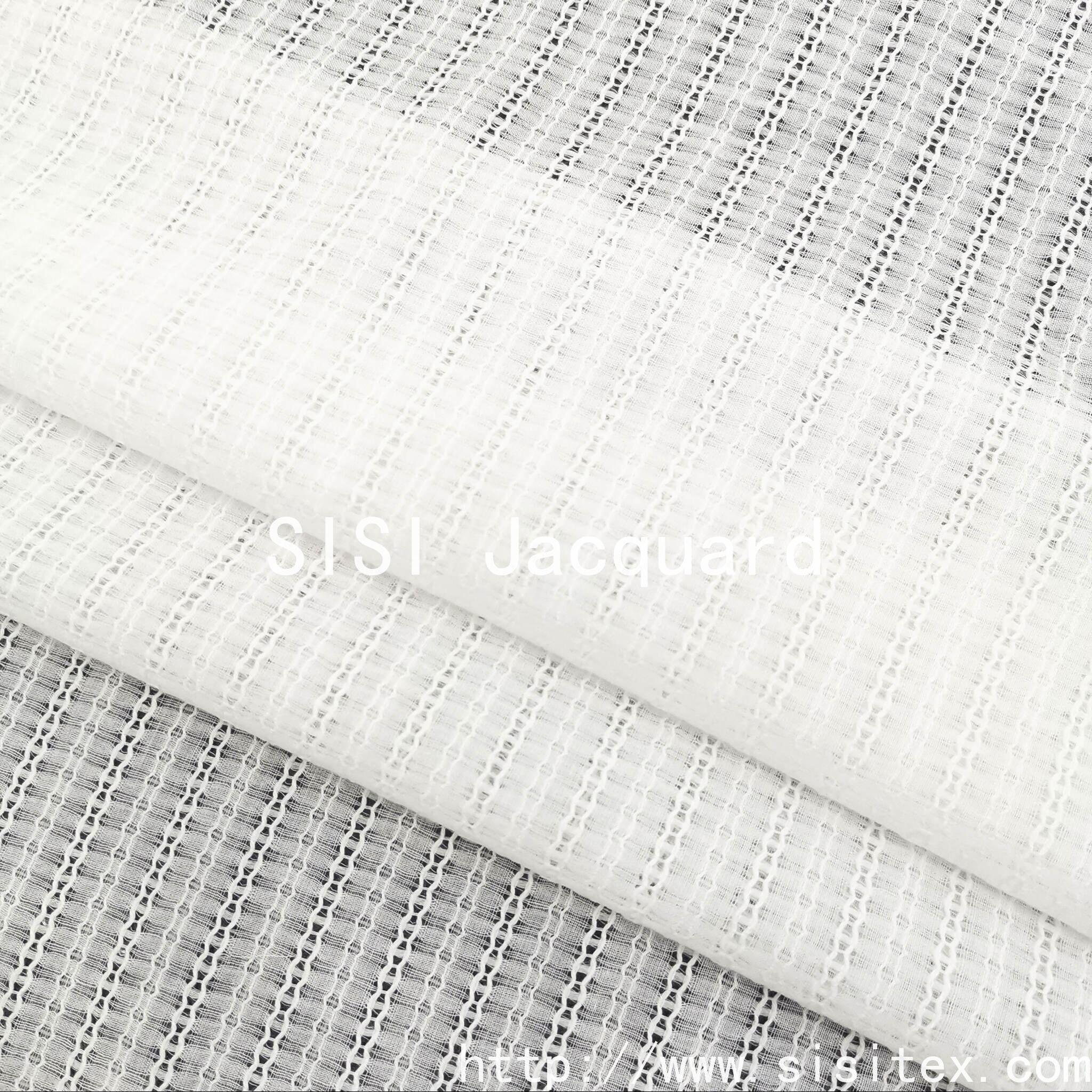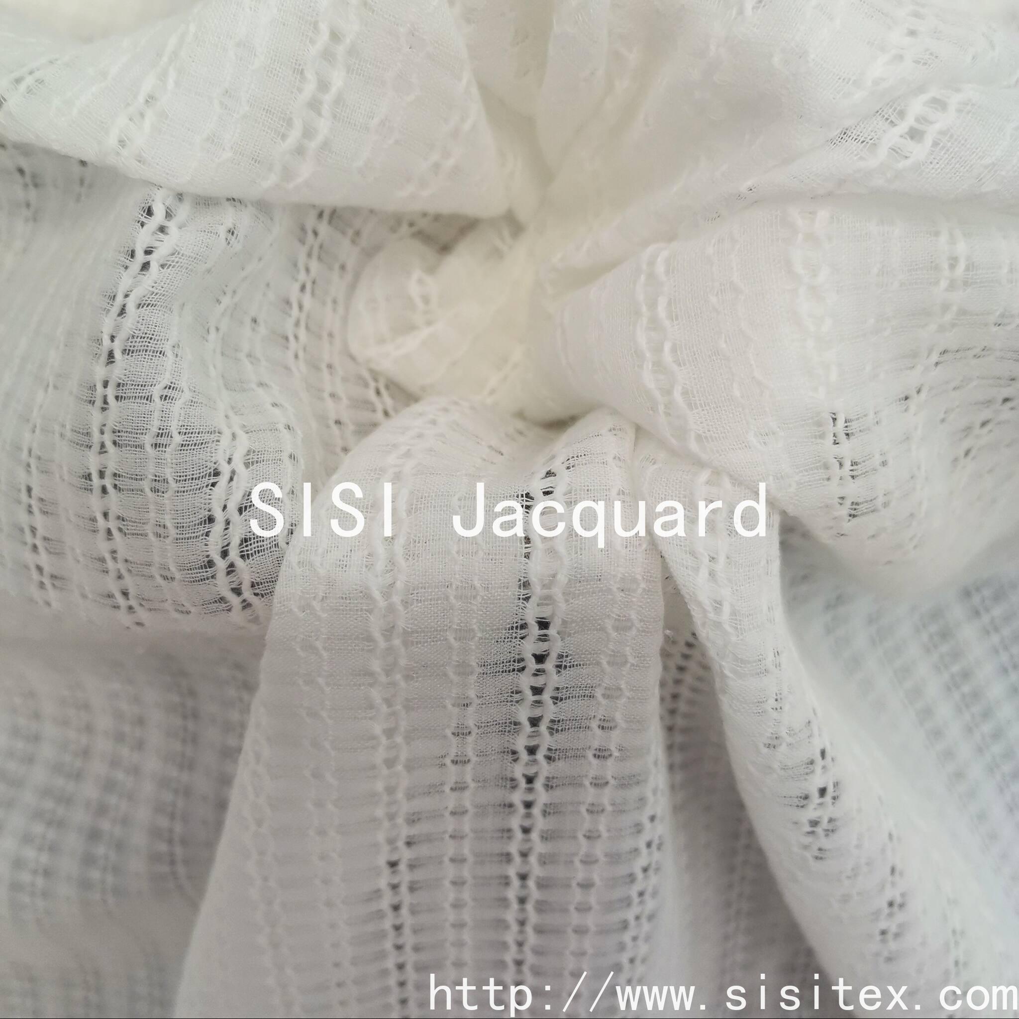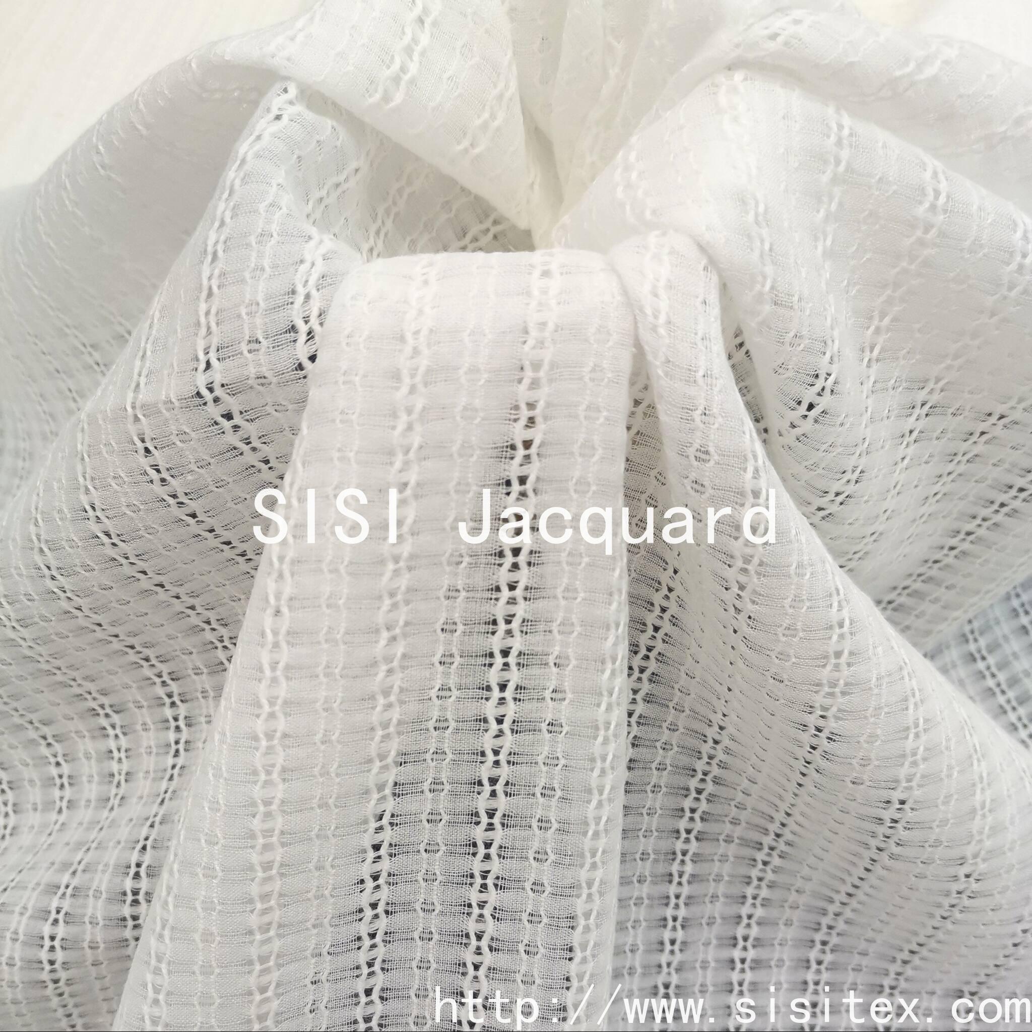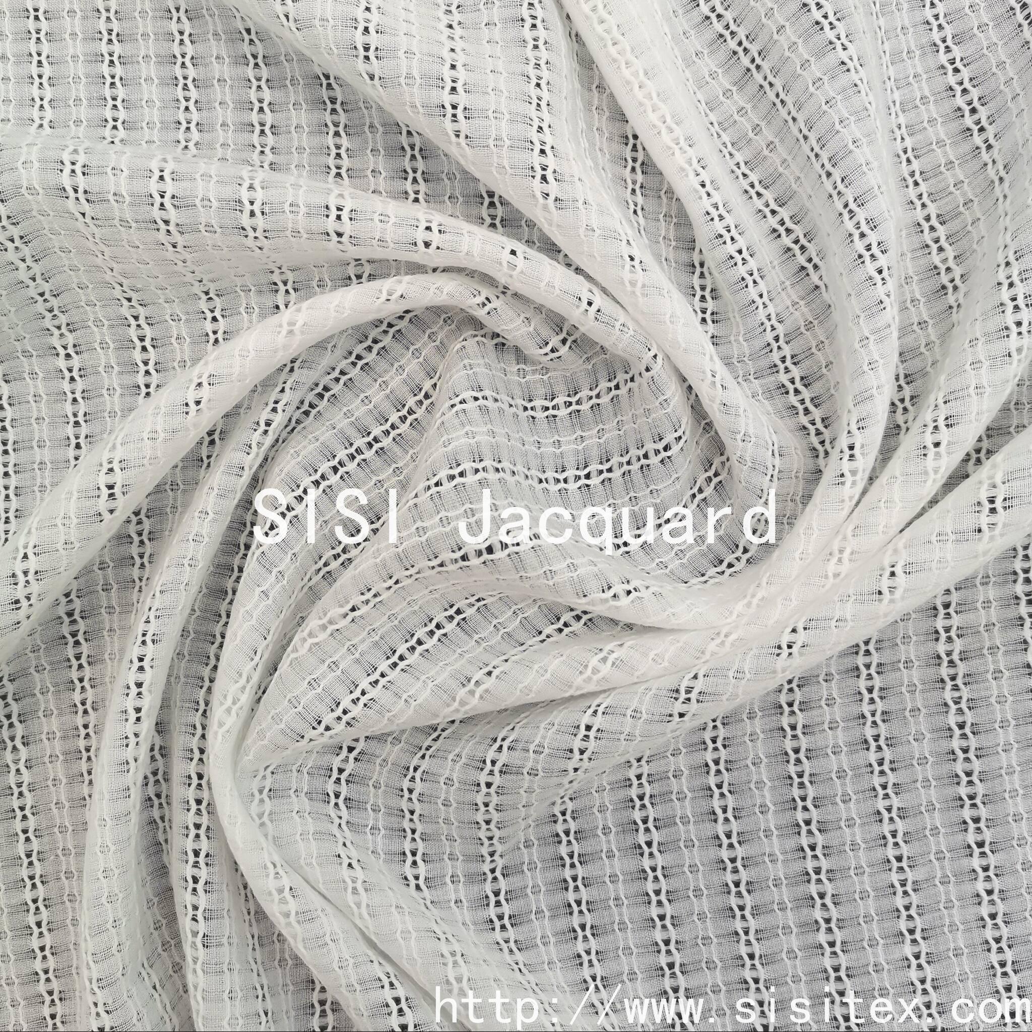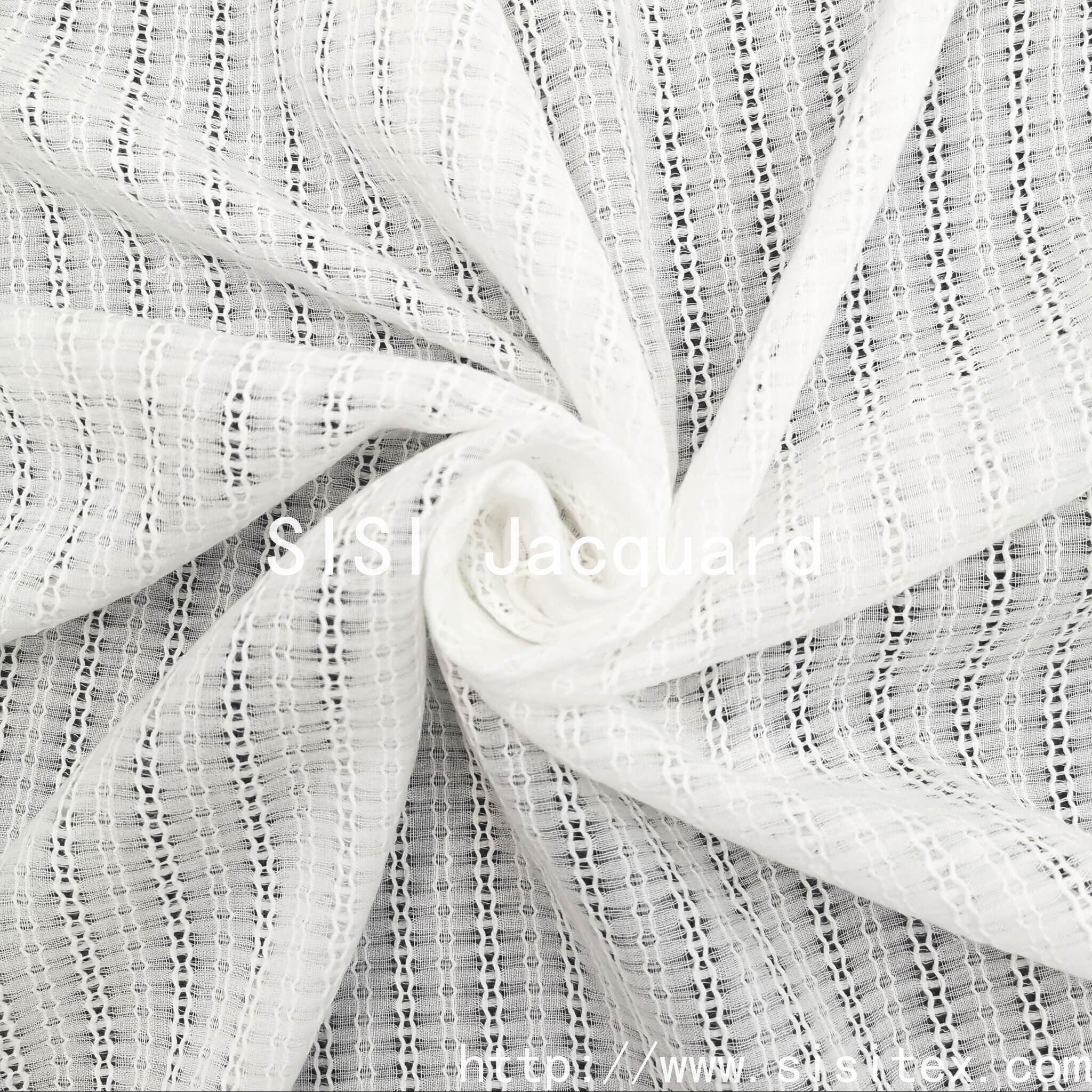 This product is a woven cotton voile fabric with openwork and jacquard patterns SS18201. The pure cotton material conveys an eco-friendly attribute. The openwork jacquard texture simulates natural texture, aligning with the "healing fabric" trend and meeting the post's pursuit of a natural feel. The transparency and texture of the openwork jacquard create a natural atmosphere in the space, combining practicality and aesthetics. The exquisite craftsmanship of the jacquard and the transparency of the openwork structure add a light and elegant quality to the clothing, suitable for light formal wear, evening gowns, and other occasions.