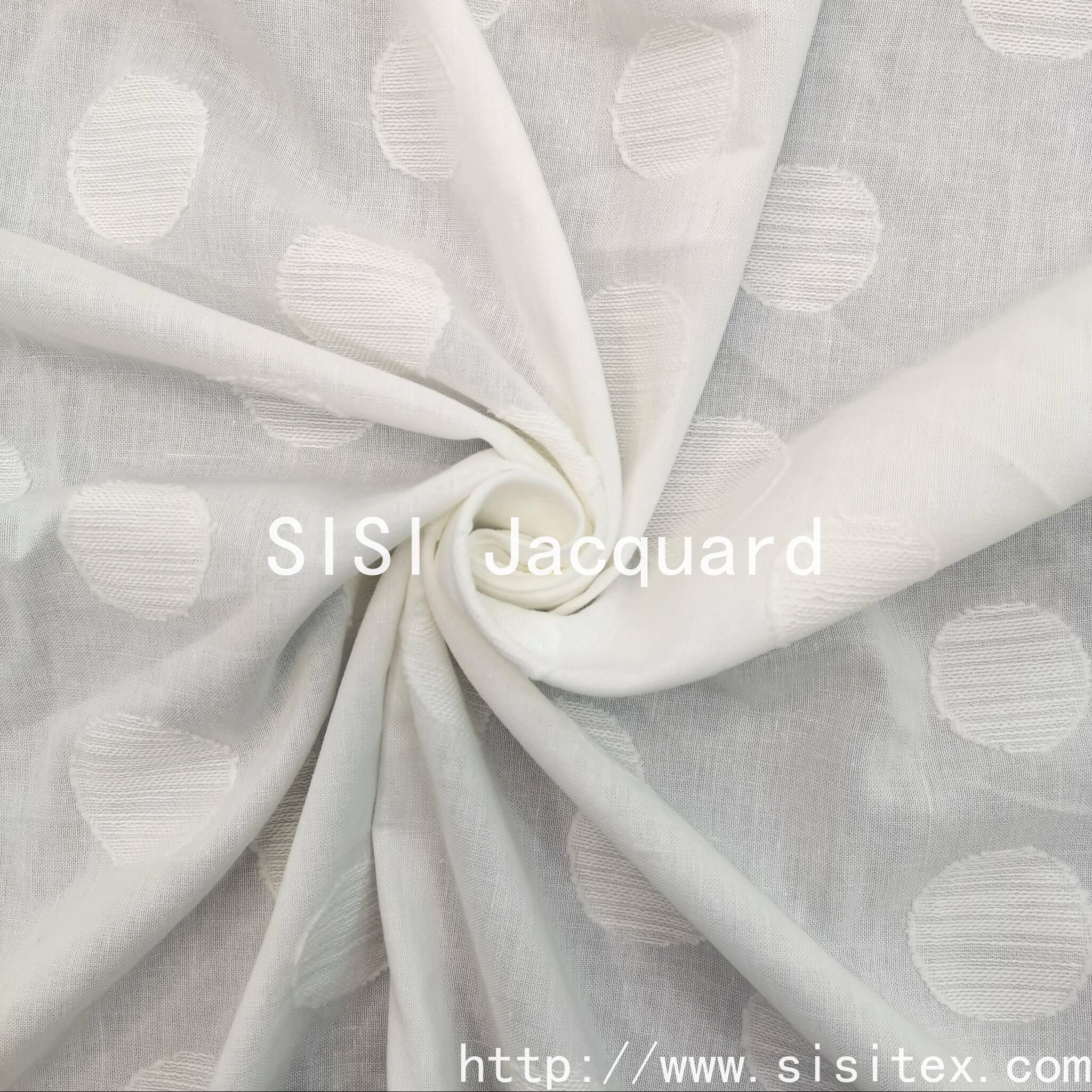 This product features the all-round circle jacquard printed fabric SS20028. It is made of 100% cotton. Firstly, a soft circular pattern is woven using the jacquard technique, and then, by the hands of skilled artisans, the precise cutting of the fabric is carried out to create each circle on the fabric, resulting in a charming relief texture. The cutting technique precisely cuts the local yarns on the basis of the jacquard pattern, creating a relief-like effect similar to a relief sculpture, perfectly echoing the revival of the "new artisan spirit". The circle, this classic geometric element, with its soft and smooth shape, finds a balance between retro and futuristic elements.