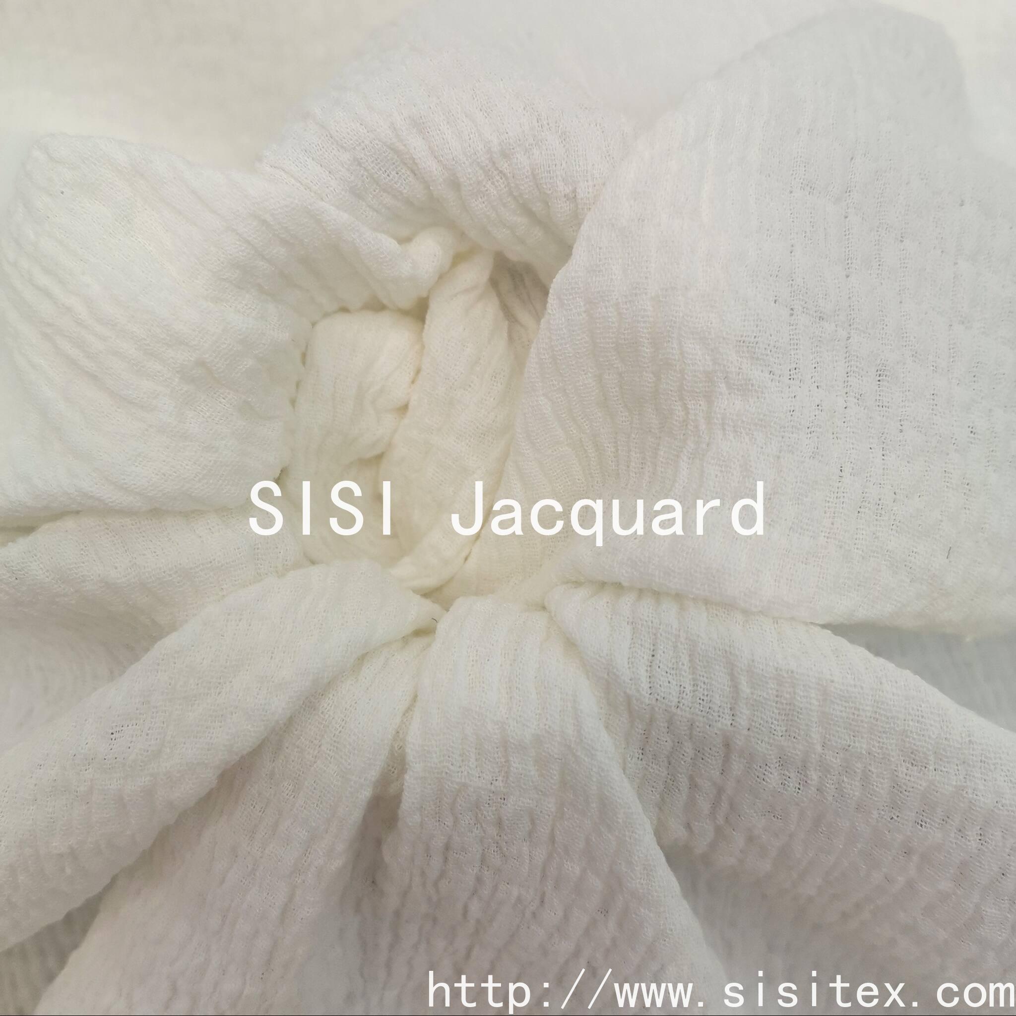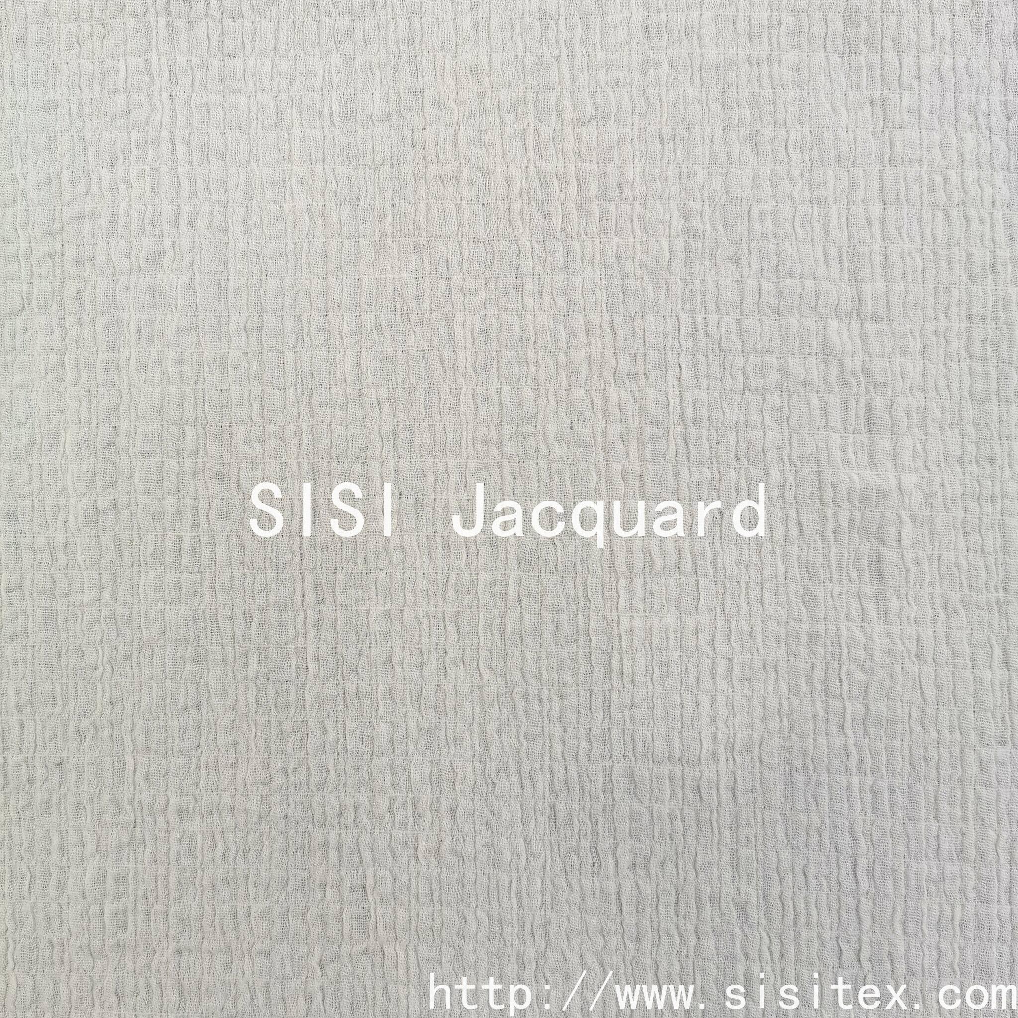 This product is a woven all-cotton stretch crepe fabric with double jacquard pattern SS18268. It is made with a perfect 97% cotton and 3% spandex ratio, integrating the texture of crepe fabric, the exquisite craftsmanship of double jacquard, and the comfortable experience of micro elasticity. The fabric has a soft and elastic feel, and the subtle wrinkles on the surface are the artistic touch left by time. The natural crepe fabric's natural wrinkles bring a casual artistic touch. The double jacquard technique gives the fabric different patterns or colors on both sides, offering a highly designed depth.
