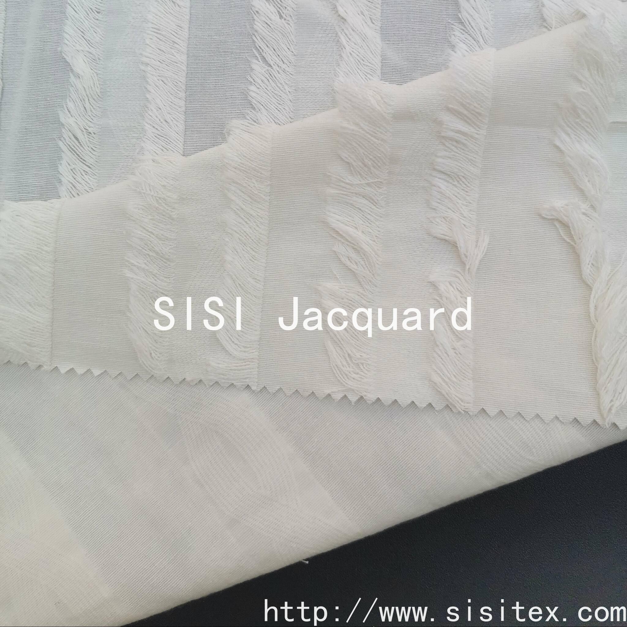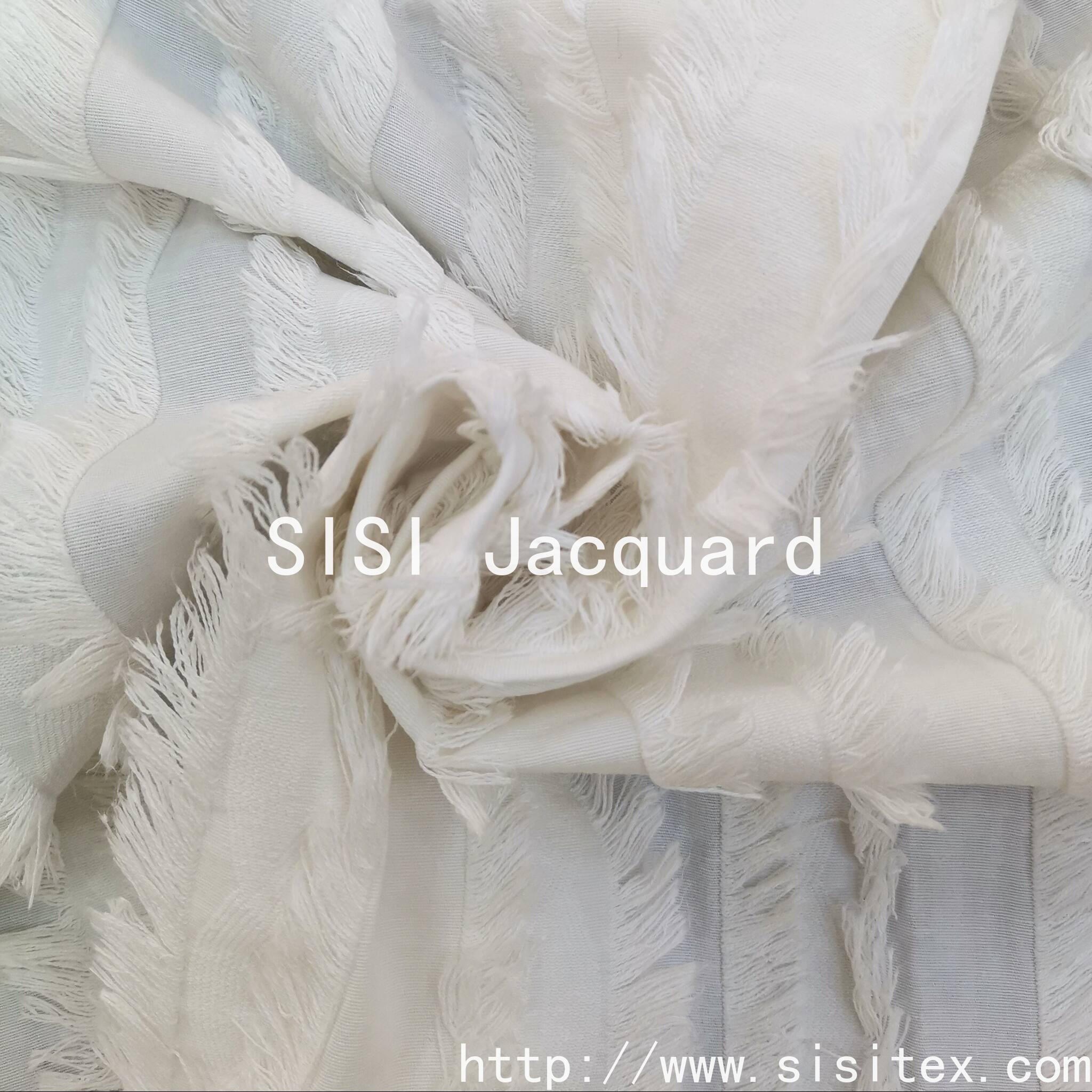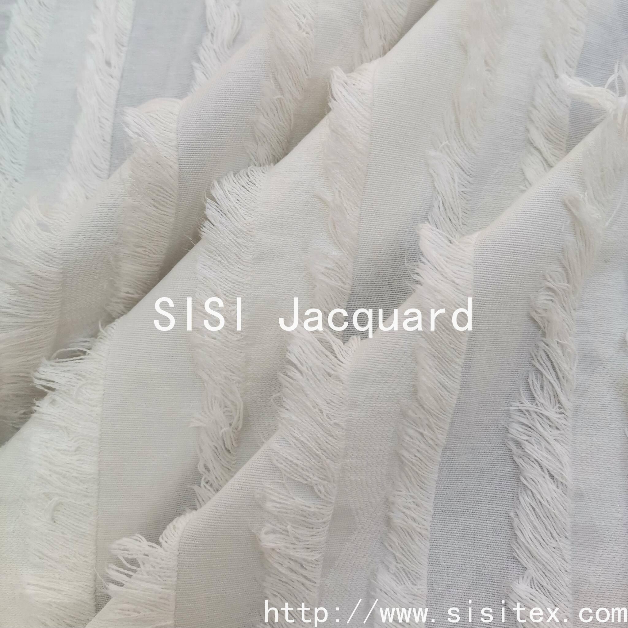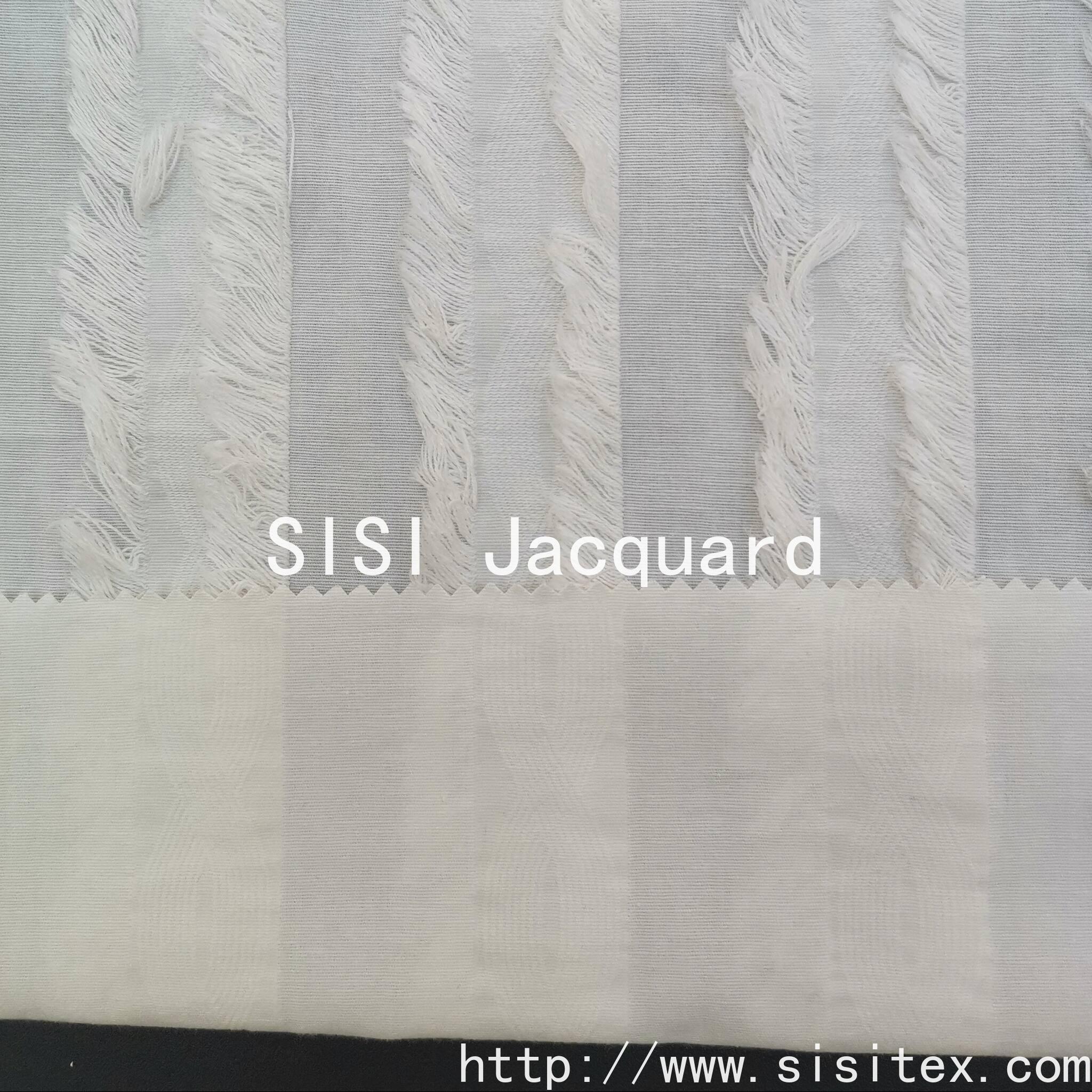 This product is made of all-cotton vertical stripe jacquard textured frill-patterned fabric, SS20110. It is 100% cotton. First, it is woven with a rational vertical stripe texture through the jacquard process, and then a precise frill-cutting process is carried out to allow the emotional and soft frills to naturally fall from the rational lines. The frill-cutting process forms a delicate touch like frills by precisely cutting the yarn, pushing the touchable romance and dynamic aesthetics to the forefront, perfectly meeting the pursuit of the high-end market for new artisanal spirit and sensory design. It is a response to the demand for top-quality fabrics that are both artistic, comfortable and environmentally friendly.