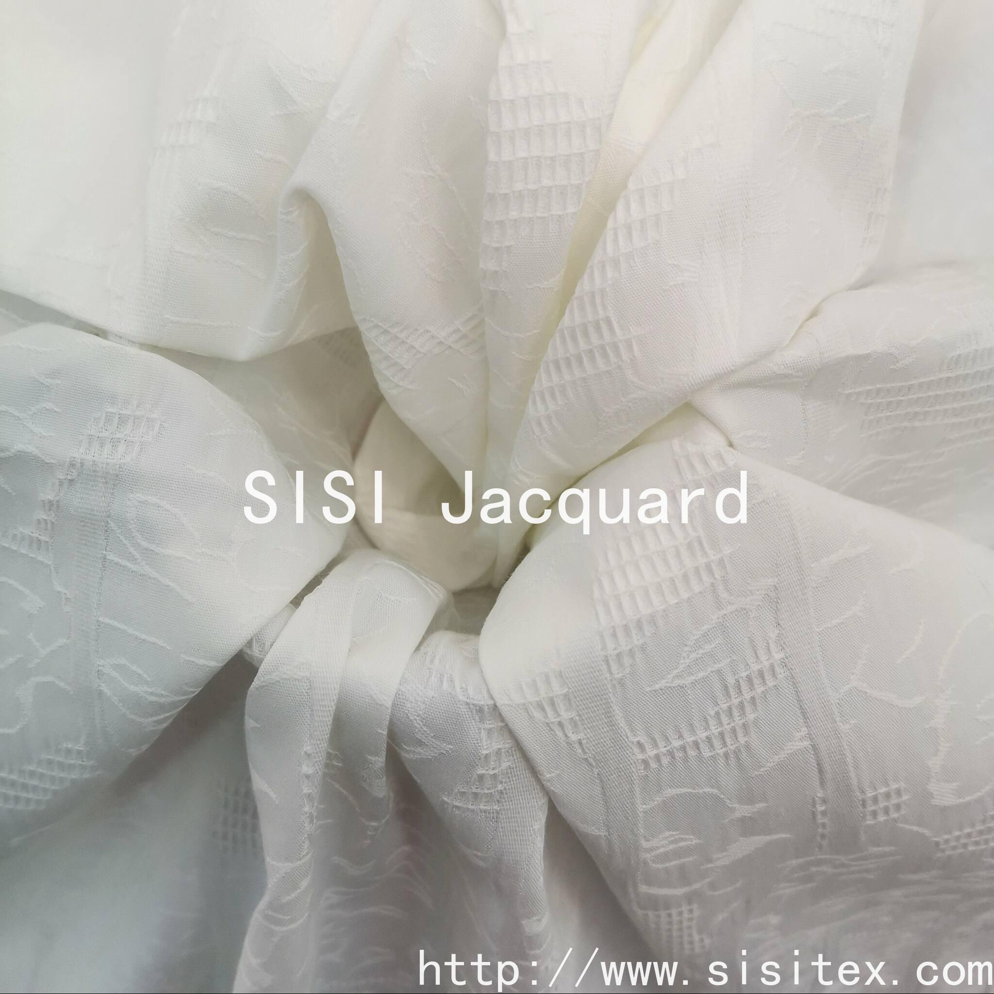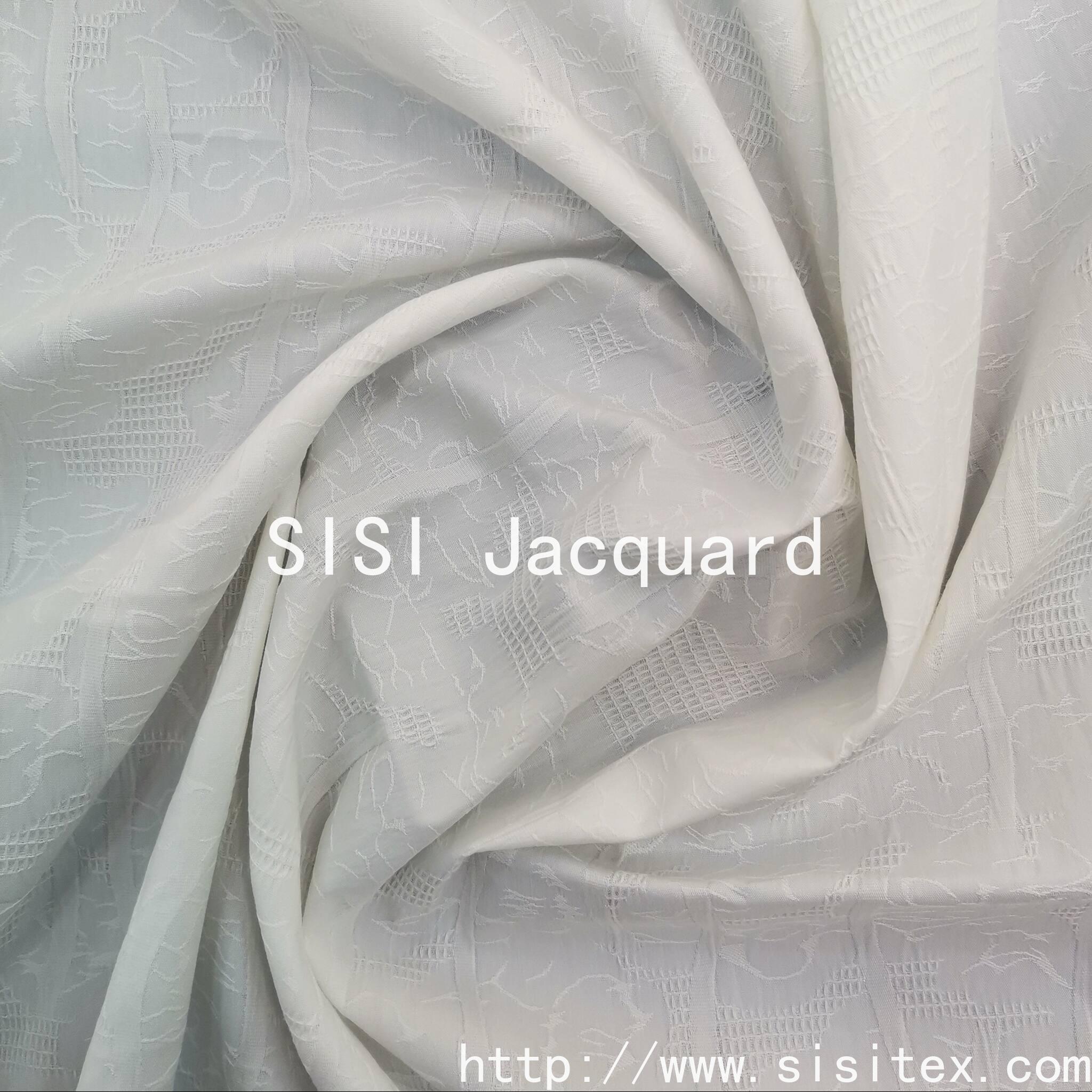 The product is made of Si Si brand cotton and polyester mesh jacquard fabric, which is a fine-spun interweaving of 76% cotton and 24% polyester. It combines the softness and comfort of cotton with the elasticity and durability of polyester, presenting a delicate and three-dimensional mesh texture and plant jacquard pattern. The fabric is lightweight and resilient, with a smooth hand feel, and it has both a natural texture and excellent physical properties. It is suitable for creating clothing and home products that combine a retro charm with modern functionality.