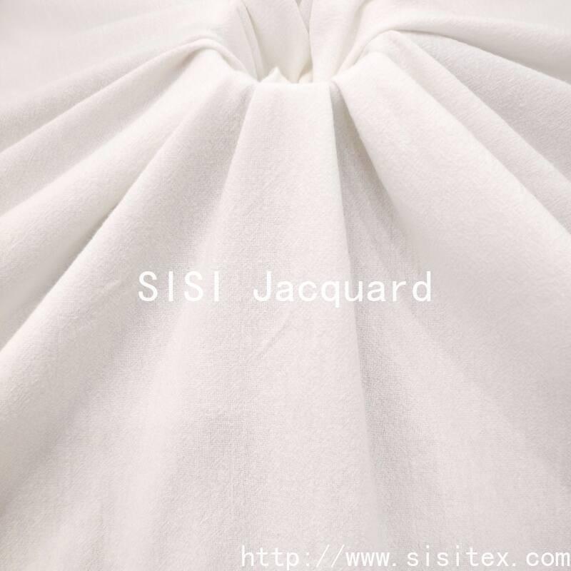 This product is made of 100% cotton 2060 double crepe washed cotton fabric. It is woven with a 20*20 yarn count and a 60*60 density, combined with a strong twisting process, resulting in a natural double crepe texture. The fabric has undergone water washing treatment, giving it a soft feel and a slightly natural crease on the surface. The weight is 145g/m³, the width is 130CM, and the texture is dense and elastic. The color is classic white, simple and clean, with a strong Korean-Japanese style. It is suitable for making shirts, suits, halter tops, dresses and other types of clothing. It is a high-quality fabric that combines comfort and fashion.