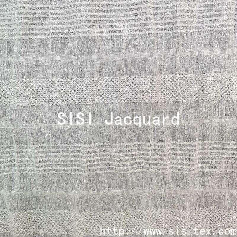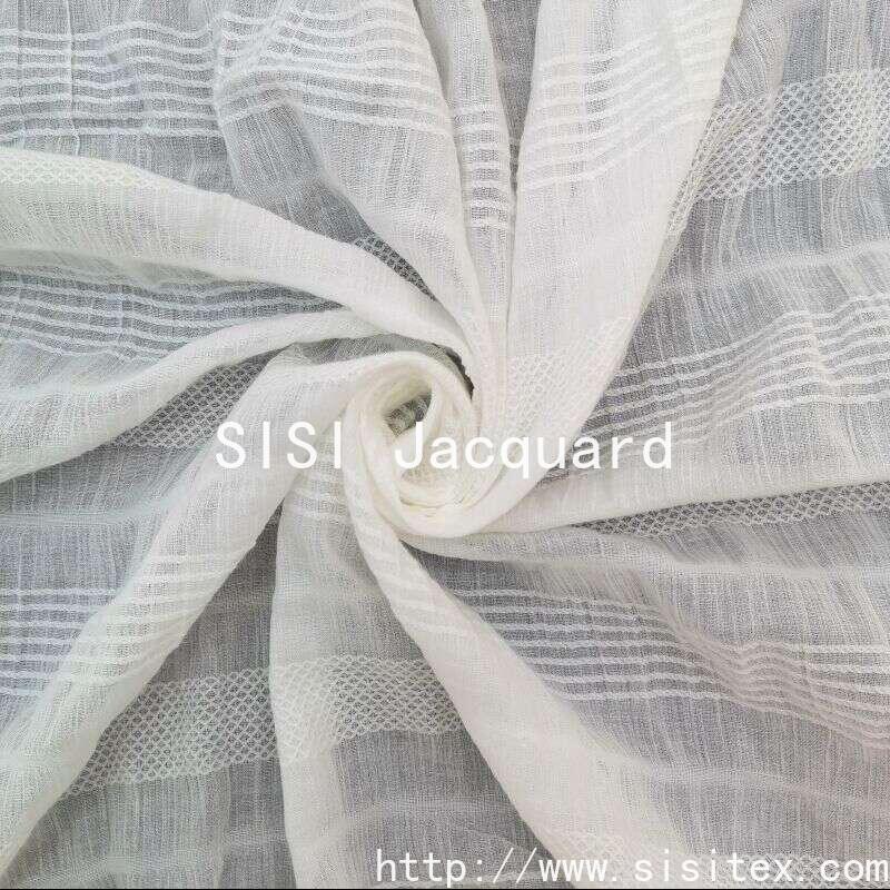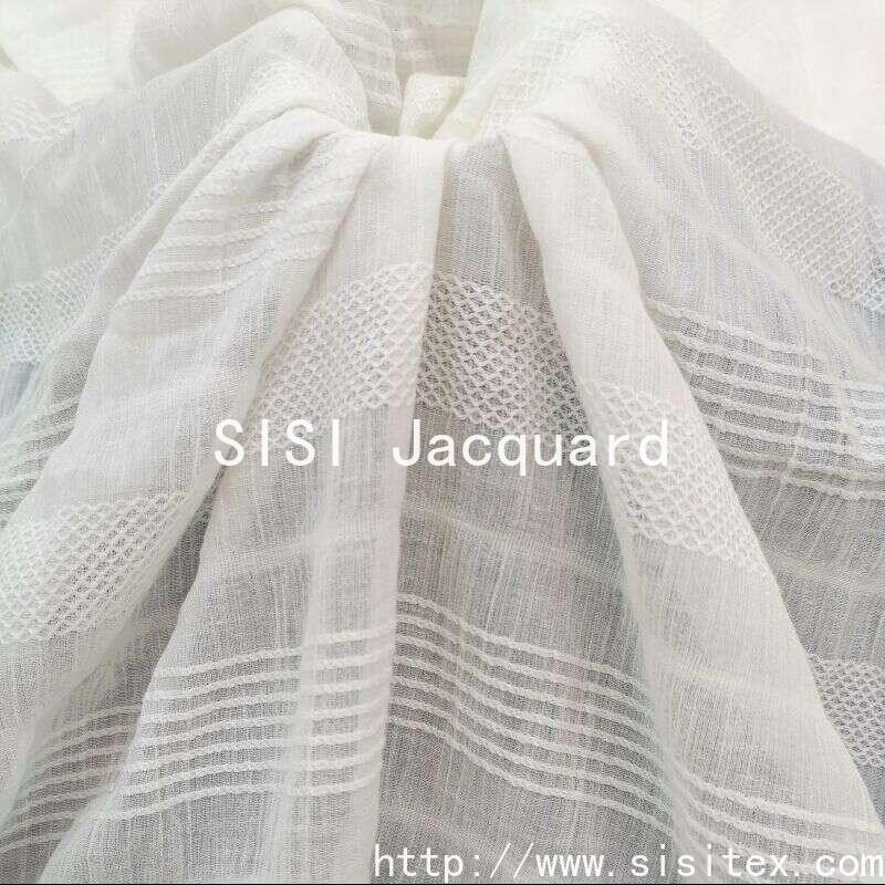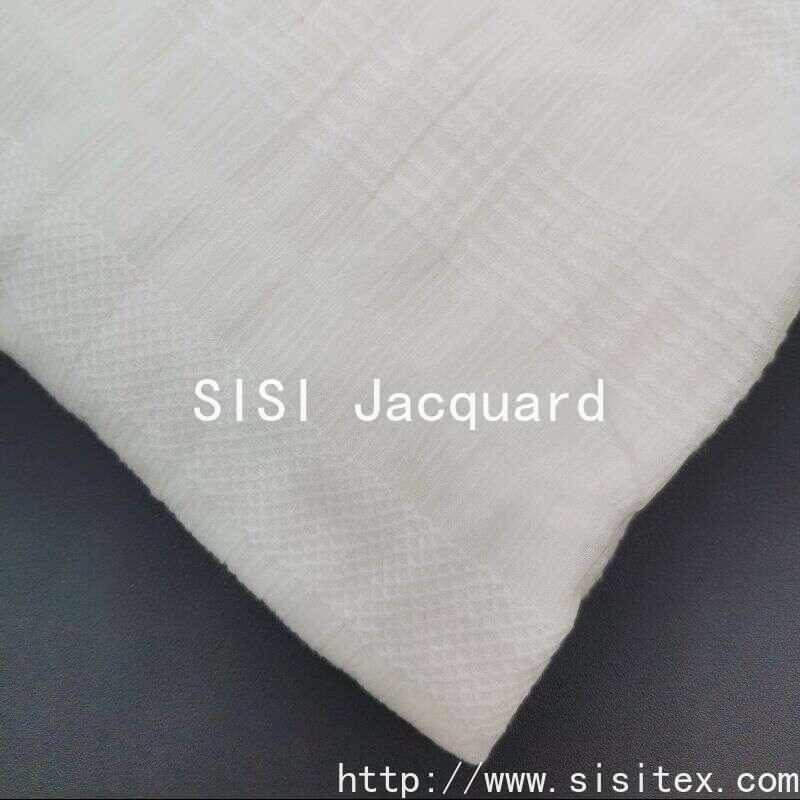 This product is from the "Silk Twill" brand. It is made by blending high-count high-quality cotton yarn (97% cotton + 3% spandex) together. The yarn count is J60*60 + 40/2. The fabric combines the natural skin-friendly properties of pure cotton with the flexibility and elasticity of spandex. Through a meticulous jacquard weaving process combined with jacquard technology, the fabric presents a delicate and detailed pattern texture, creating a subtle three-dimensional texture and lightness of shadow and gradation. The density is 81*65, with a lightweight and flexible texture, a weight of 90g/m³, being light, breathable and having good elasticity. It comfortably wraps the body without being tight. The pure white base color and the fine jacquard complement each other, presenting a simple yet detailed modern design sense.