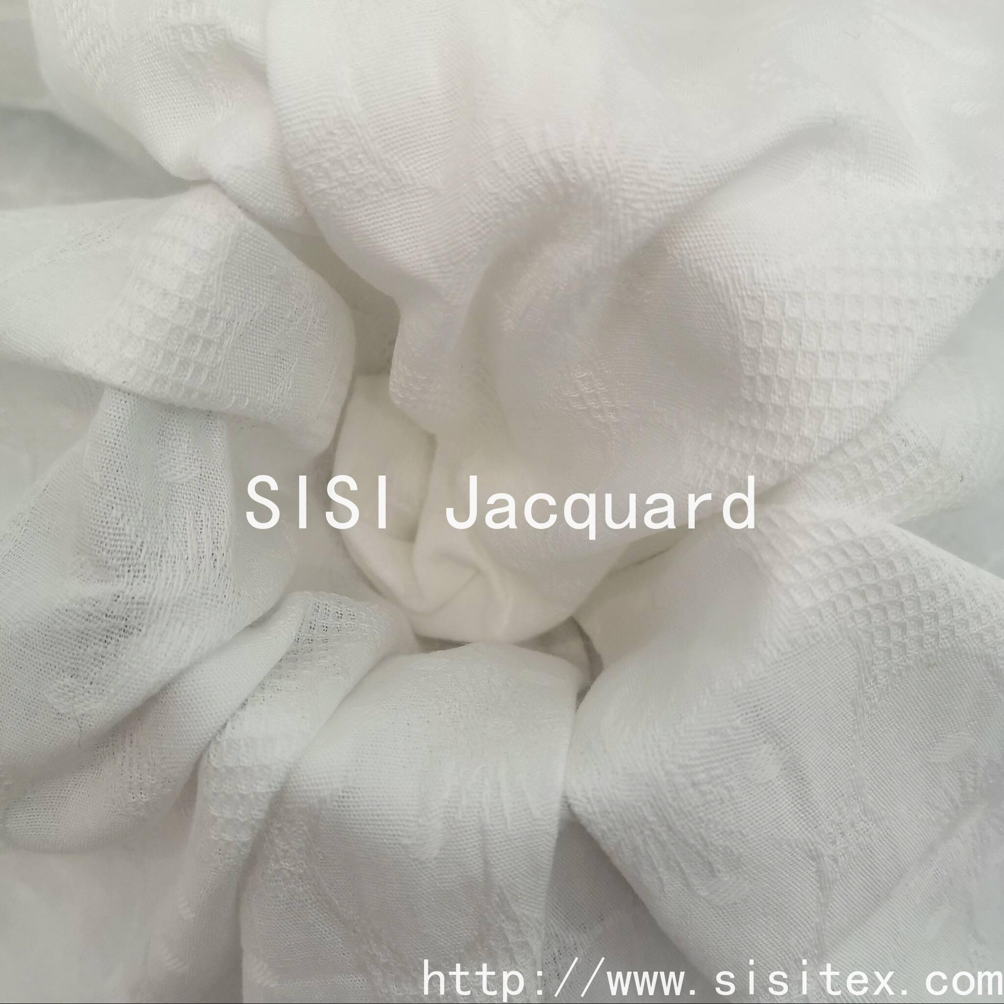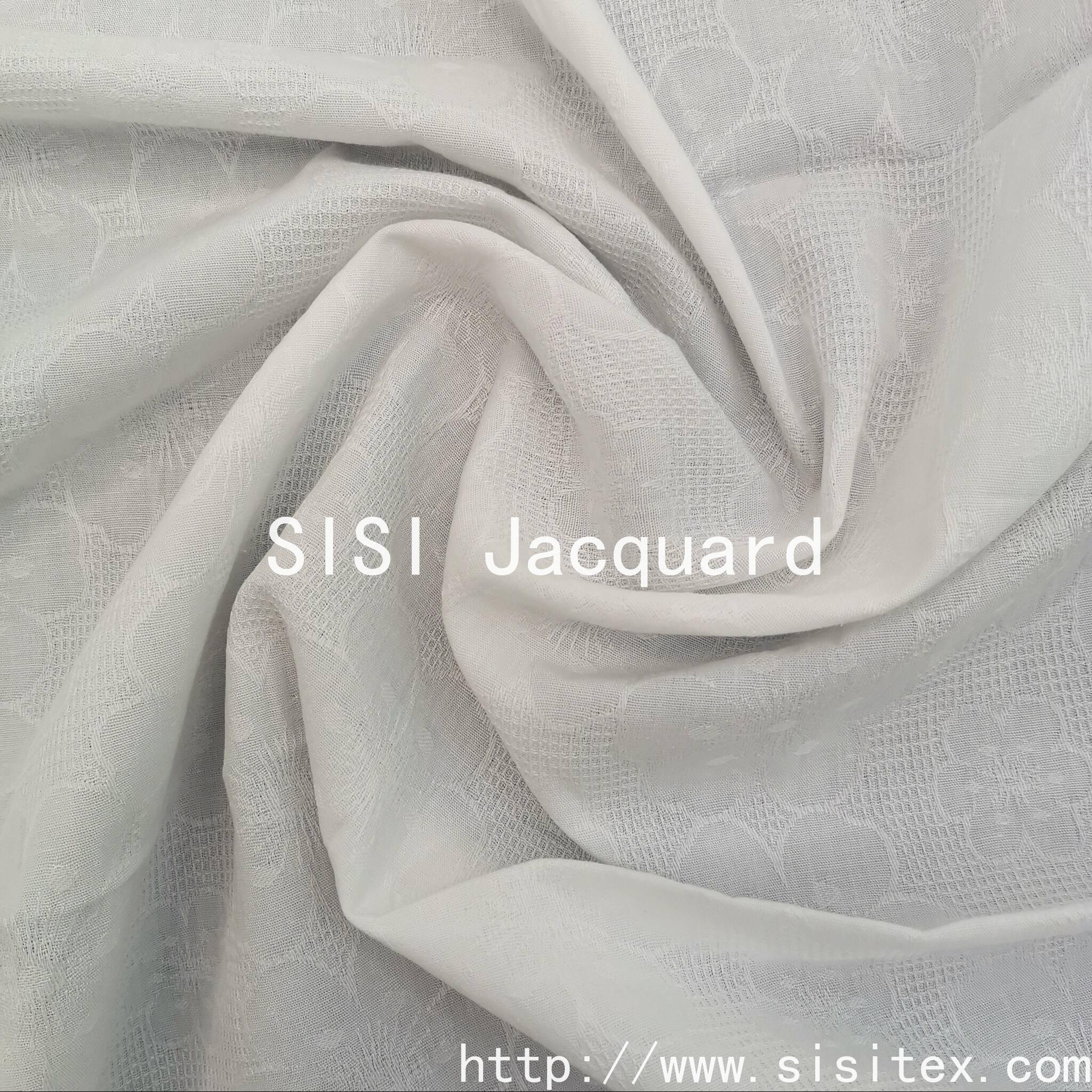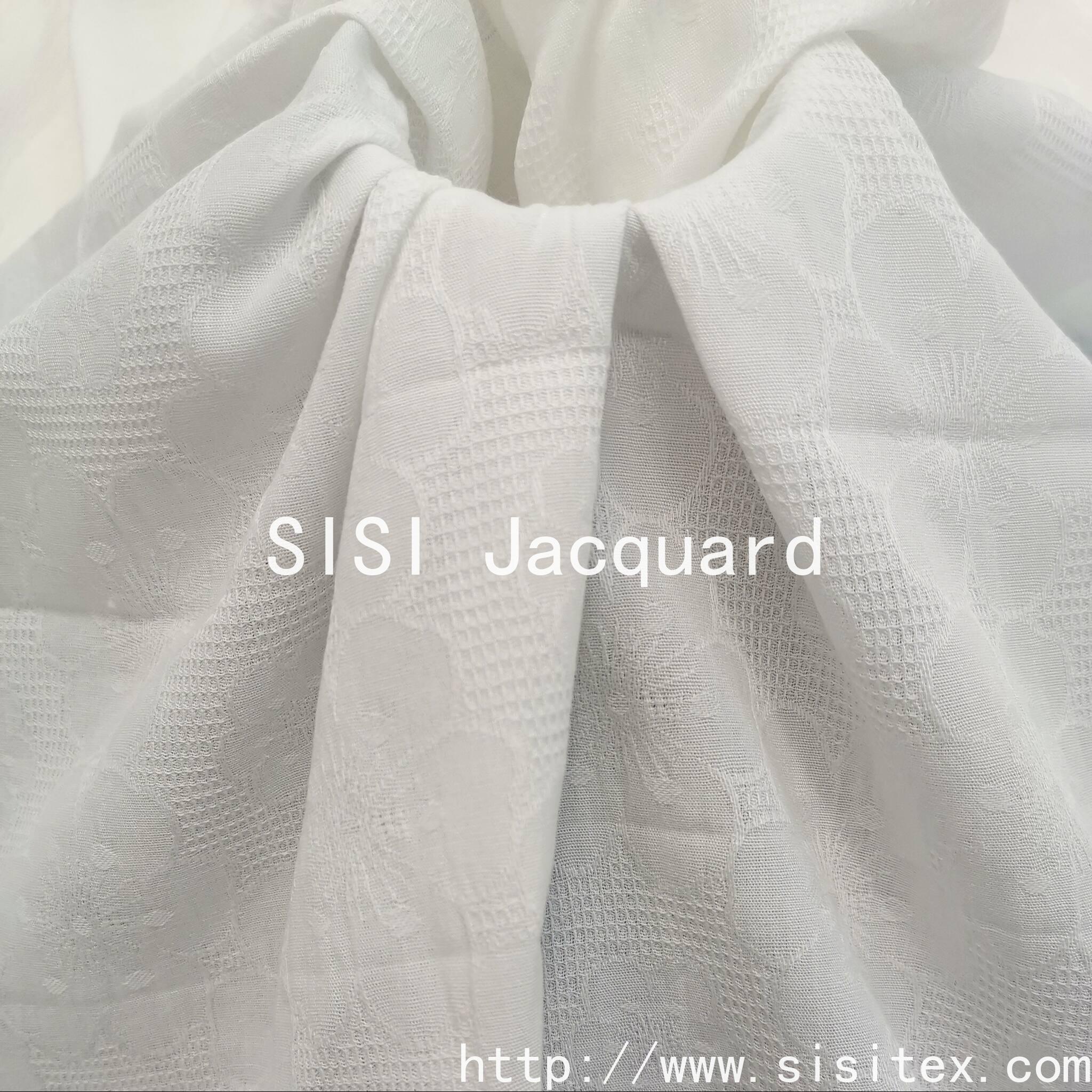 This product is produced by the brand "Silky Jacquard". It is made of 100% pure cotton. The yarn count is 40*28, which is solid and of good texture. The fabric uses a combination of grid structure and flower jacquard. On the delicate geometric grid background, exquisite flower patterns are scattered, creating a rich layering effect. The density is 116*55, and the weight is 120g/m². The feel is soft and firm, with both the skin-friendly breathability of cotton and moderate drape. The pure white base color highlights the retro aesthetics and delicate flower patterns. The overall style is elegant and detailed, suitable for the design of various clothing and home products.