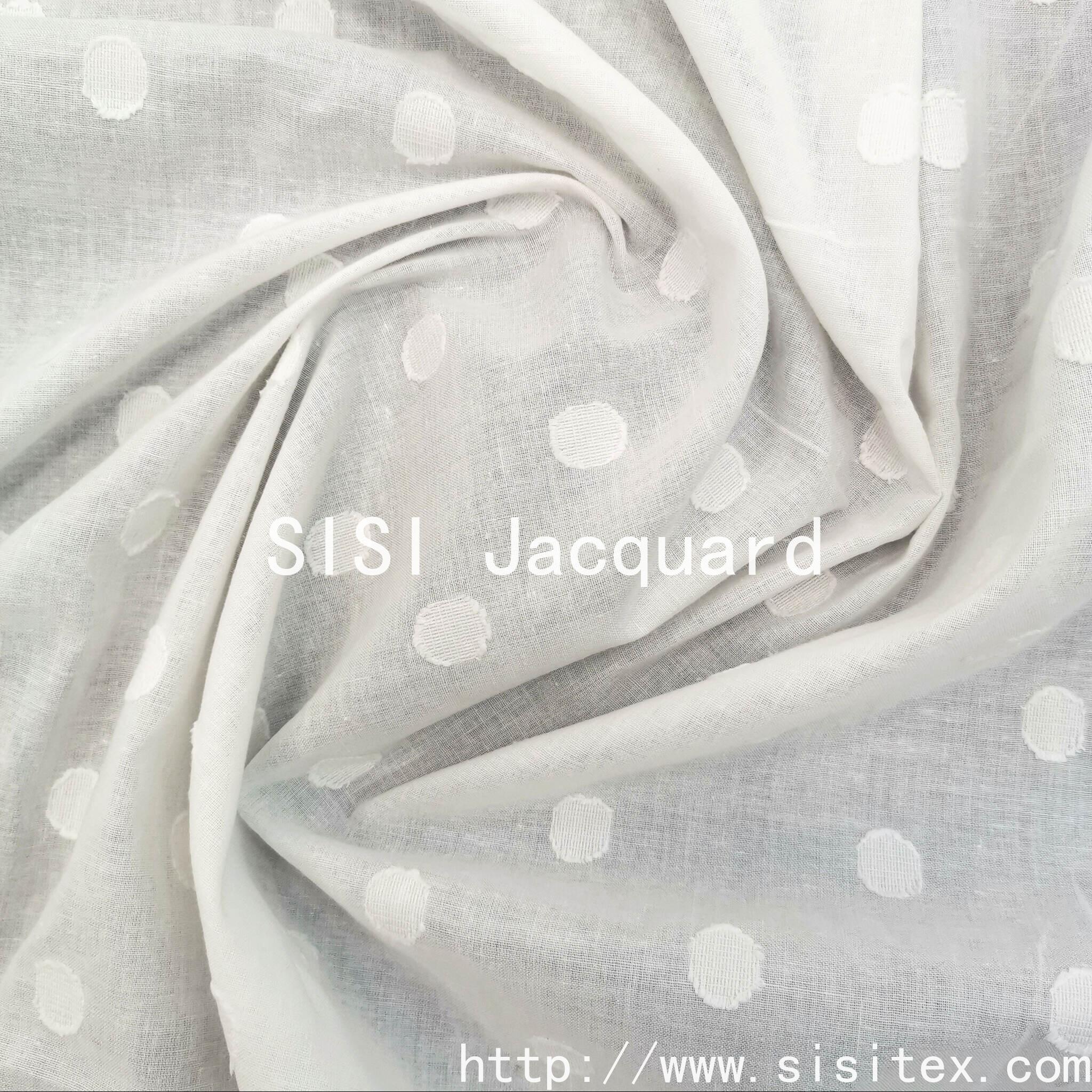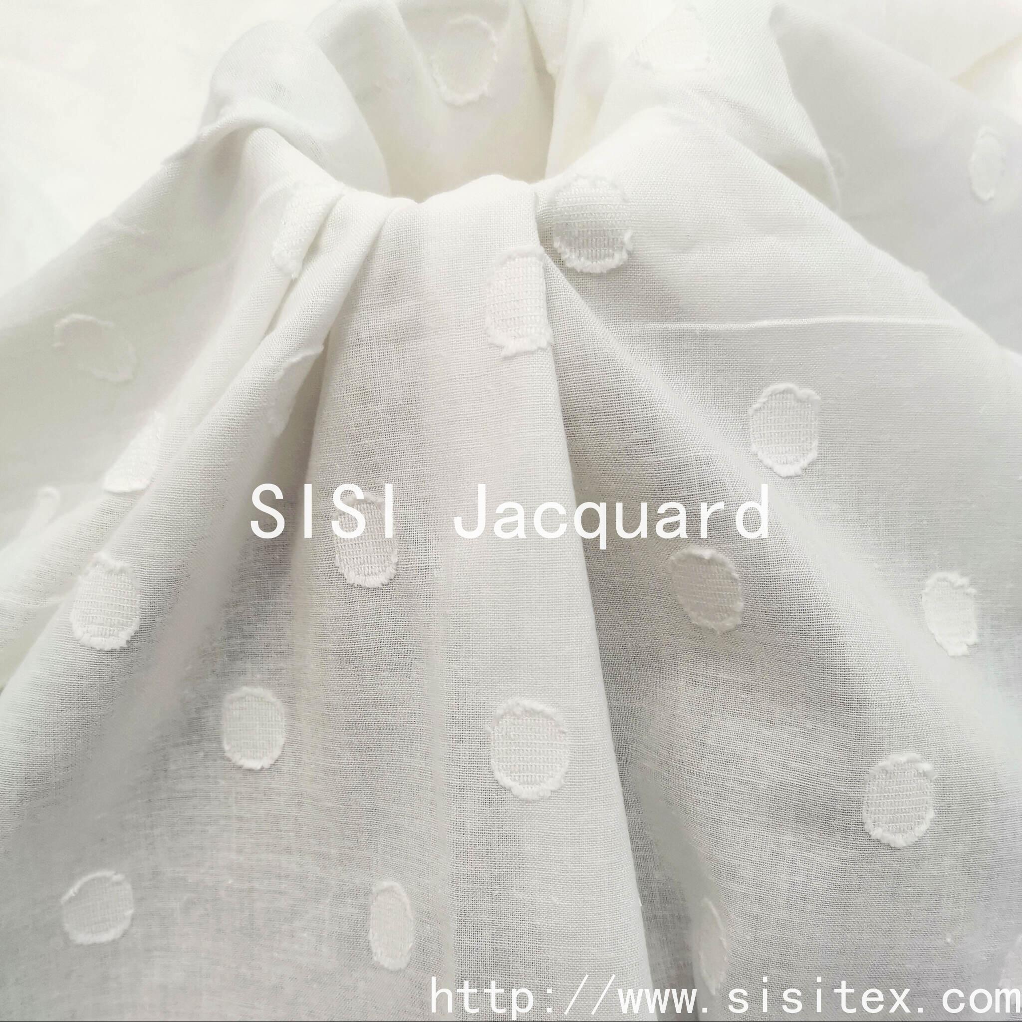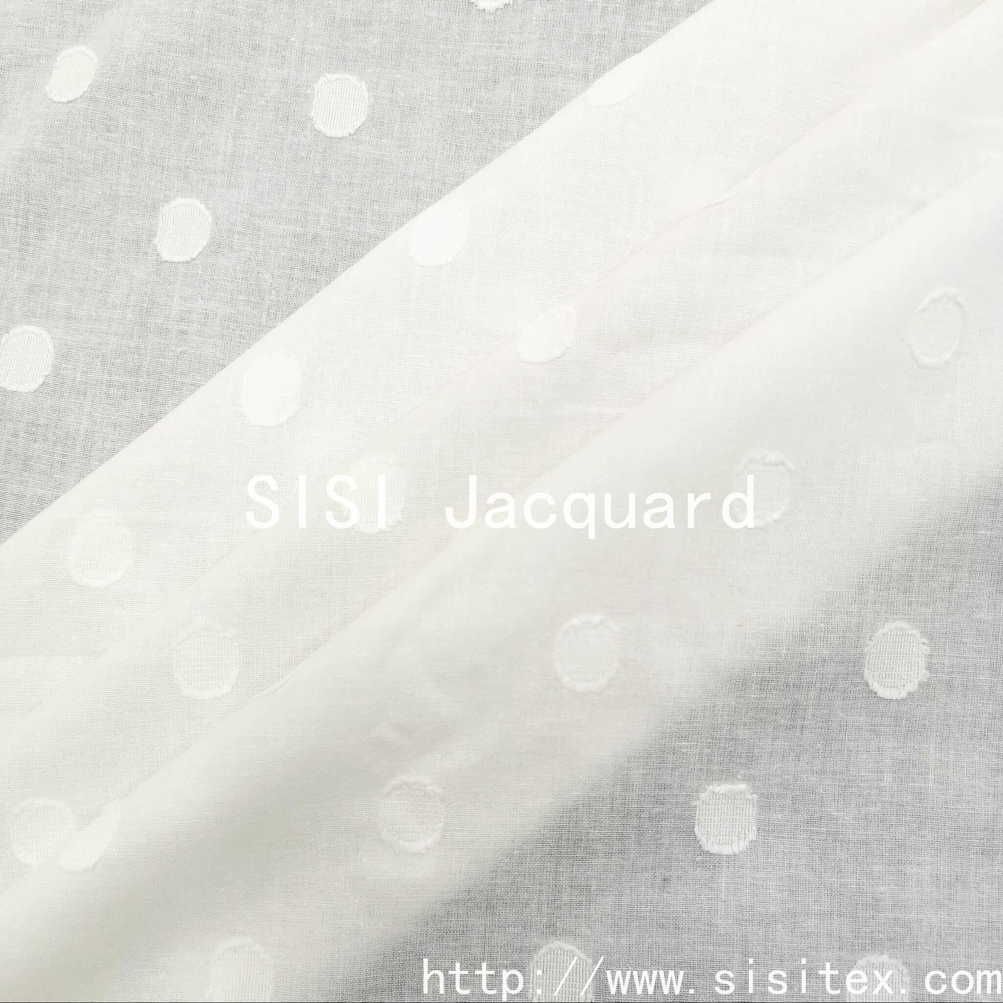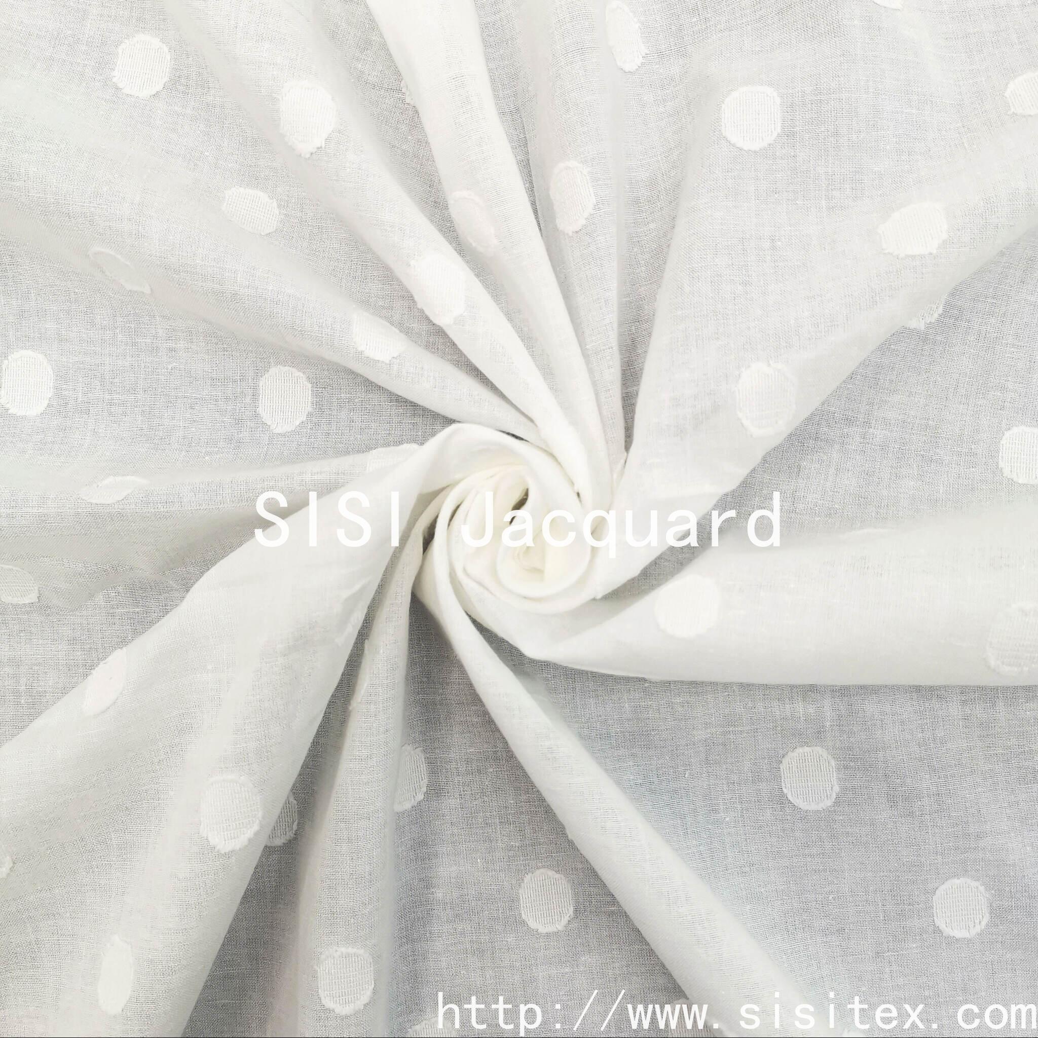 This all-cotton circular jacquard printed fabric is themed around "wildflower geometry". It originates from the fine jacquard weaving and is made of 100% cotton. The yarn count is 40 + 21/2 × 40, the density is 87 × 70, and the weight is 86g/m². It is lightweight, soft, and has good breathability and drape. Through the combined process of printing and jacquard weaving, it forms a texture that integrates geometric circles with "wildflowers". The patterns are arranged in a staggered manner, carrying a touch of romantic and natural charm. This fabric is available in a simple and elegant white color, and also supports customization in colors. It is suitable for various designs in a fresh, artistic, and modern style.