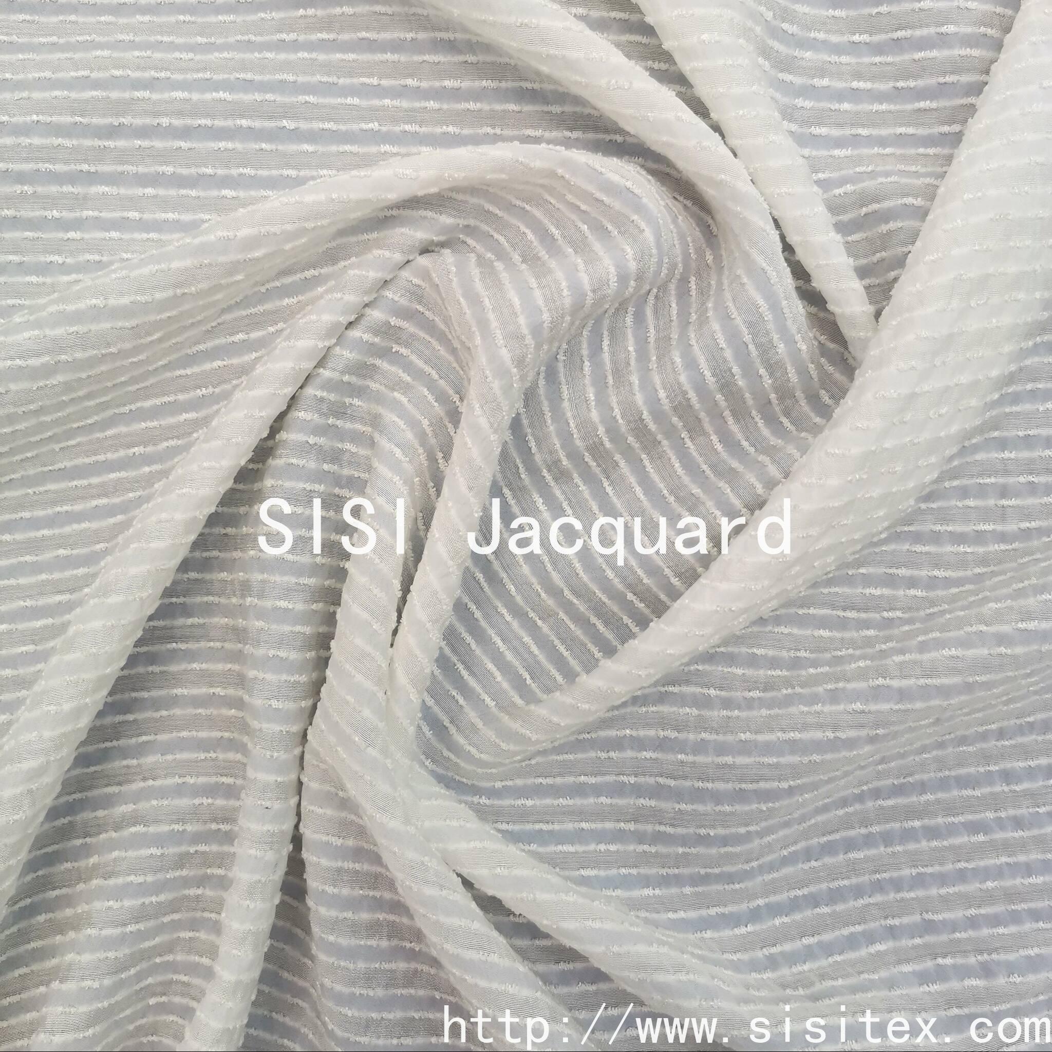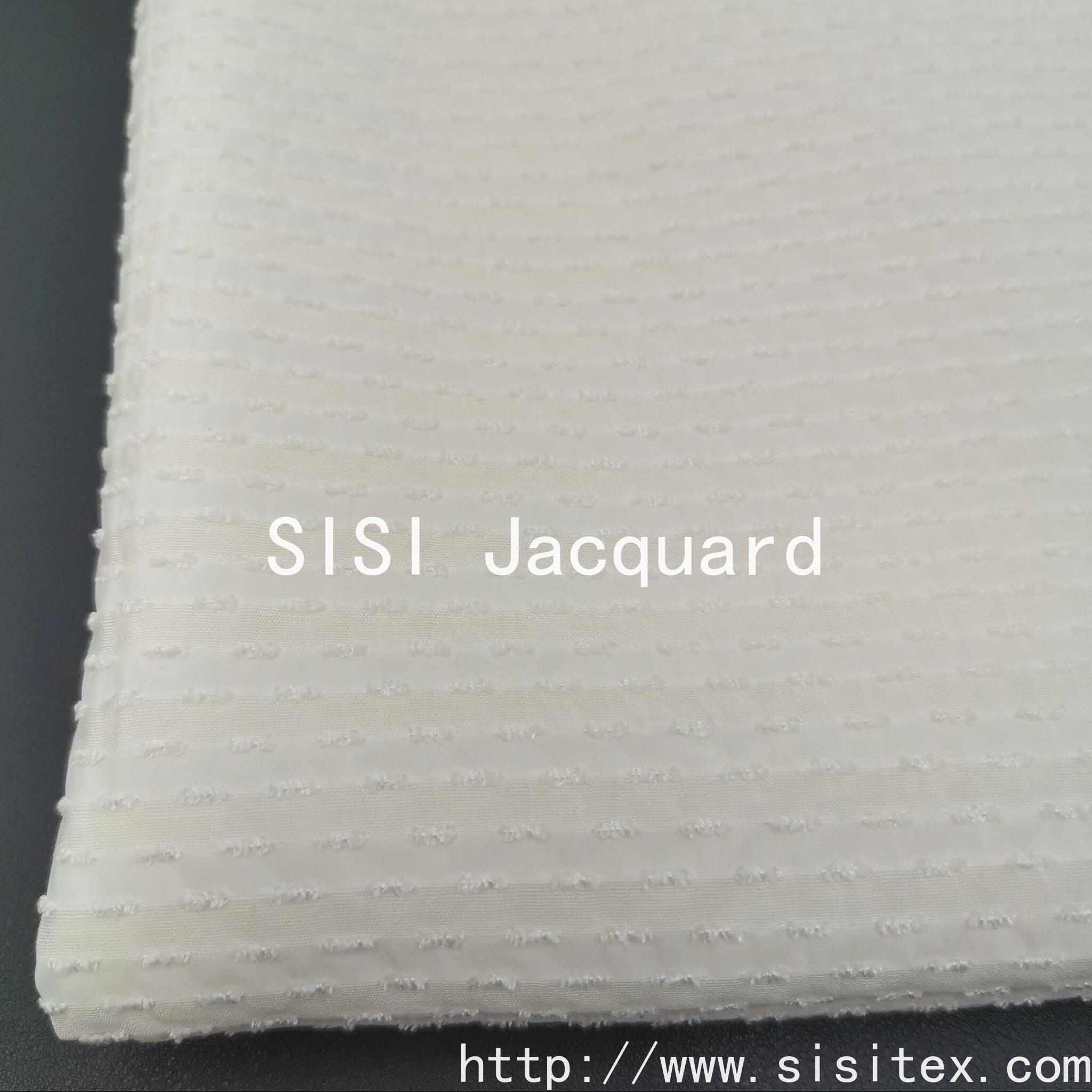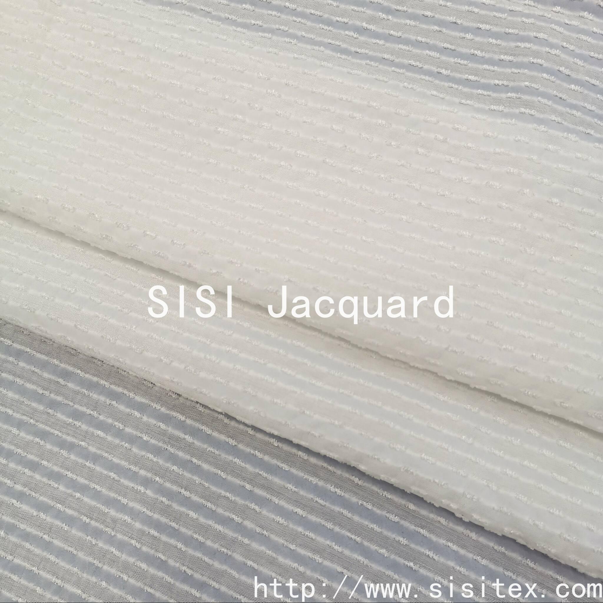 This woven satin jacquard textured fabric is from "thread jacquard" and is made by blending 71% cotton and 29% nylon. It is woven using a high-density 147*80 weaving process, giving the fabric a fine and compact structure. The design combines horizontal stripes and "wildflower" geometric jacquard elements, creating an alternating pattern of light and shadow, with a slightly three-dimensional texture and a dreamy aesthetic. The weight is 100g/m³, and the texture is lightweight and smooth, combining the skin-friendly breathability of cotton with the flexibility and resilience of nylon. The pure white base color highlights the delicate combination of the flower pattern and stripes, presenting a fresh and natural, breathing-inspired design style in the Japanese-Korean style.
