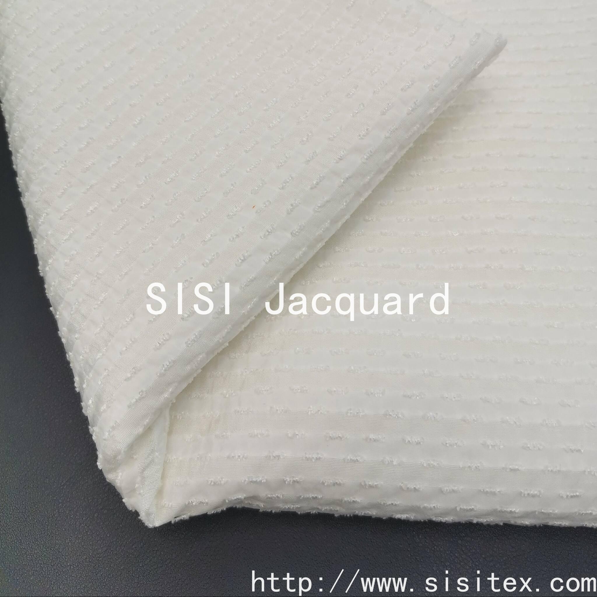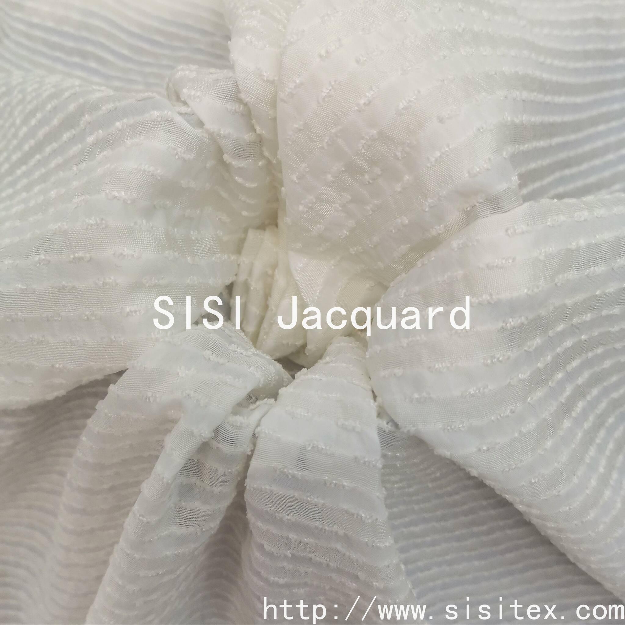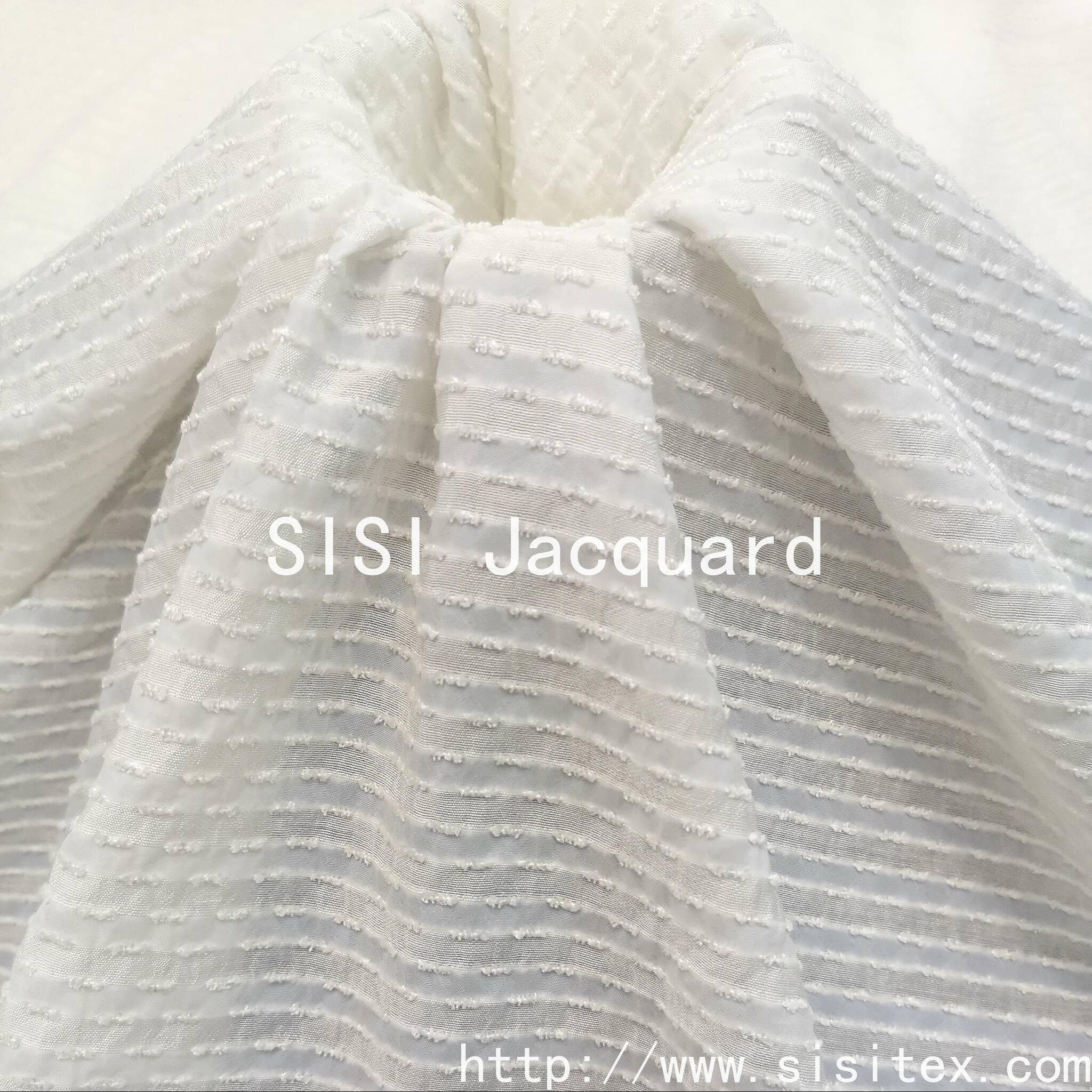 This woven satin jacquard textured fabric is from "thread jacquard" and is made by blending 71% cotton and 29% nylon. It is woven using a high-density 147*80 weaving process, giving the fabric a fine and compact structure. The design combines horizontal stripes and "wildflower" geometric jacquard elements, creating an alternating pattern of light and shadow, with a slightly three-dimensional texture and a dreamy aesthetic. The weight is 100g/m³, and the texture is lightweight and smooth, combining the skin-friendly breathability of cotton with the flexibility and resilience of nylon. The pure white base color highlights the delicate combination of the flower pattern and stripes, presenting a fresh and natural, breathing-inspired design style in the Japanese-Korean style.