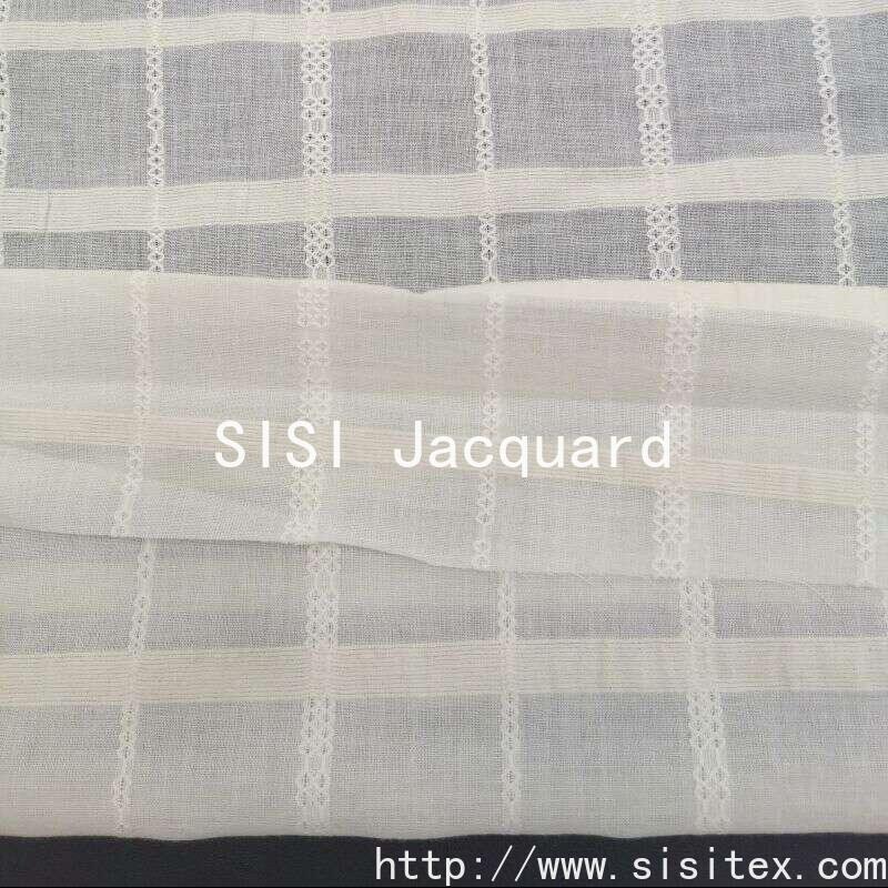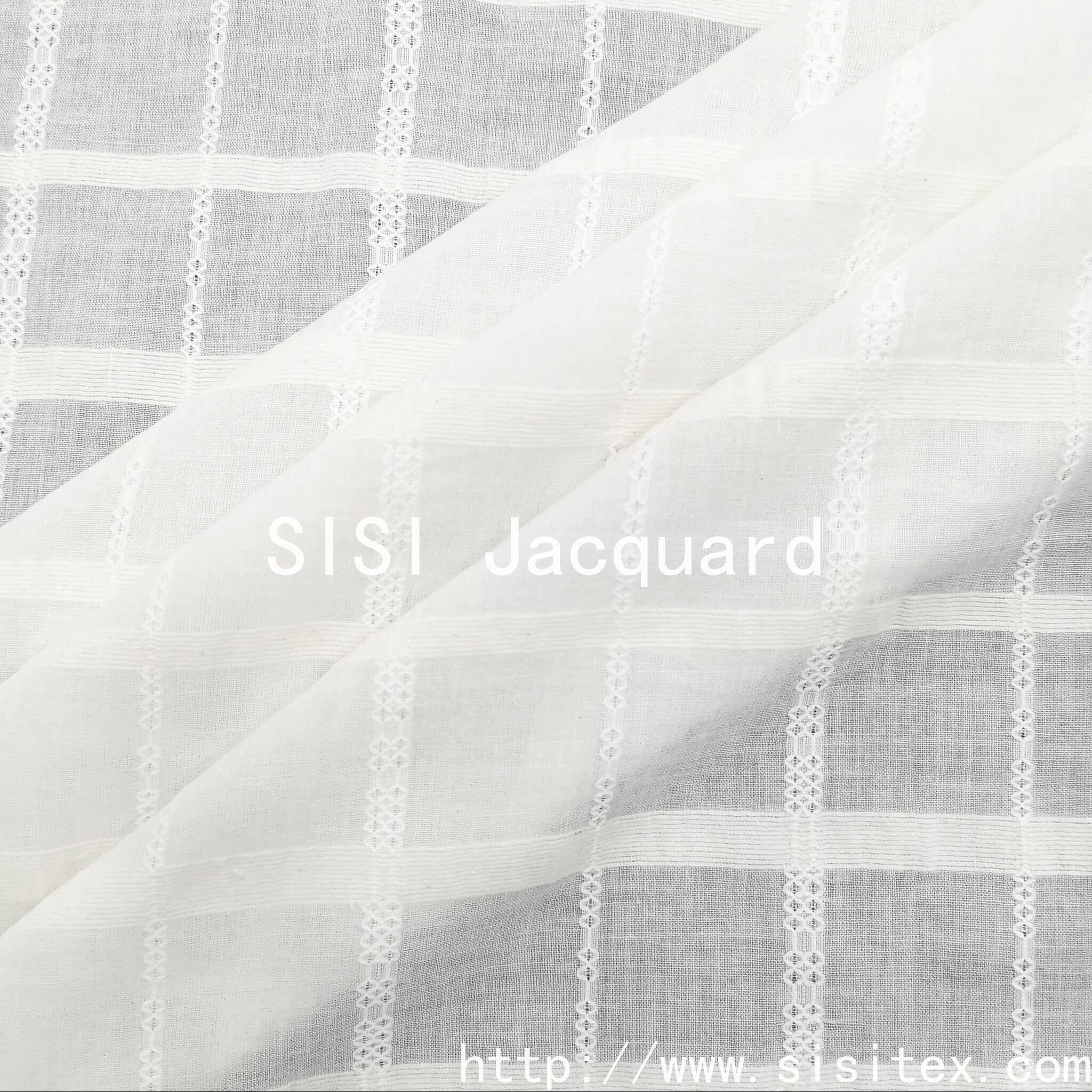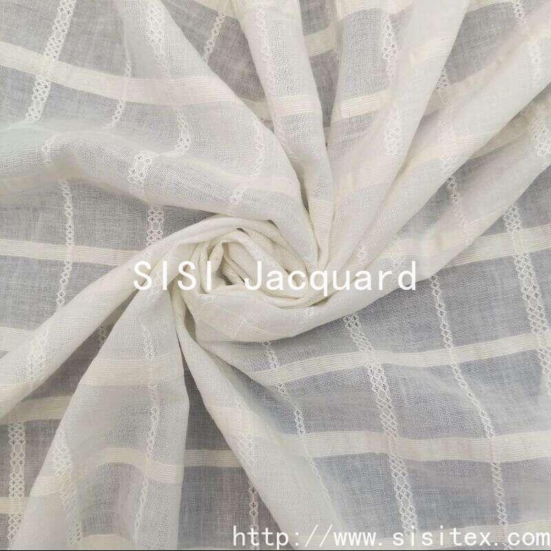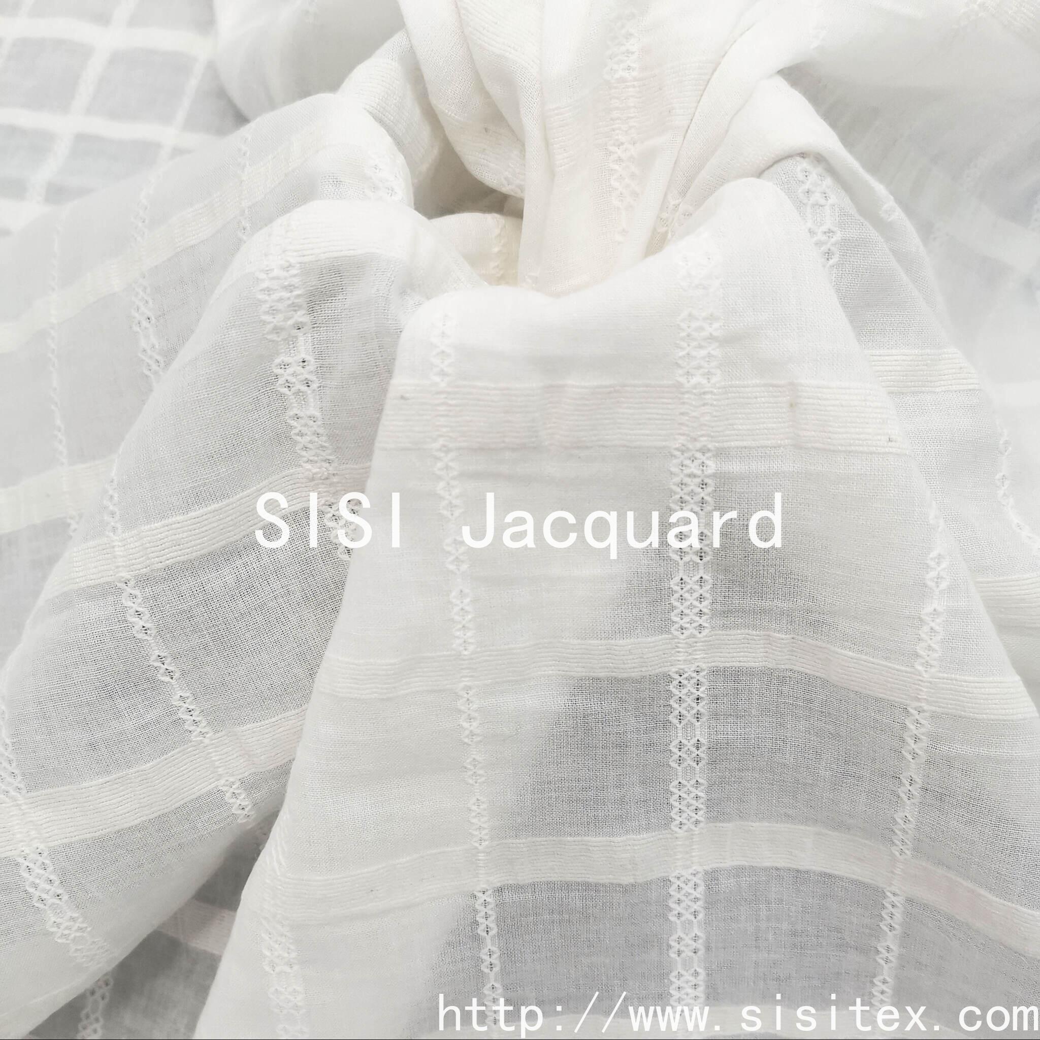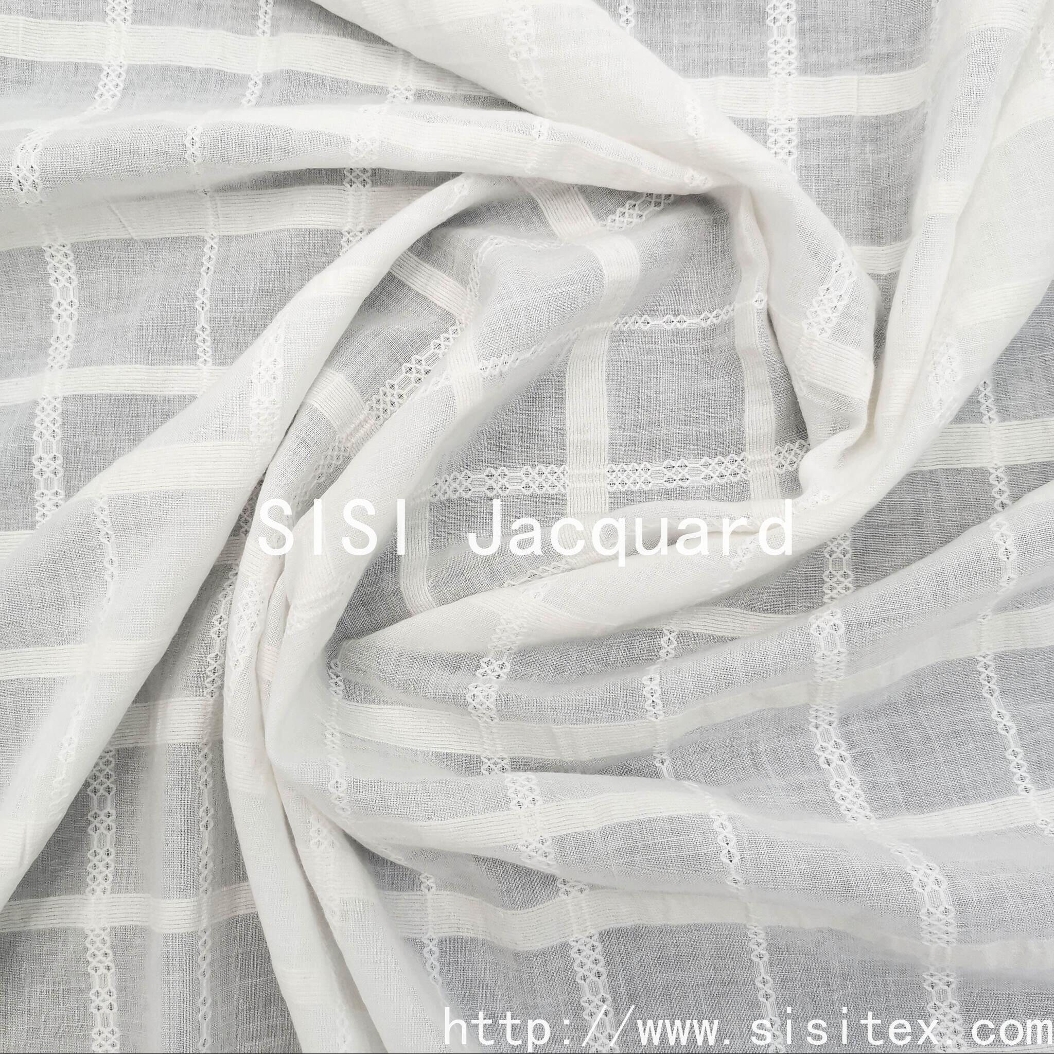 This all-cotton gauze jacquard fabric is from "Silky Jacquard". It is made of 100% pure cotton and is woven with 60+40/2×60+10 yarn counts. By combining traditional gauze weaving techniques with geometric square jacquard patterns, it presents a texture with both voids and solids, giving a breathing-like feel. The density is 80×68, which is moderate, with a stable structure and good breathability. The weight is 100g/m², and the texture is soft and has a certain graininess, while also having the natural skin-friendly properties of cotton and the unique micro-transparency layers of gauze. The pure white base color highlights the three-dimensional and regular square patterns, giving an overall style that is fresh and natural, with an aesthetic quality reminiscent of the relaxed and transparent, simple yet not simplistic style of Japanese and Korean fashion.