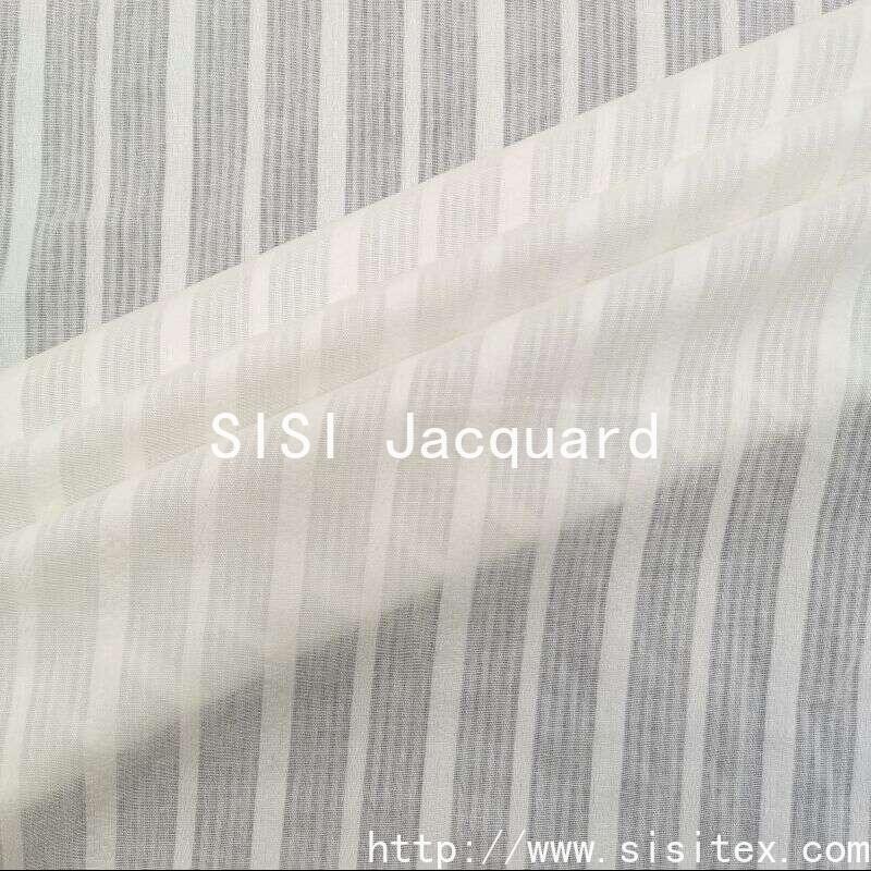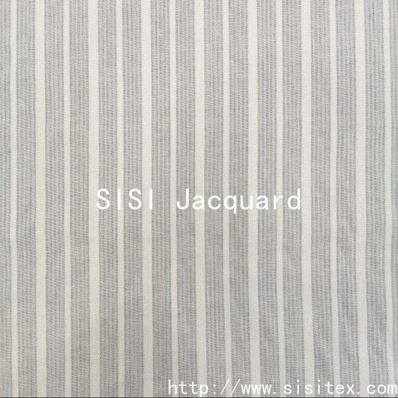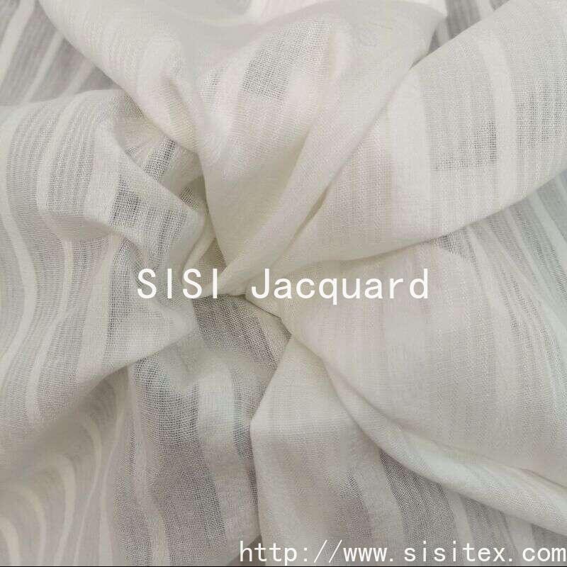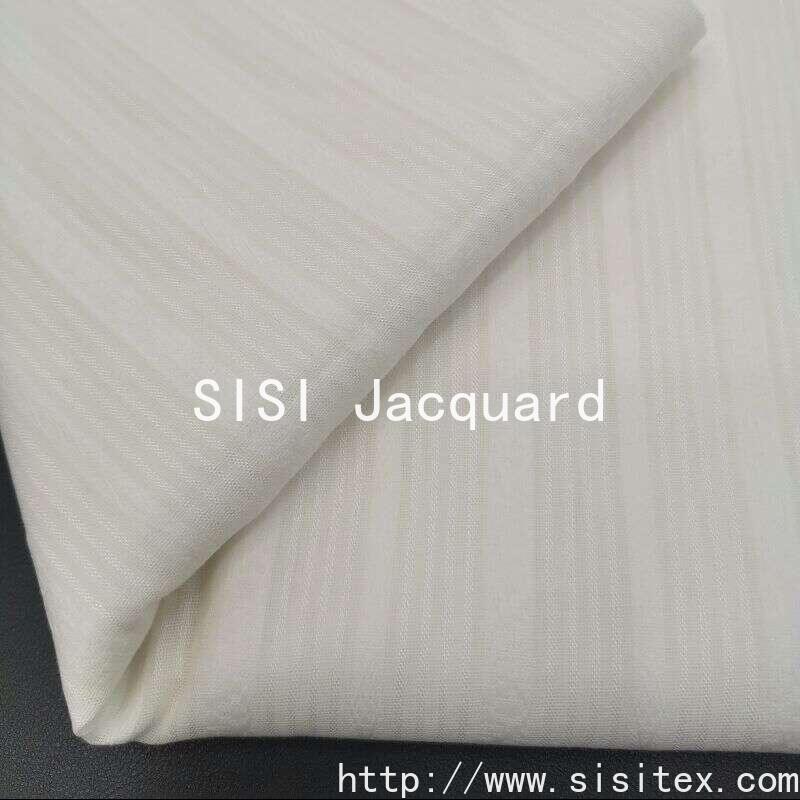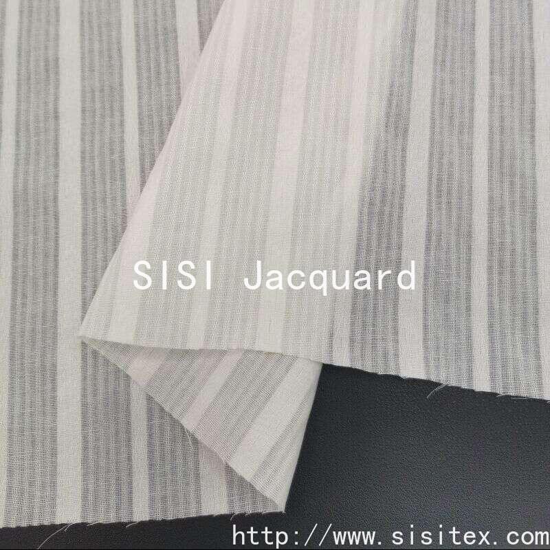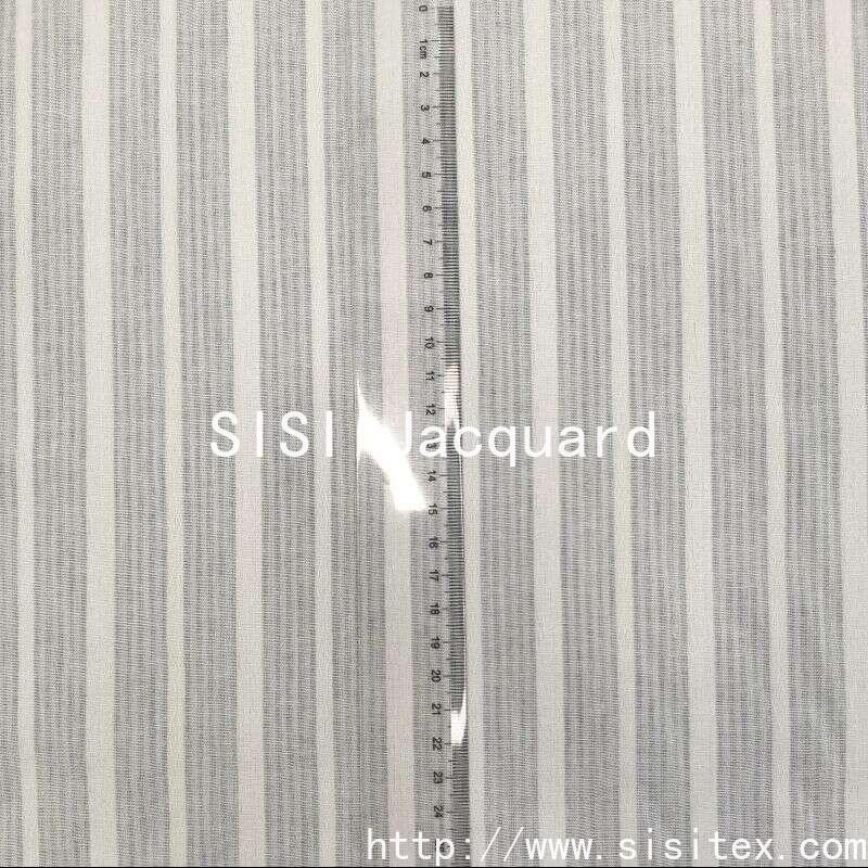 This product is made by blending 95% cotton with 5% human cotton (viscose fiber). It is woven using a geometric jacquard technique to create alternating wide and narrow vertical stripes, with a clear and rhythmic texture. The yarn count is 60 + 32R + 60/2*32, the density is 115×48, the weight is 94g/m³, and the width is 145cm. The fabric combines the softness and breathability of cotton with the smoothness and luster of human cotton. It is lightweight and stiff, with a simple yet varied stripe design, making it suitable for creating spring and summer clothing that combines a casual feel with design details.